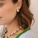 - 24k antique gold plated rectangular earrings set with an emerald cut crystal on stainless steel hypoallergenic posts