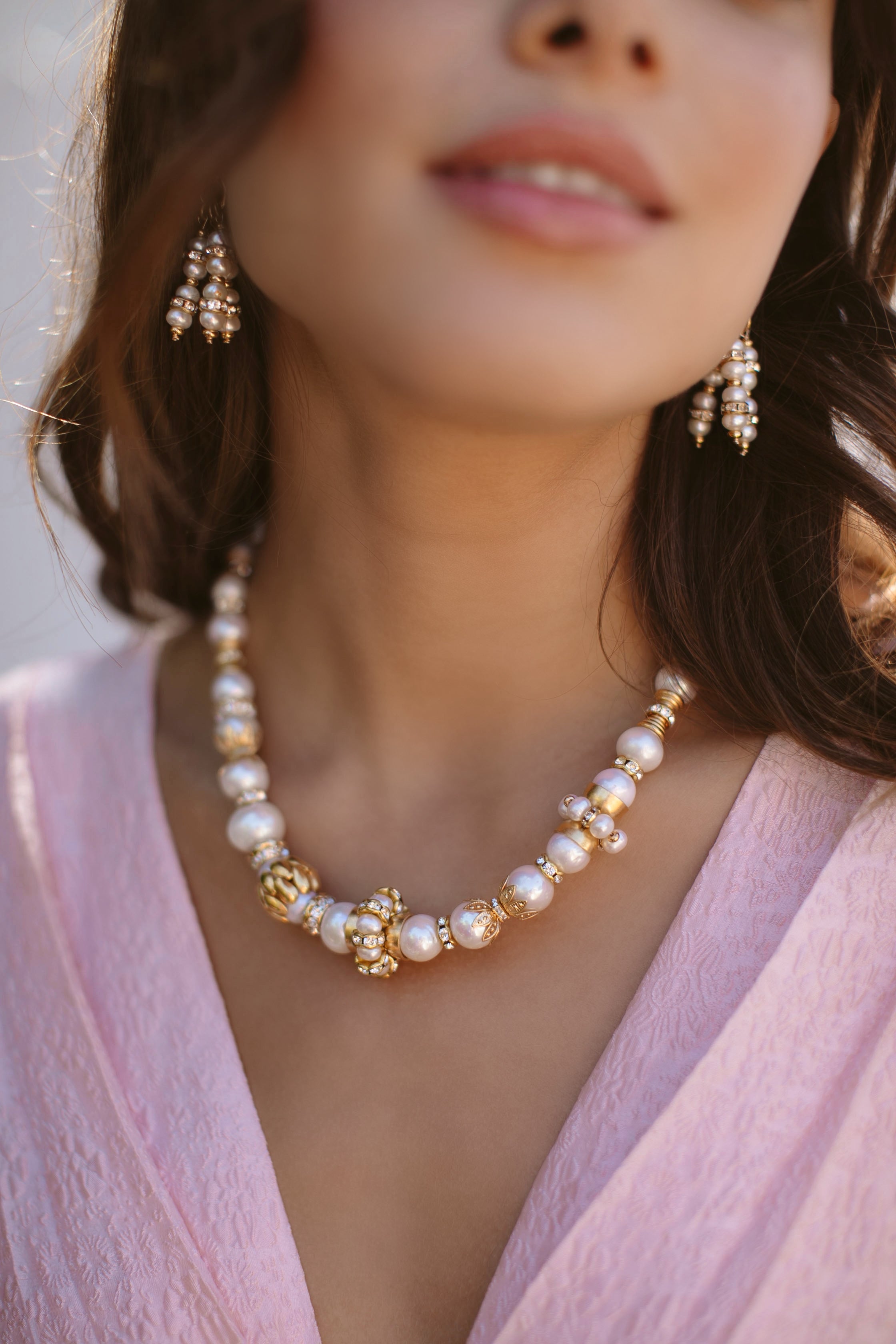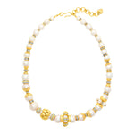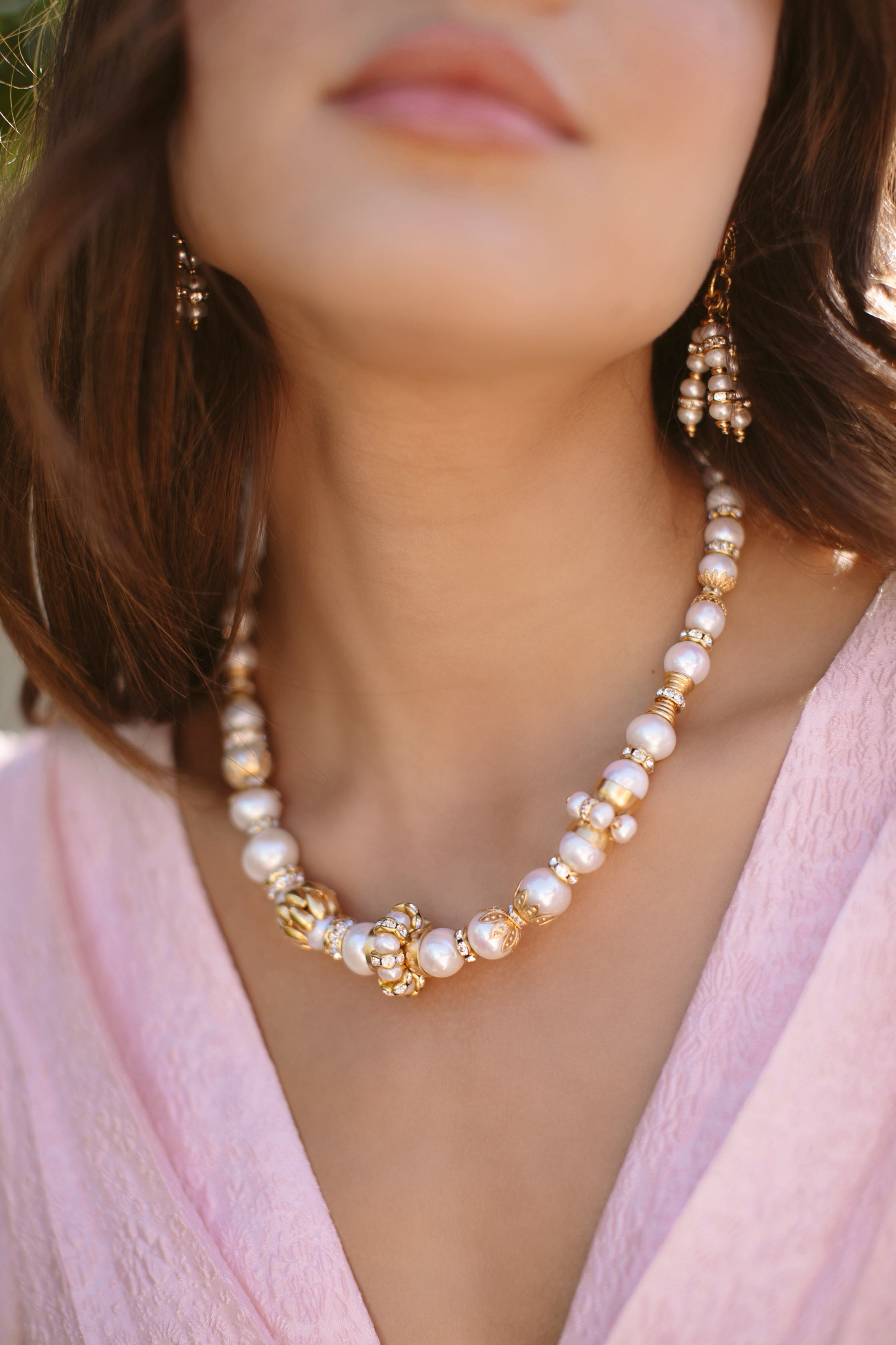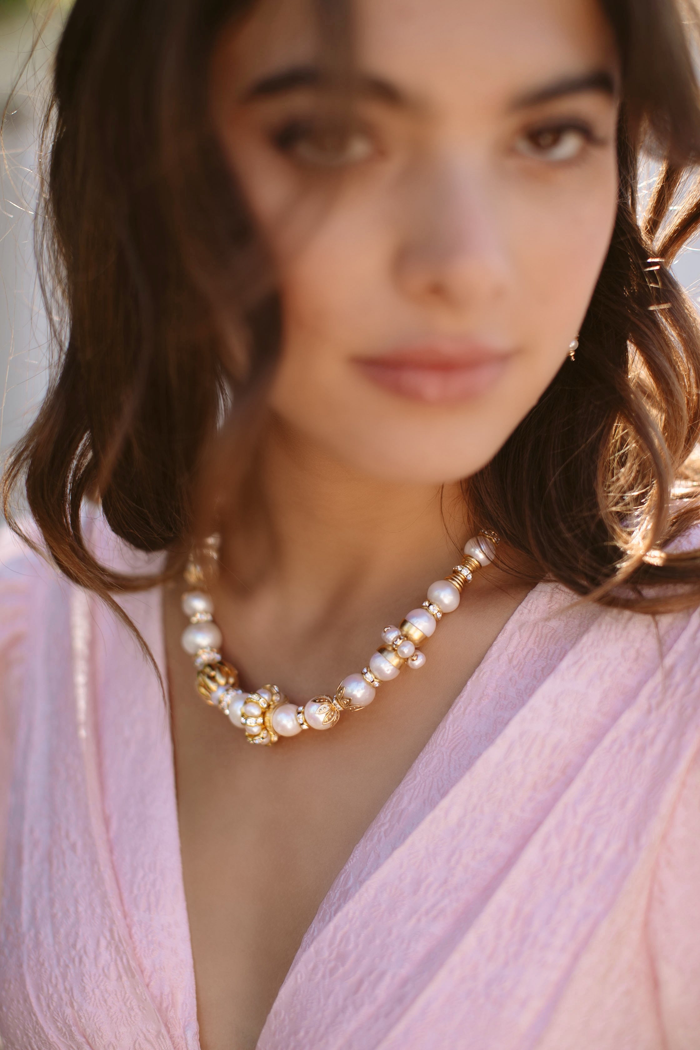 - A strand of graduated freshwater pearls with 24k antique gold brass and crystal rondelle spacers