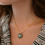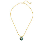- A Sakota emerald heart pendant with gemstone inlay slides along a 24k antique gold plated twisted hayseed chain