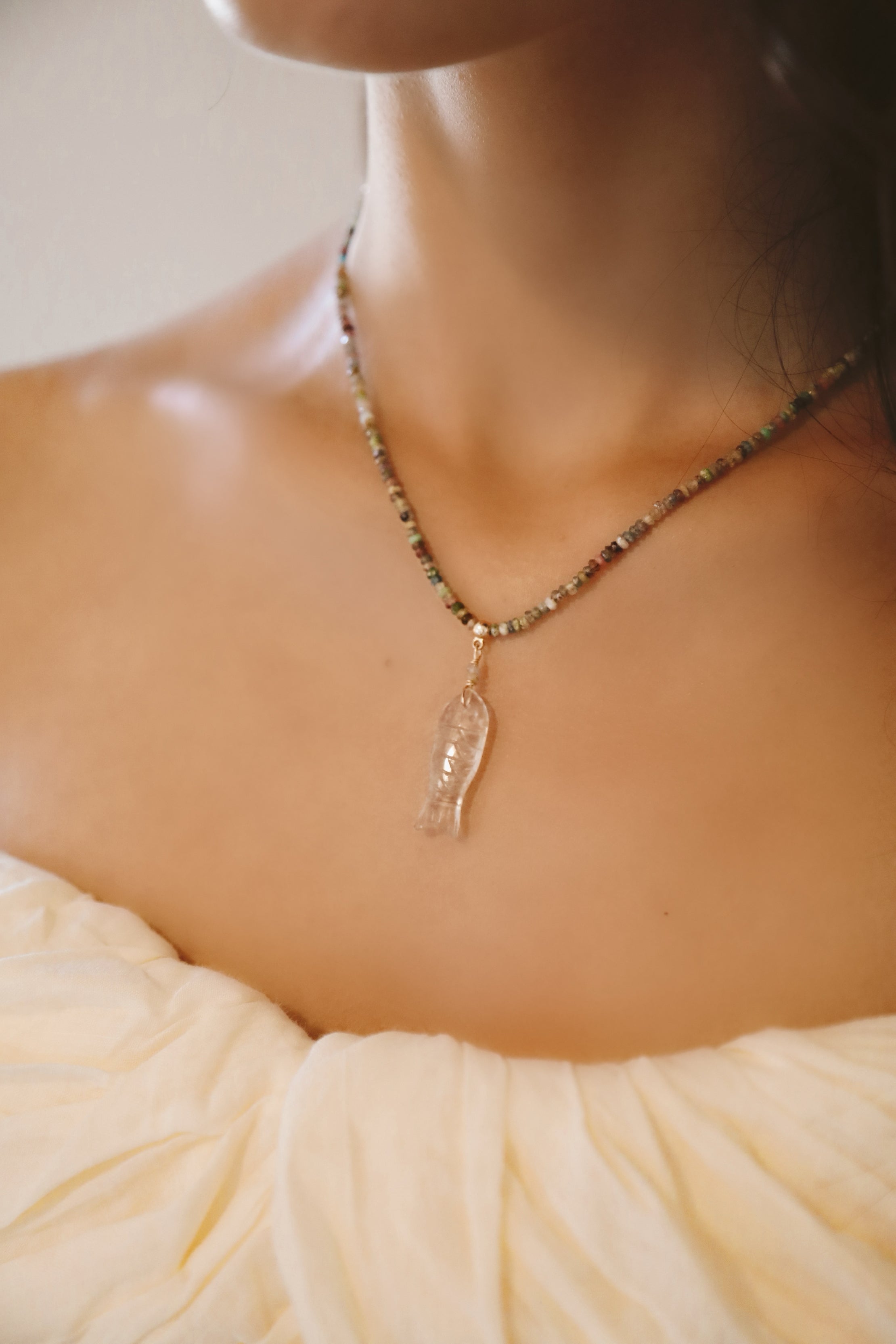 - A strand of mini faceted semi-precious gemstone beads adorned with a semi-precious gemstone fish charm.