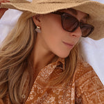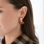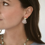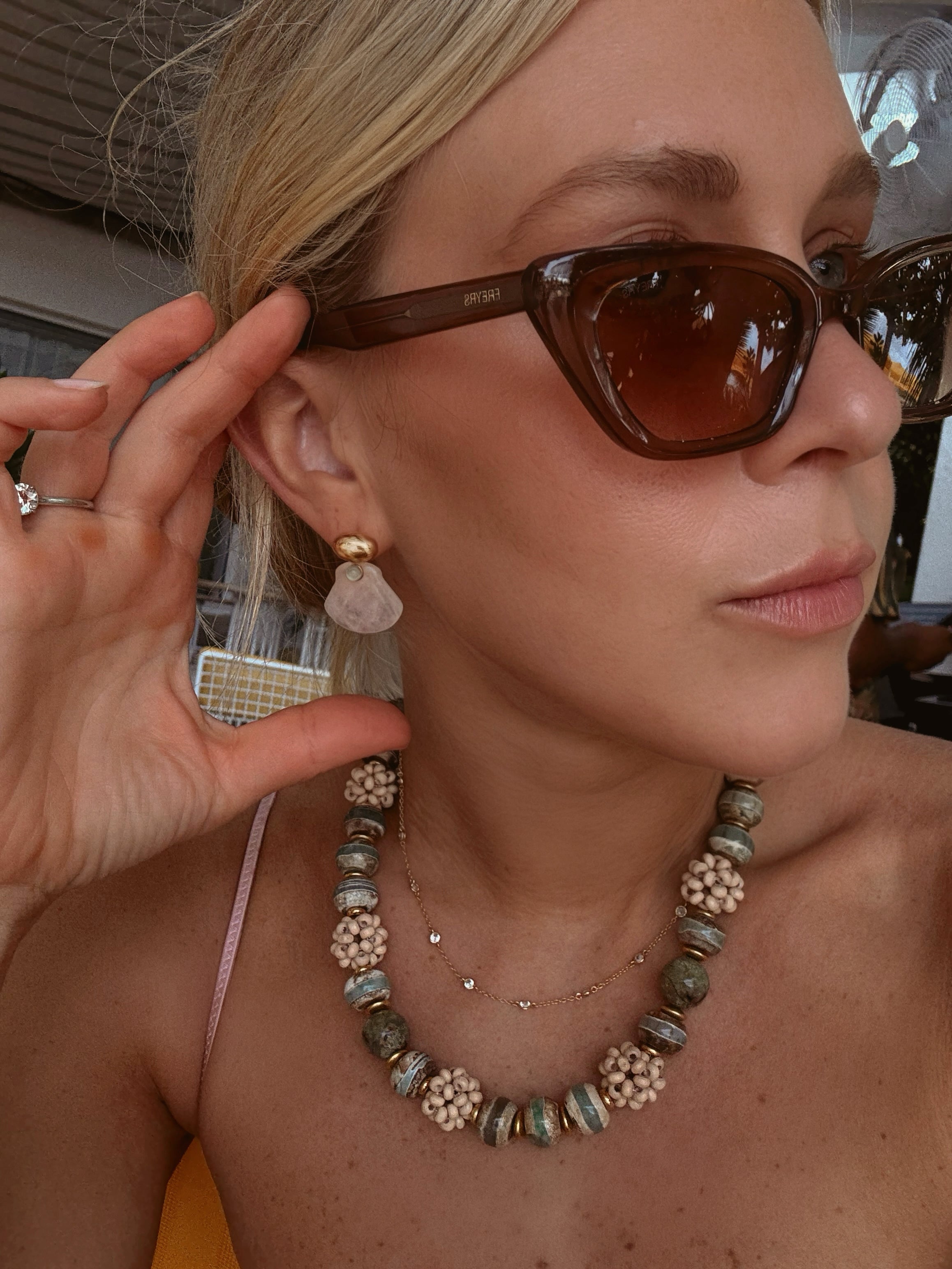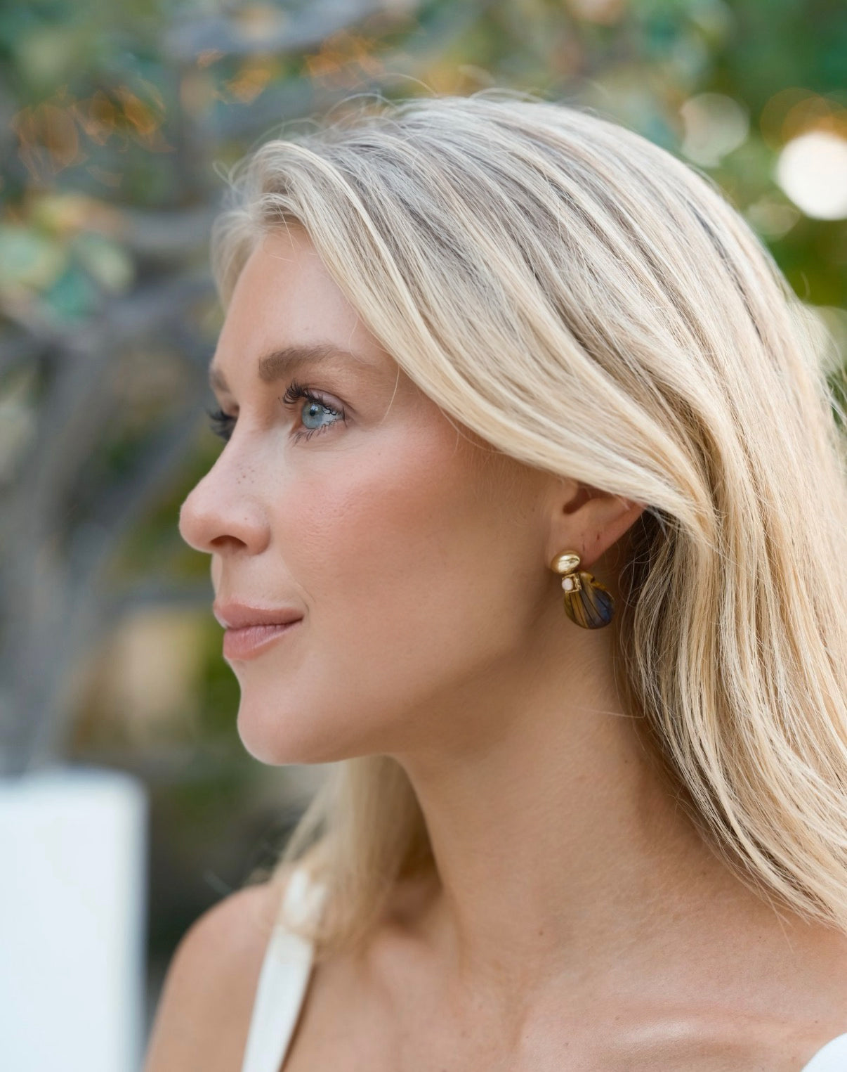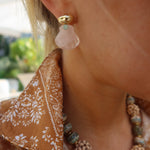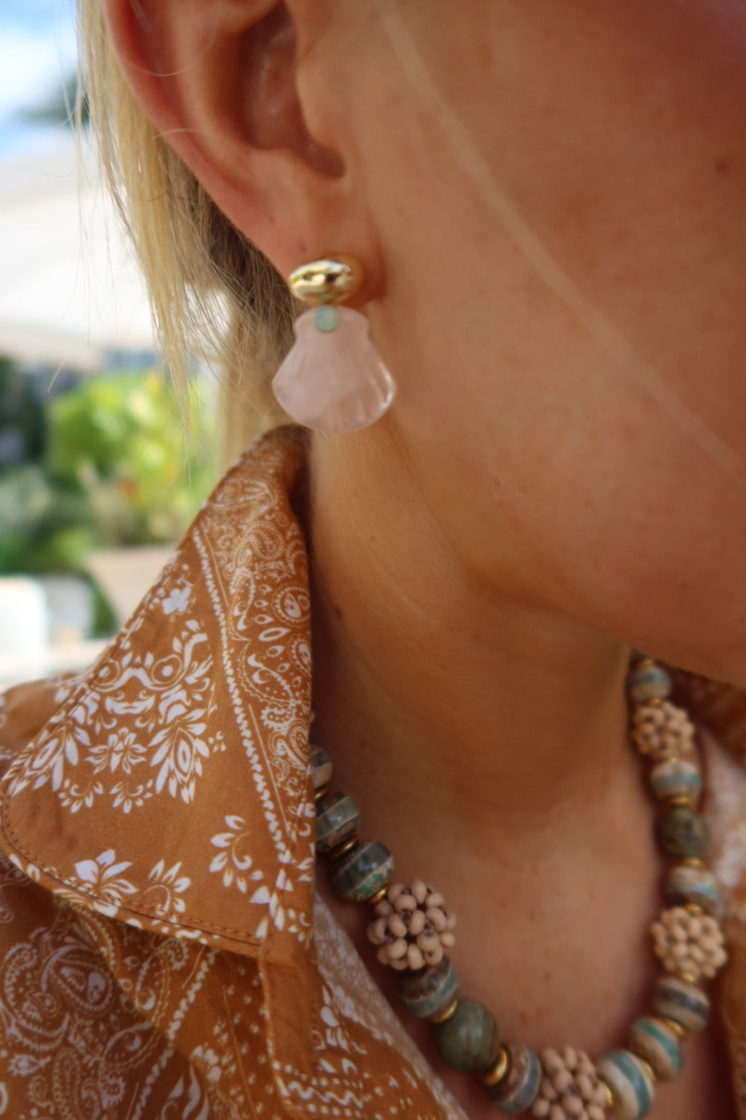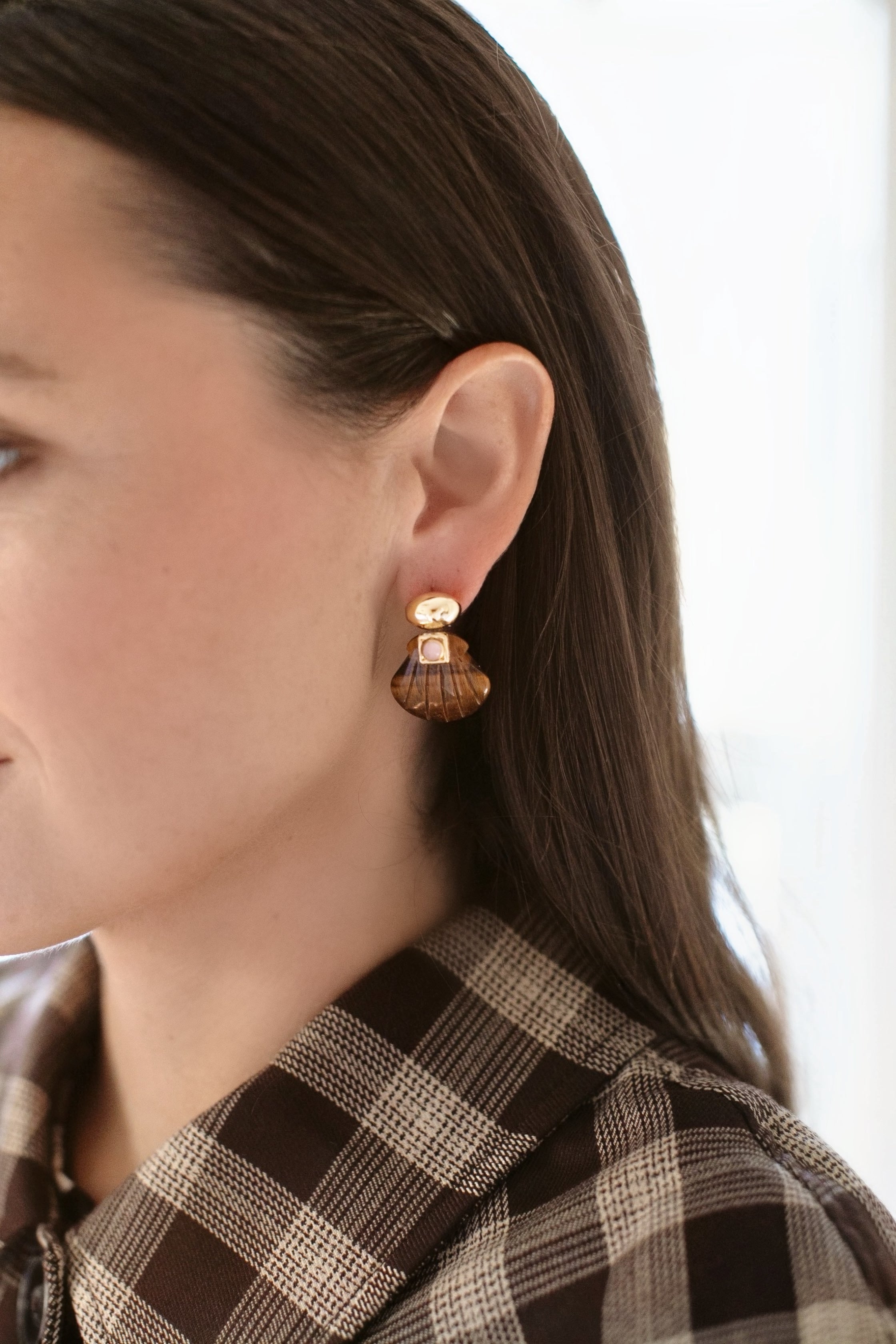 - Hand-carved gemstone shells with Swarovski crystal and glass detailing are on 24k antique gold plated ovoid toppers