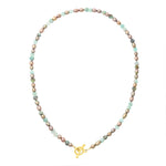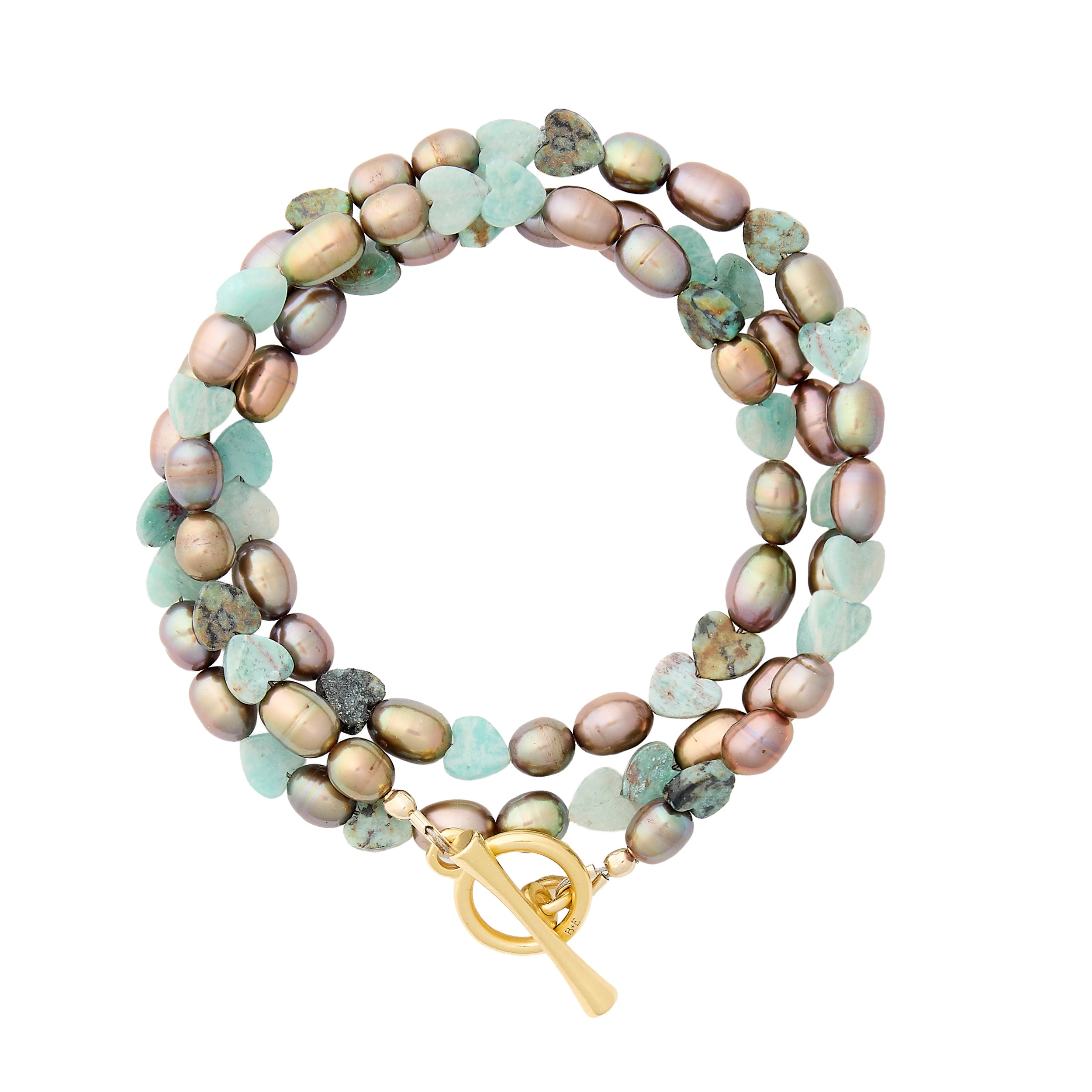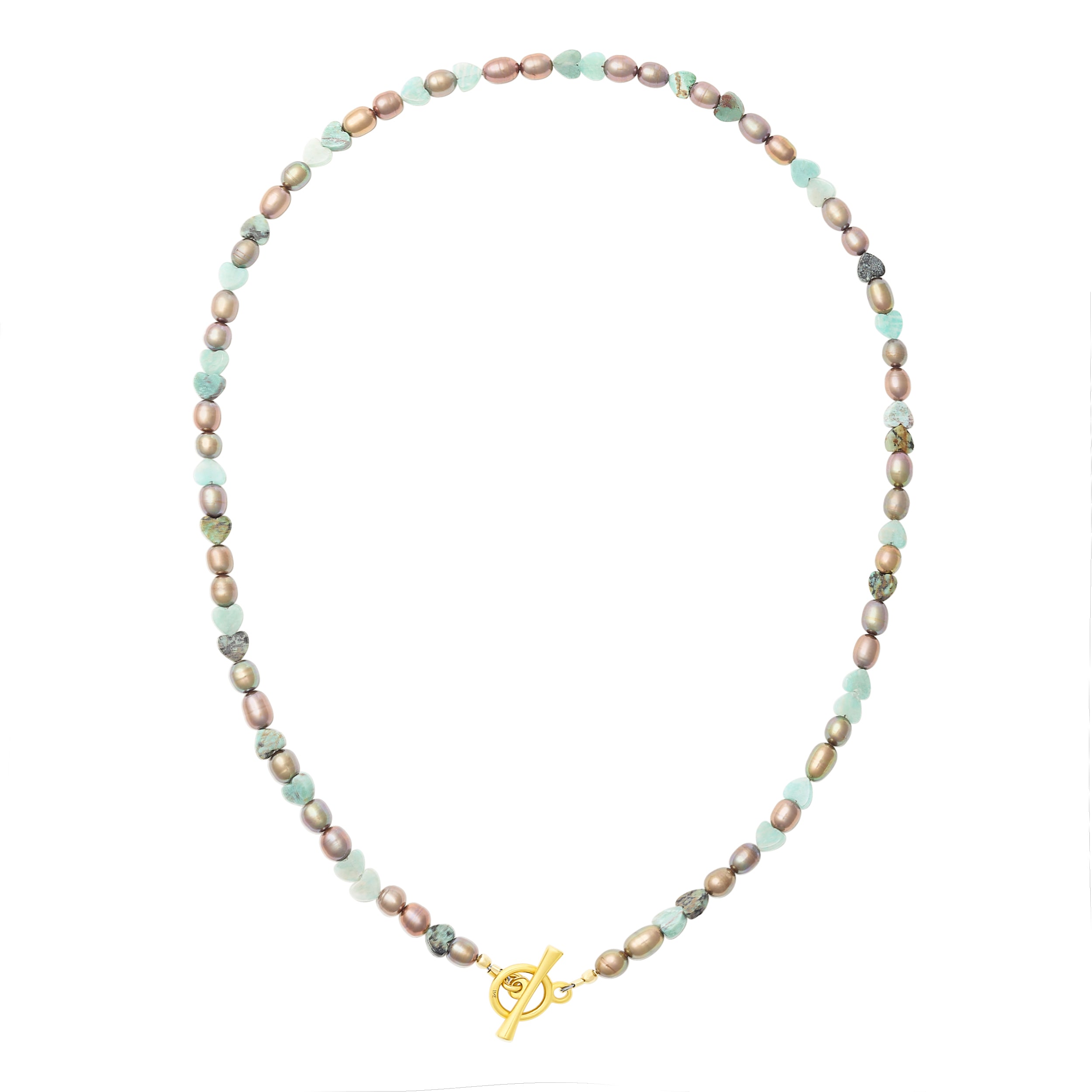 - A strand of semi-precious gemstone hearts and freshwater rice pearls