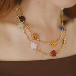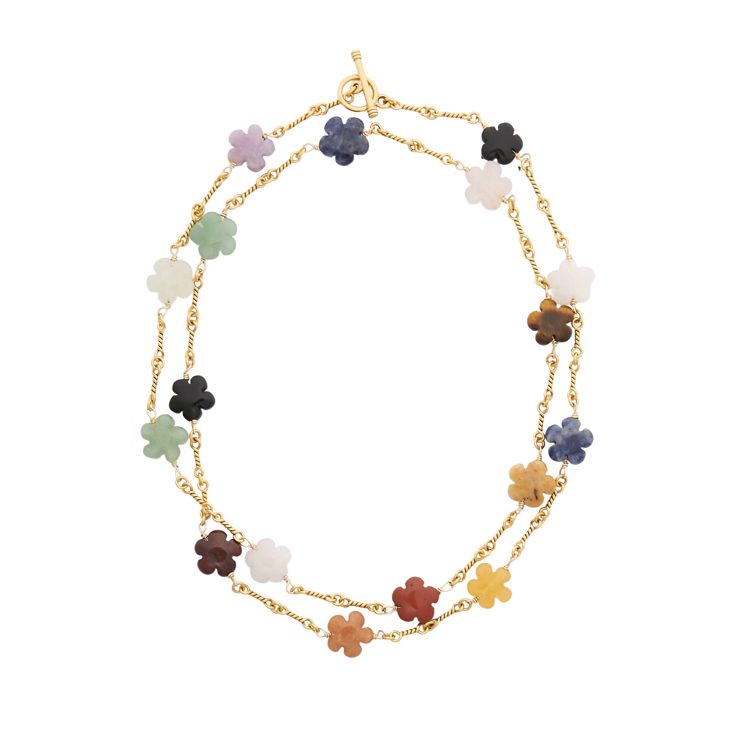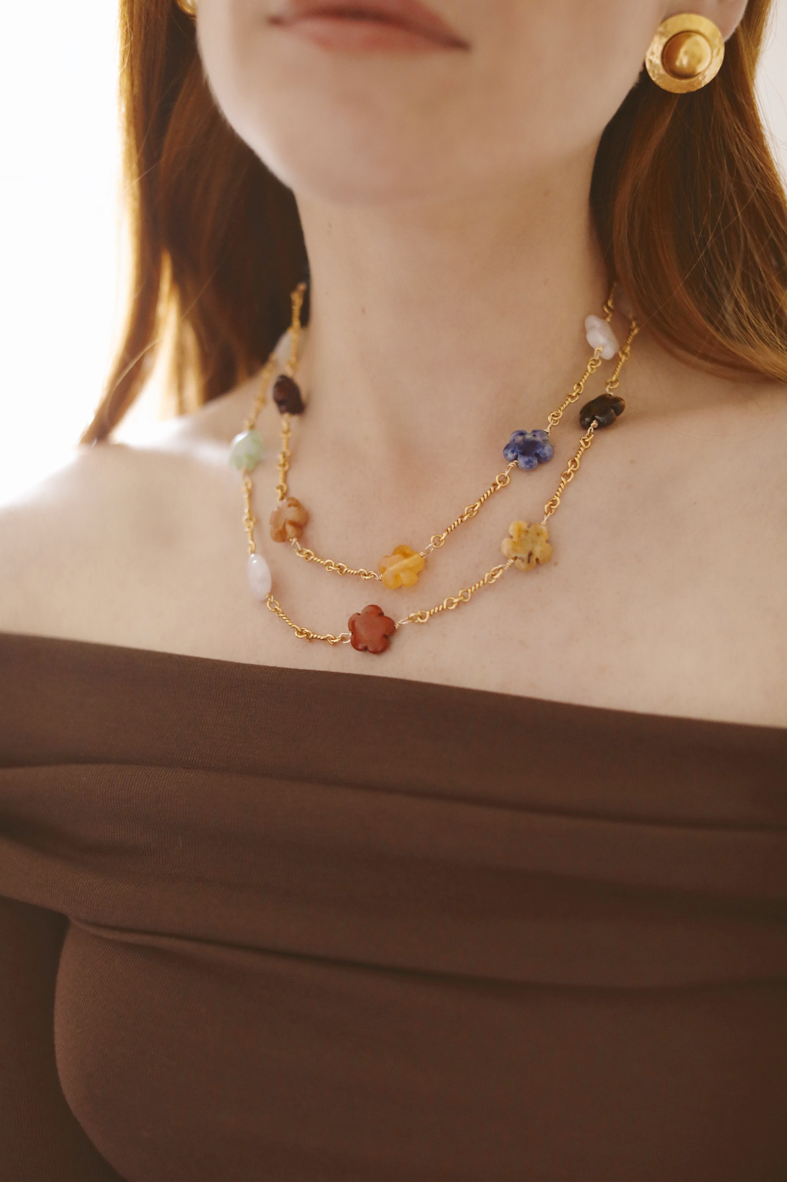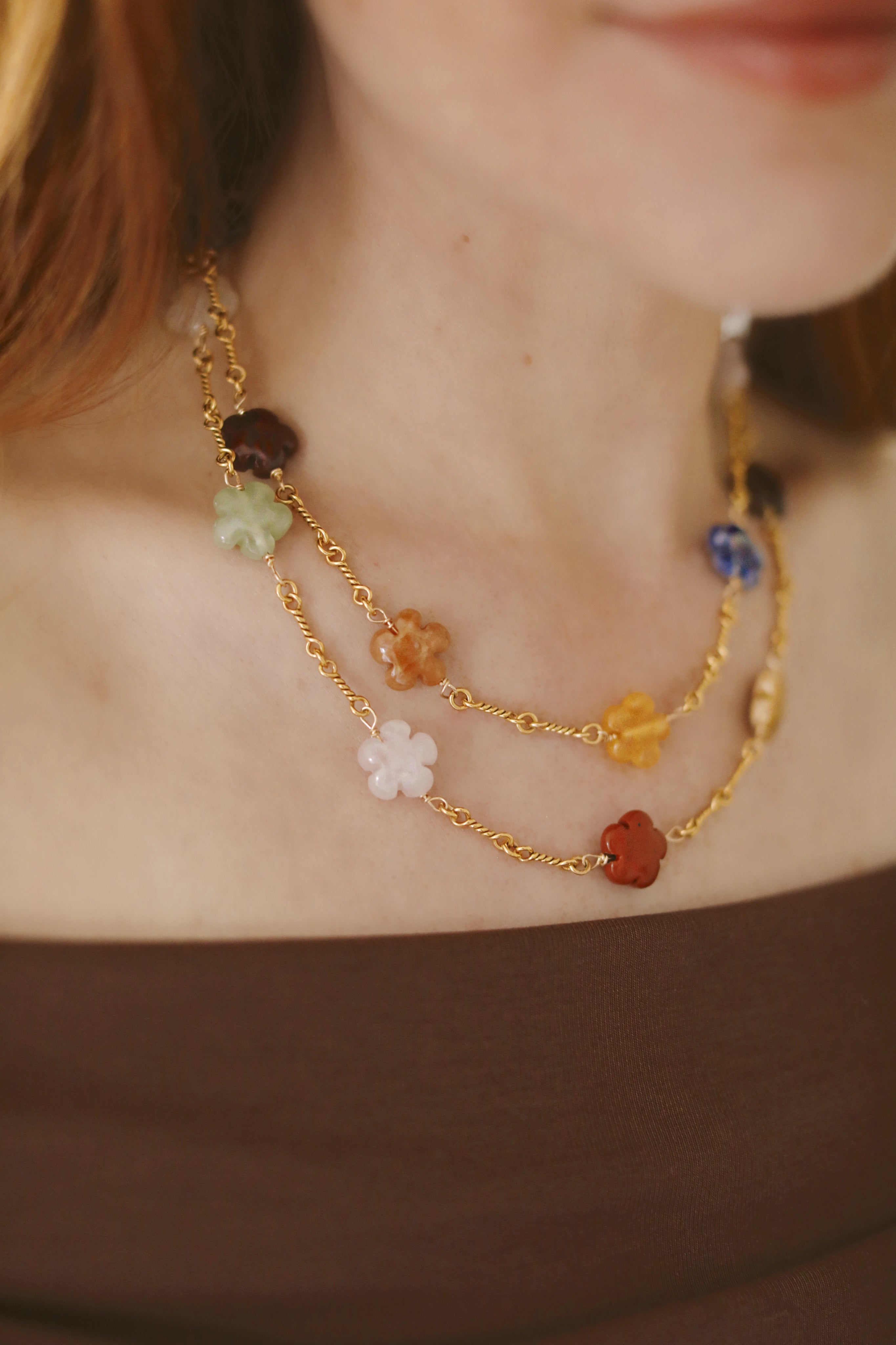 - A delicate 24k antique gold plated chain adorned with semi-precious gemstone flower beads