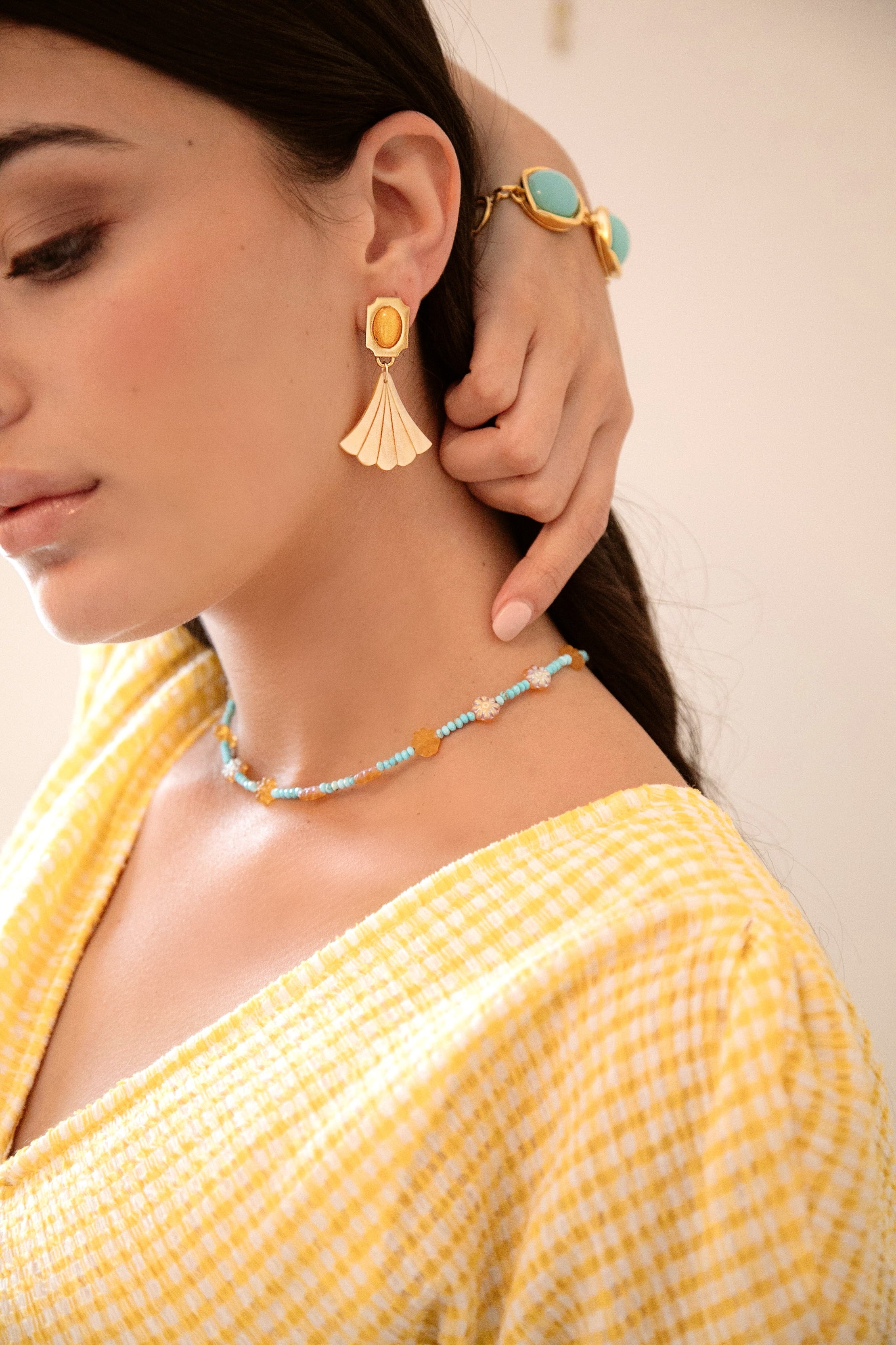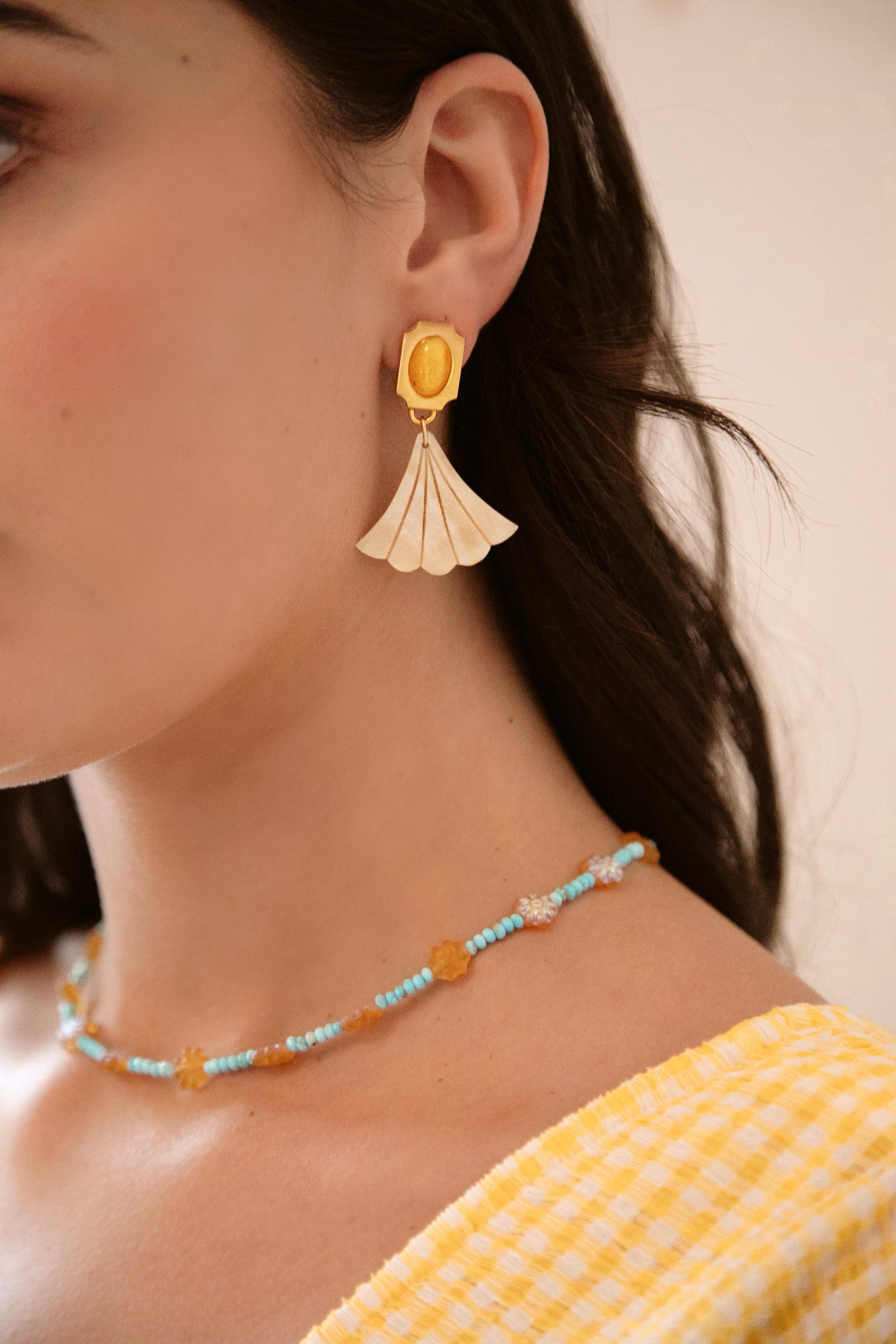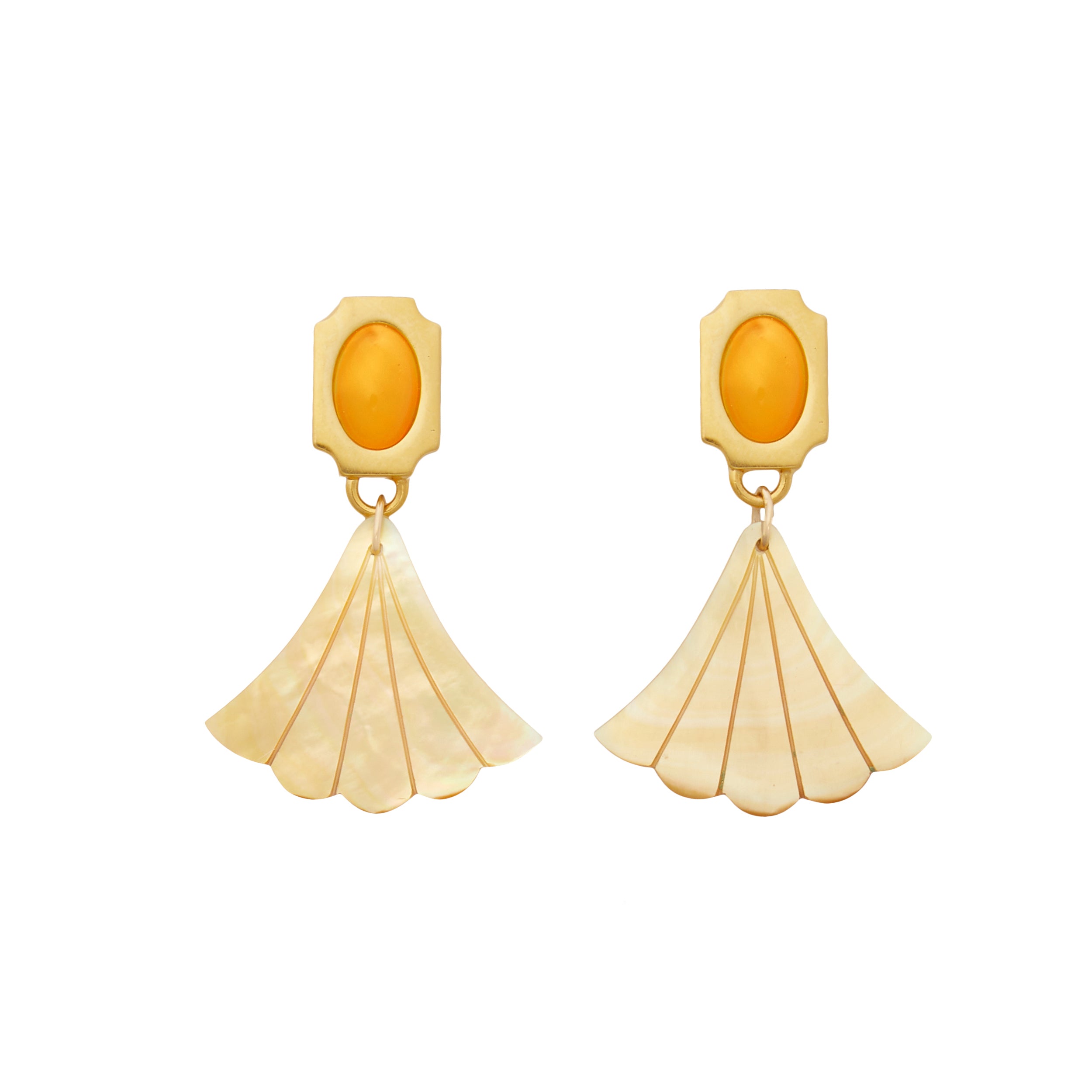 - Gold lip shell fans hang from 24K antique gold plated toppers set with yellow moonstone glass cabochons on stainless steel hypoallergenic posts