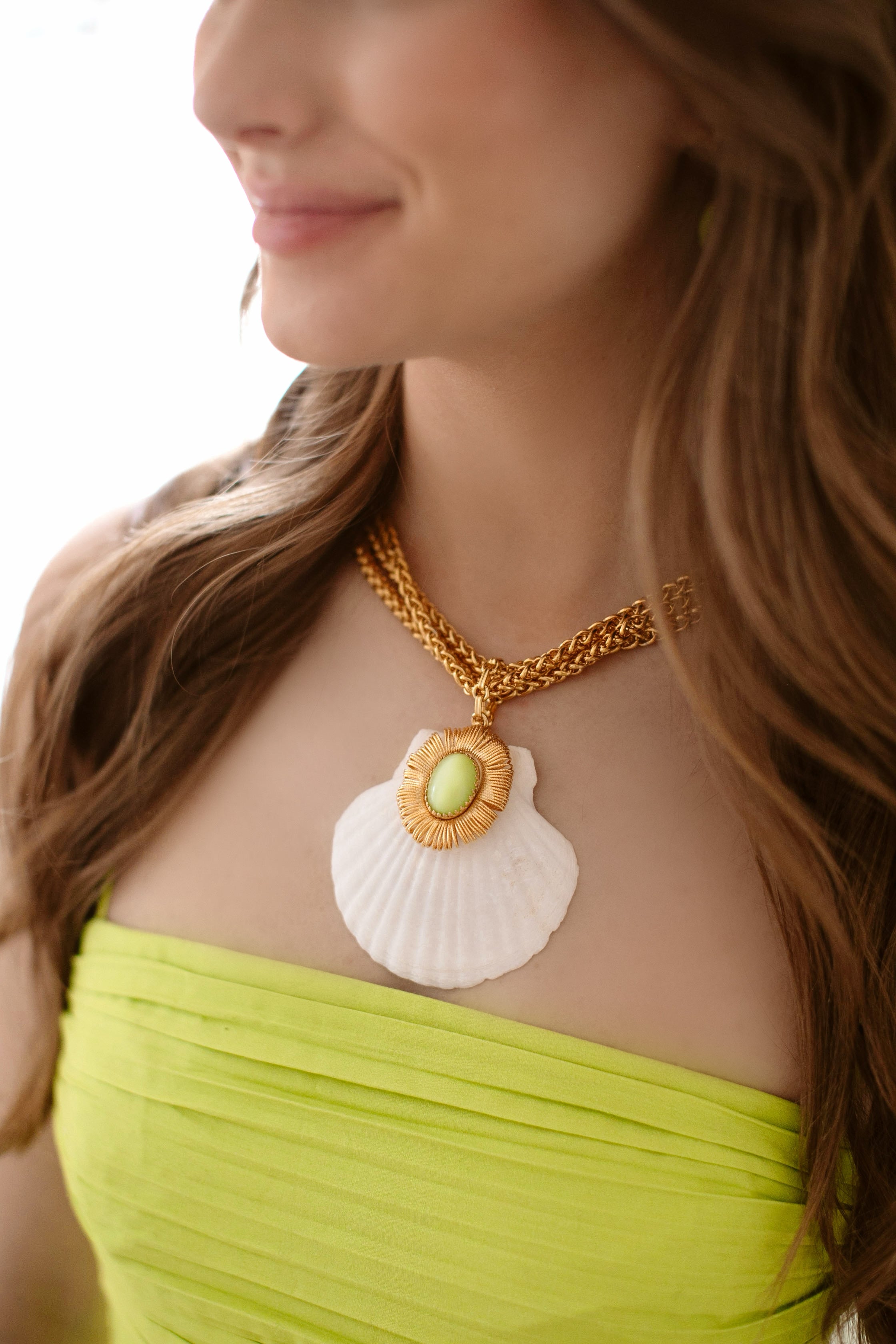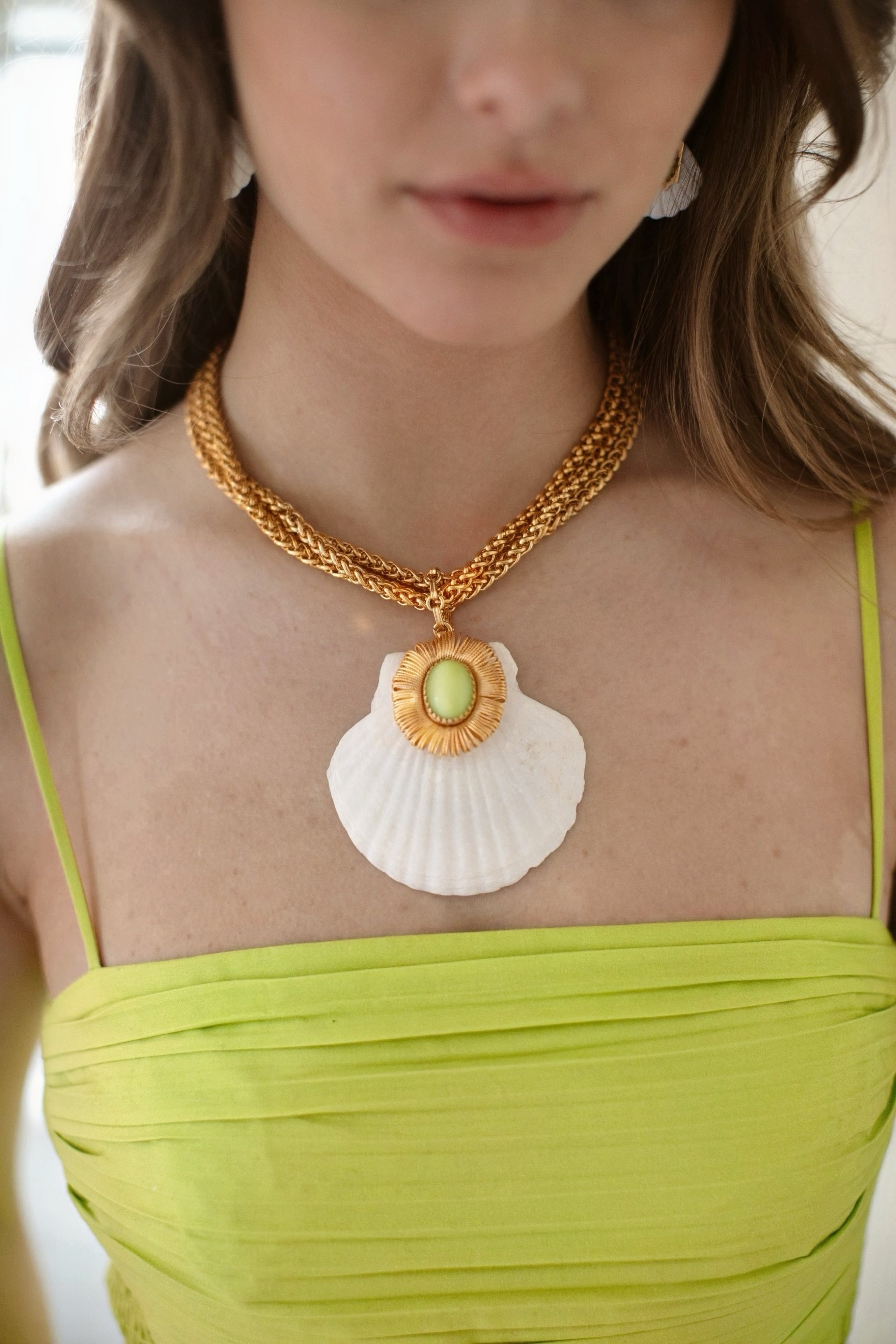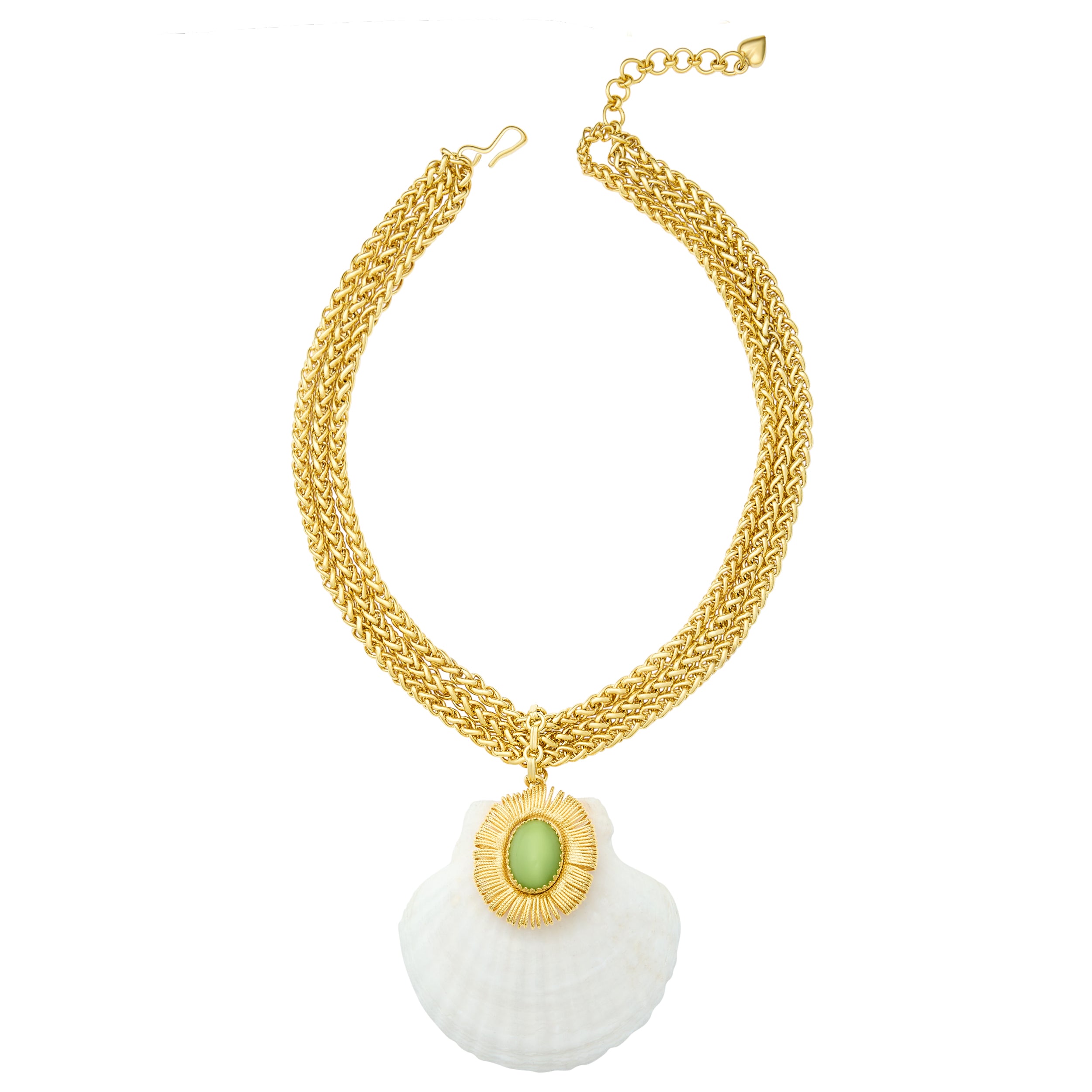- A scallop shell with 24k antique gold plated detailing and a green moonstone cabochon slides along a 24k antique gold plated triple strand wheat link chain
