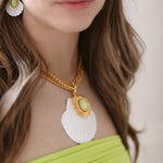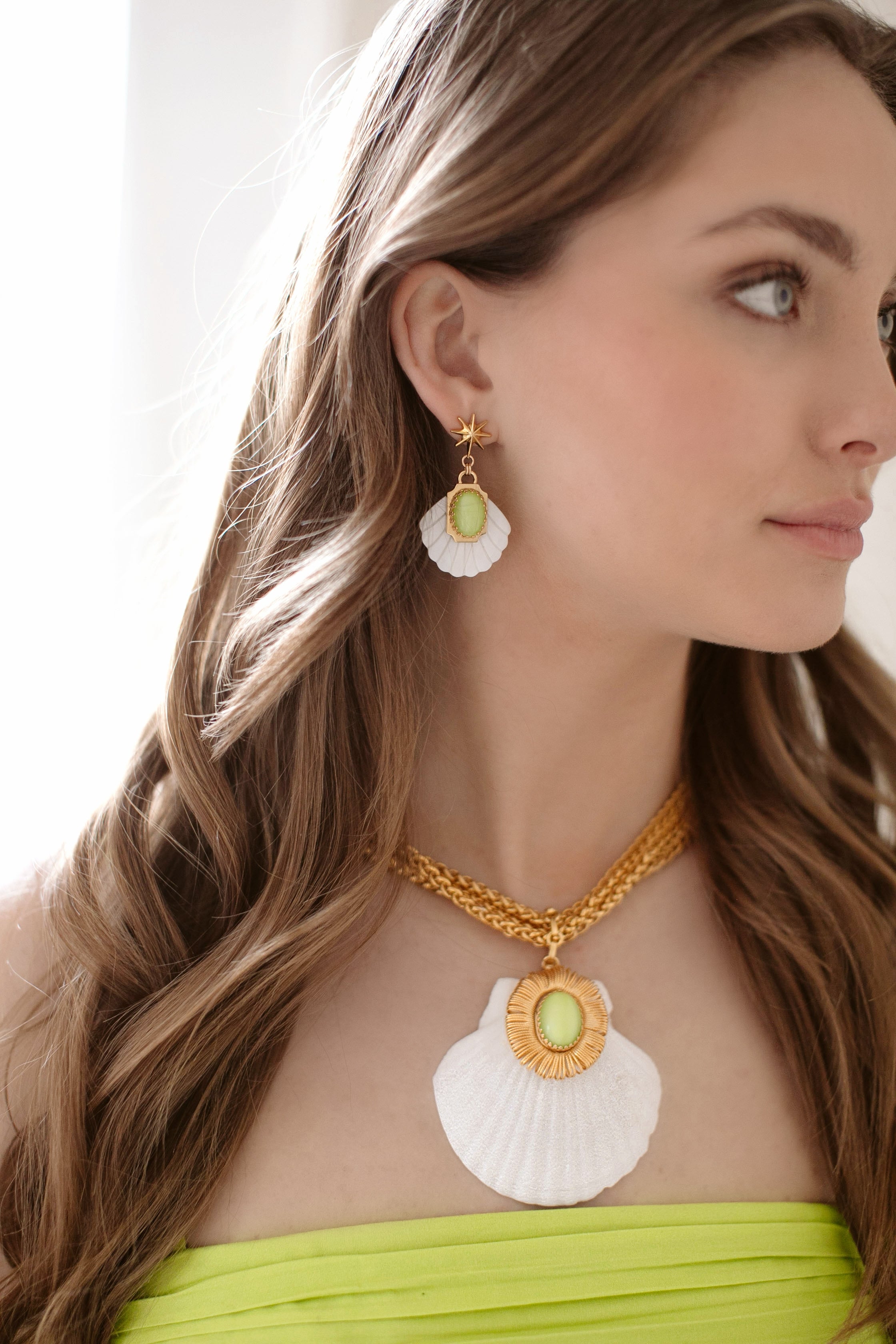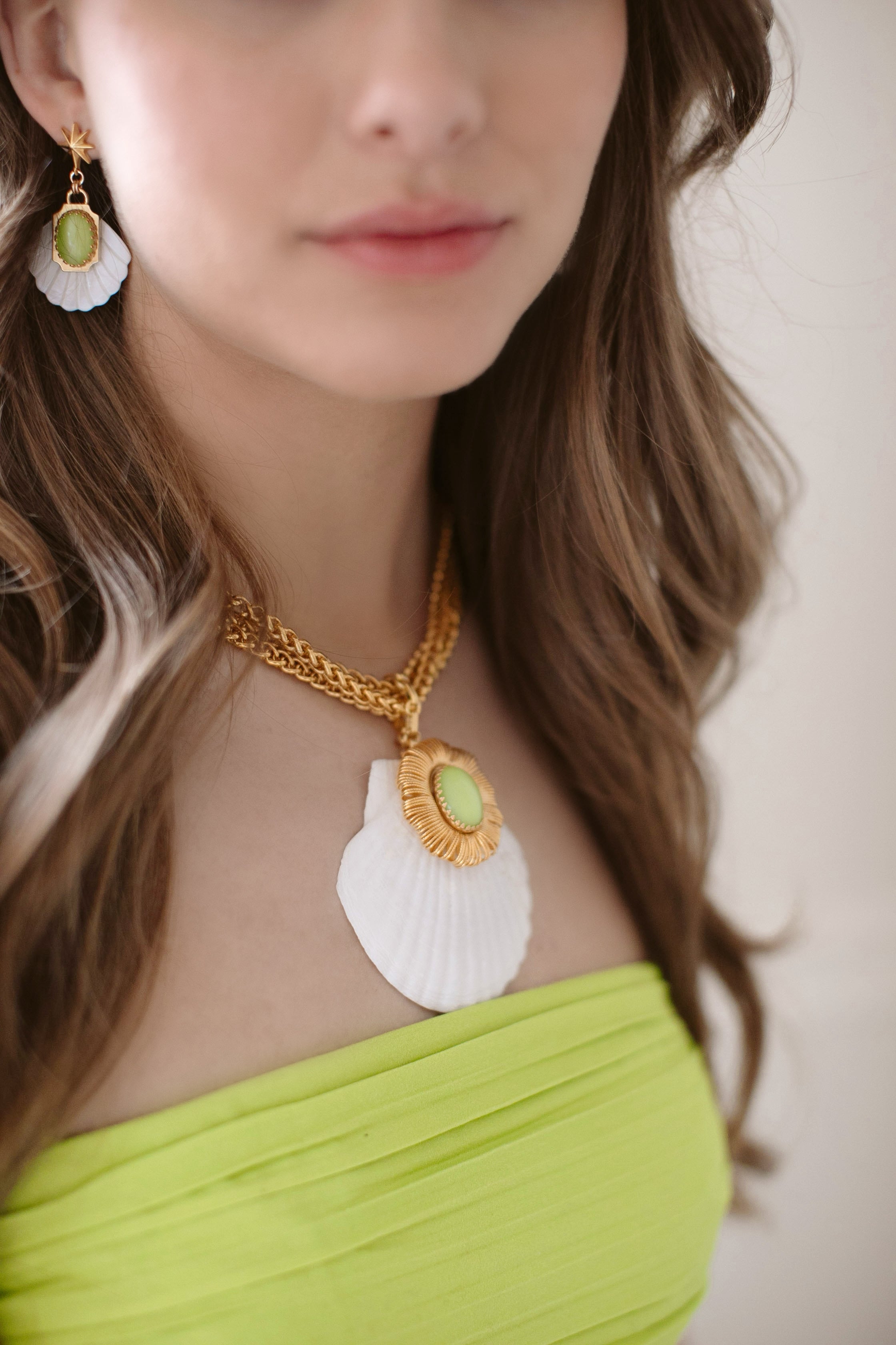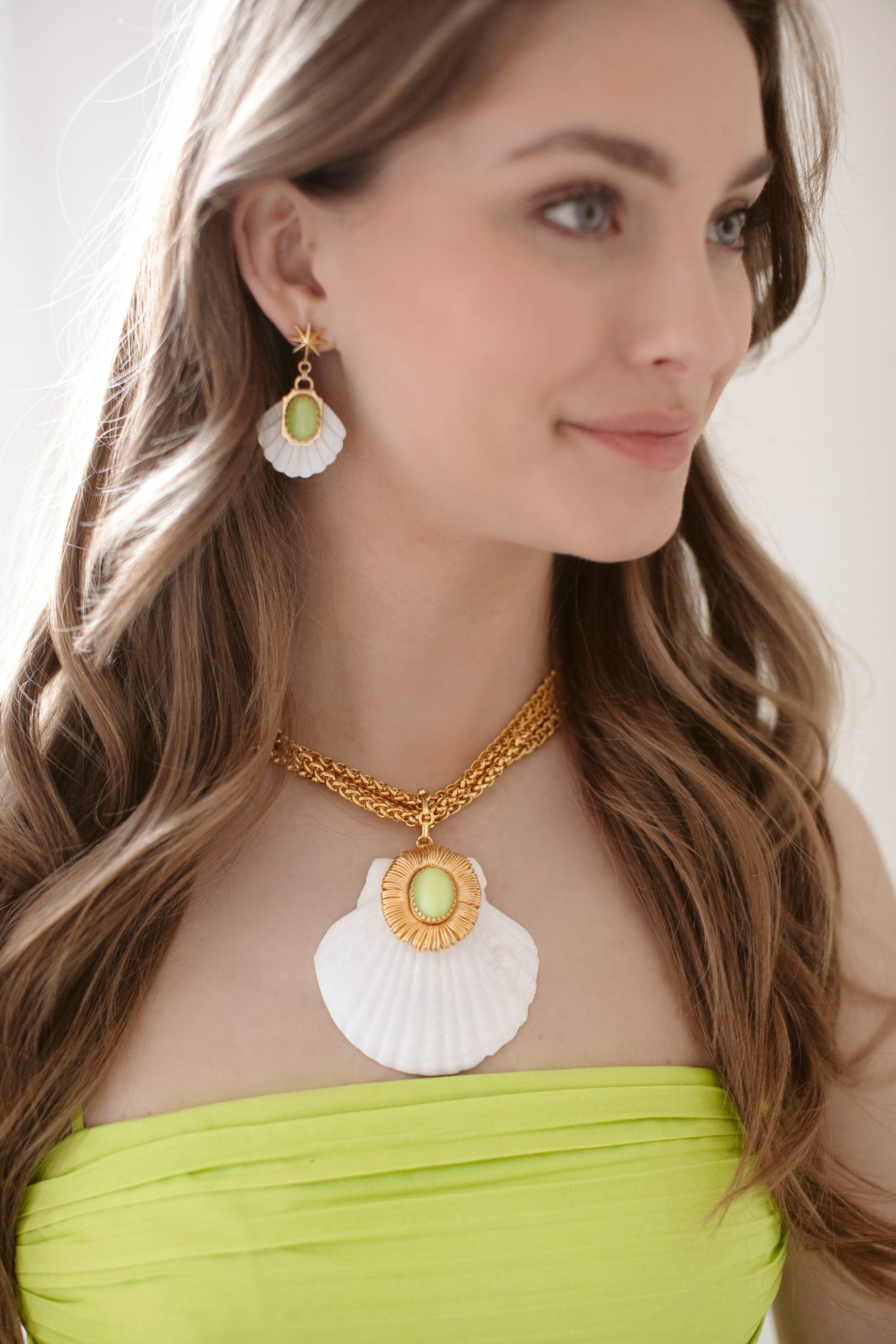 - A scallop shell with 24k antique gold plated detailing and a green moonstone cabochon slides along a 24k antique gold plated triple strand wheat link chain