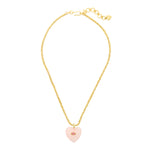 - A rose quartz heart with gemstone inlay slides along a 24k antique gold plated interlocking scroll chain