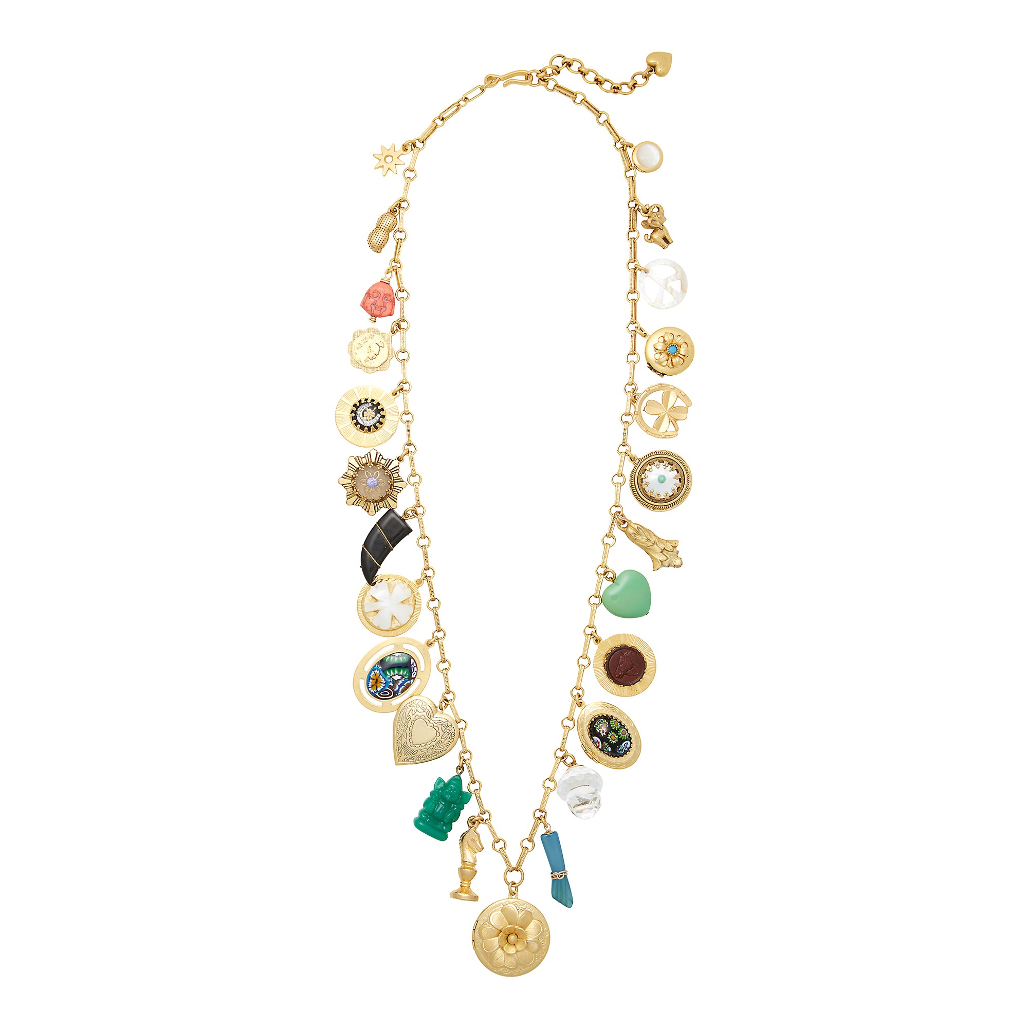 - 24k antique gold plated brass chain adorned with our favorite assortment of vintage lockets and charms, semi-precious stones and mementos compiled over the past decade