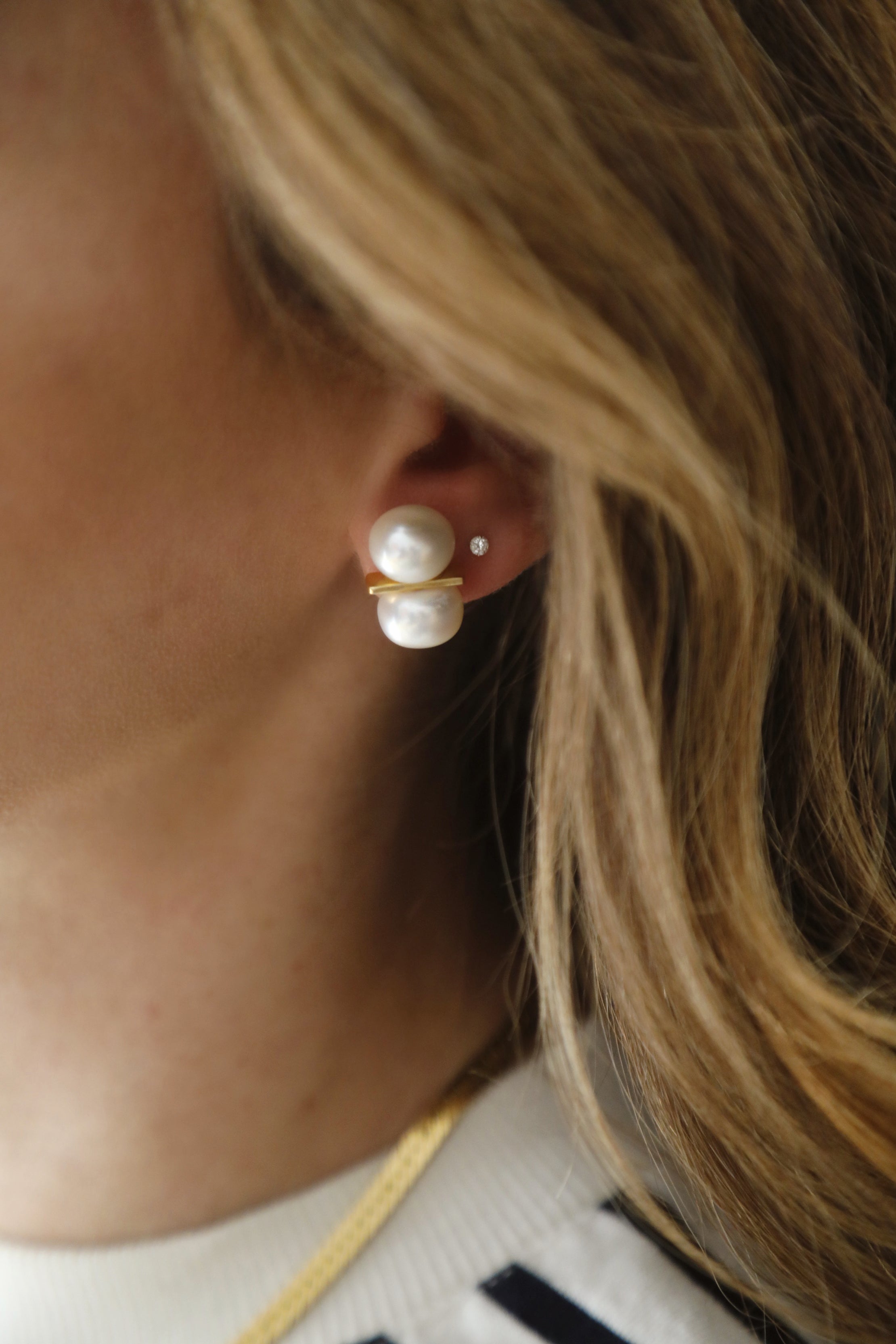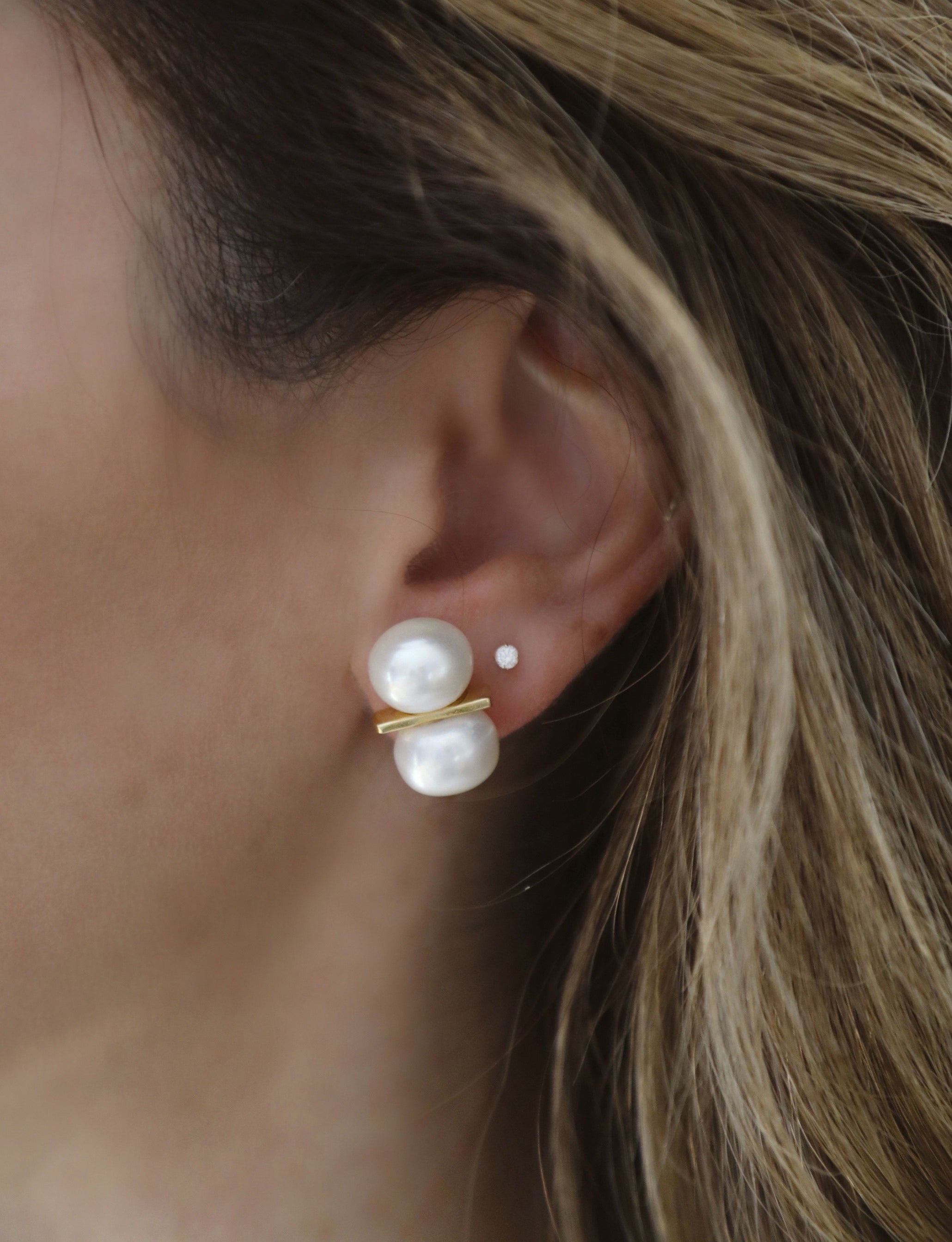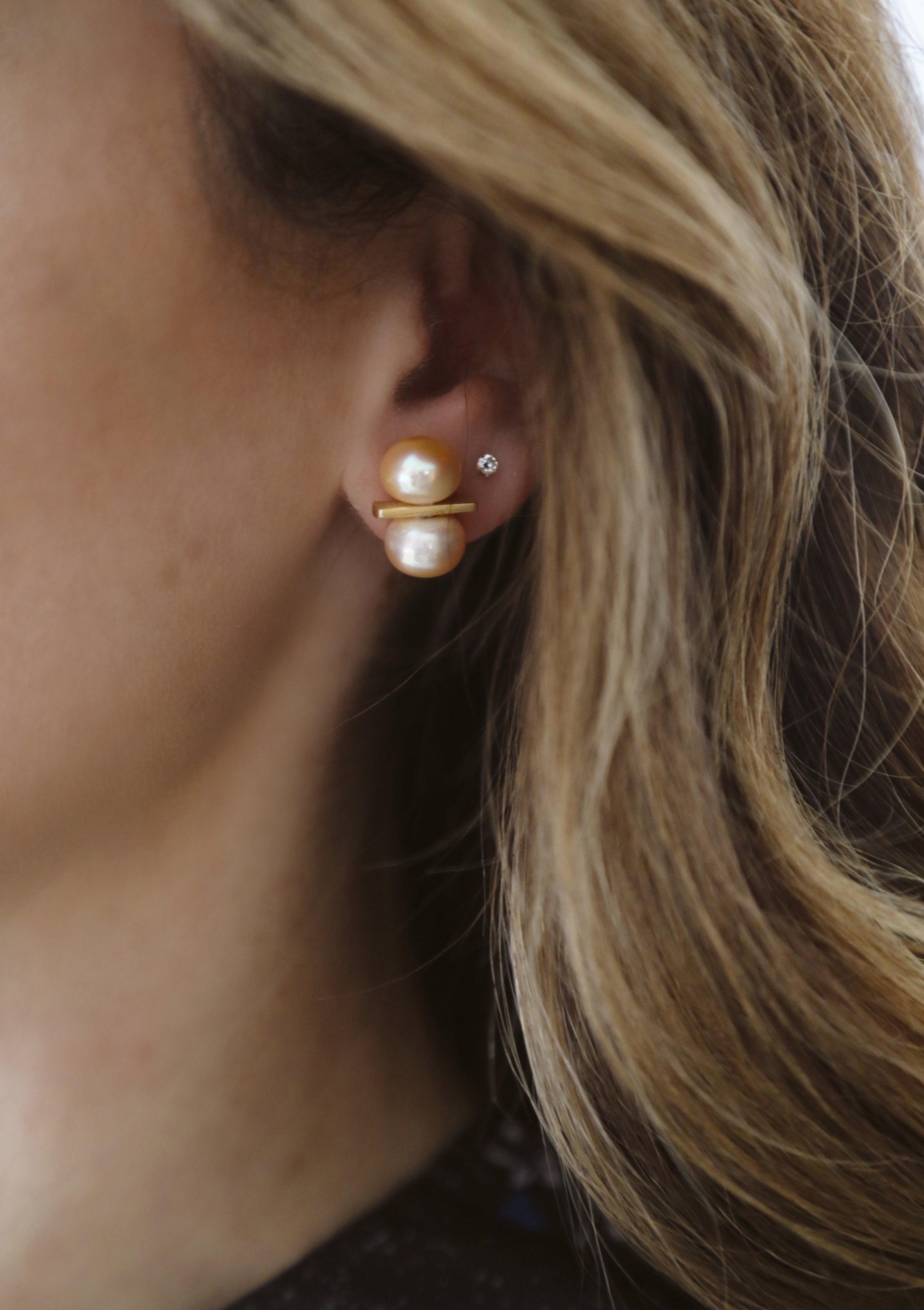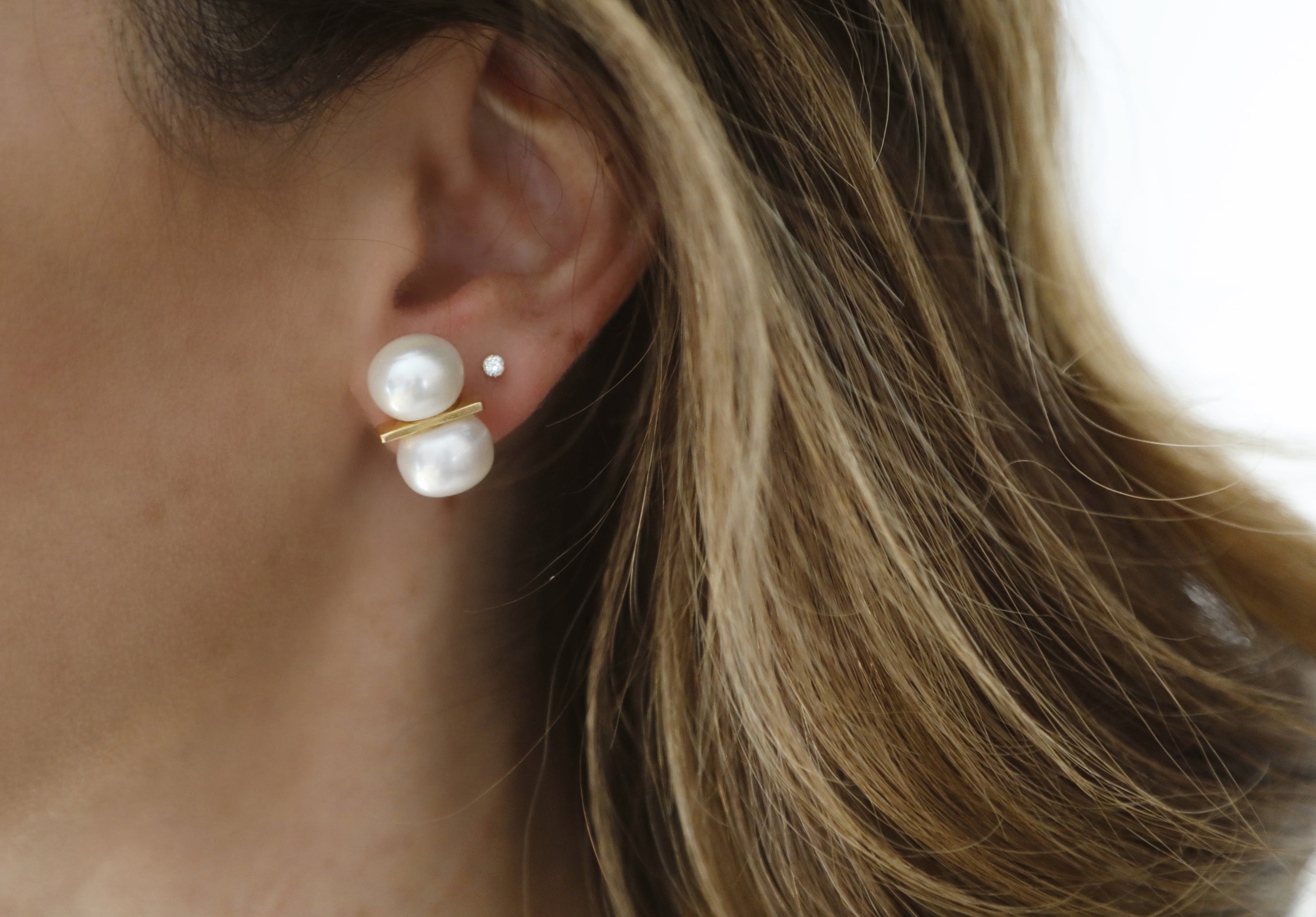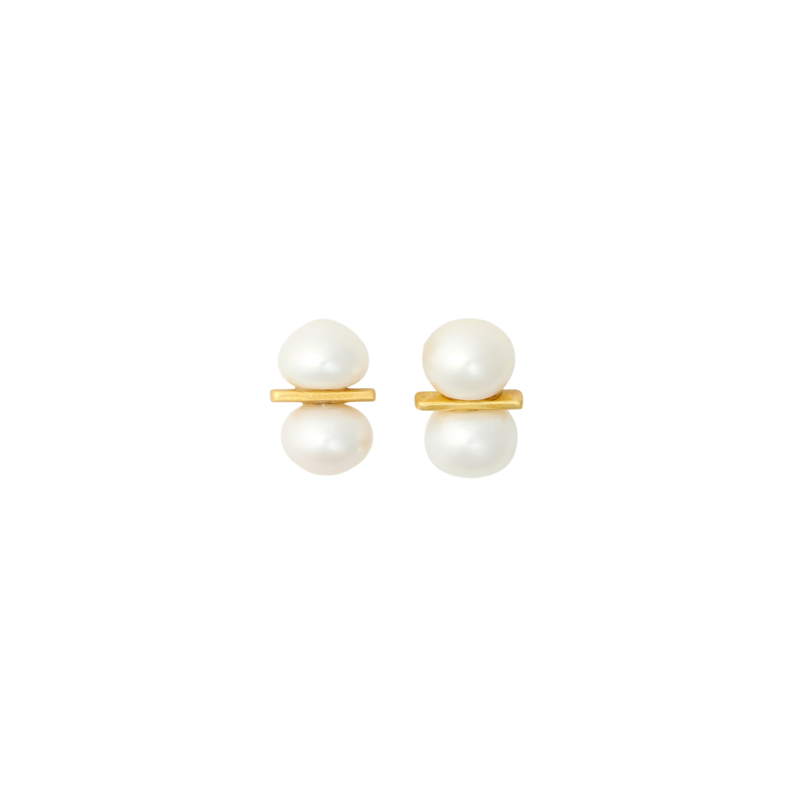- Freshwater pearls set on a 24k antique gold plated bar stud on stainless steel hypoallergenic posts