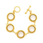 - Matte melon glass cabochons are set in 24k antique gold plated brass settings