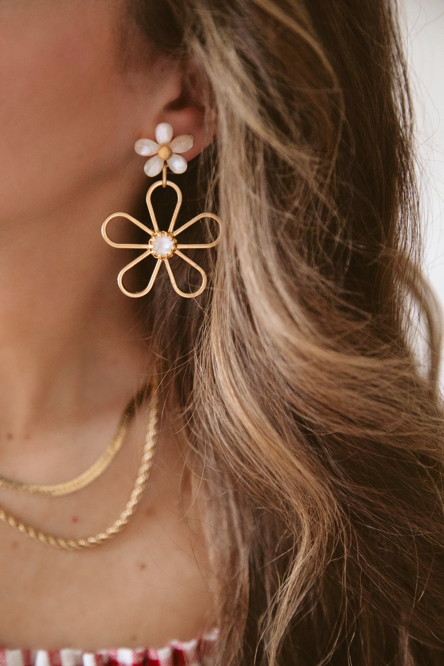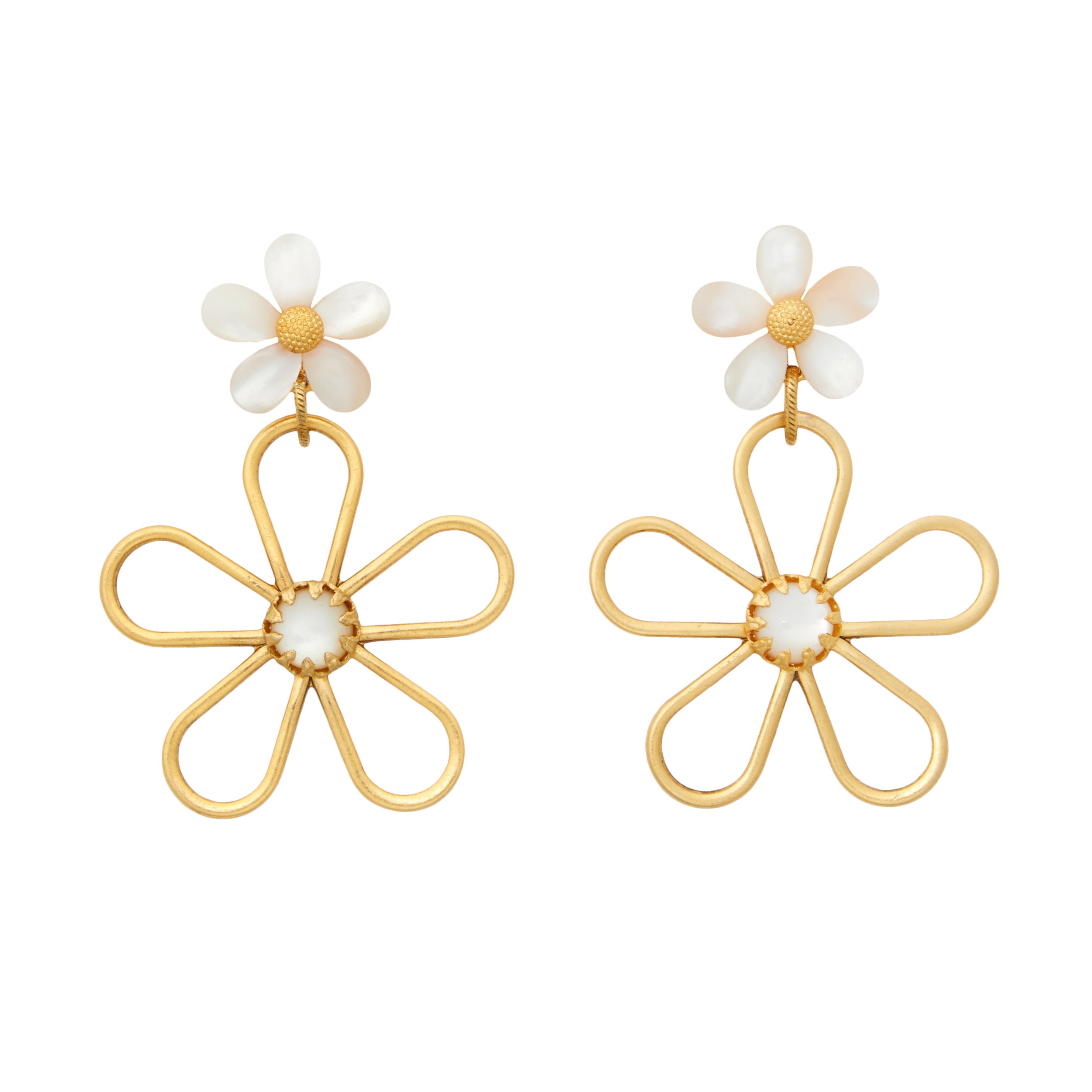 - 24k antique gold plated flower with a MOP or Blacklip Shell center hang from MOP or Blacklip Shell flower toppers on stainless steel hypoallergenic posts