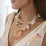 - A strand of irregular cut Trumpet Luhuanus Shells, faceted rock crystal beads and 24k antique gold plated spacer beads adorned with a flat pectin shell featuring 24k gold plated ornate flowers set with mini freshwater pearls