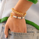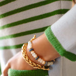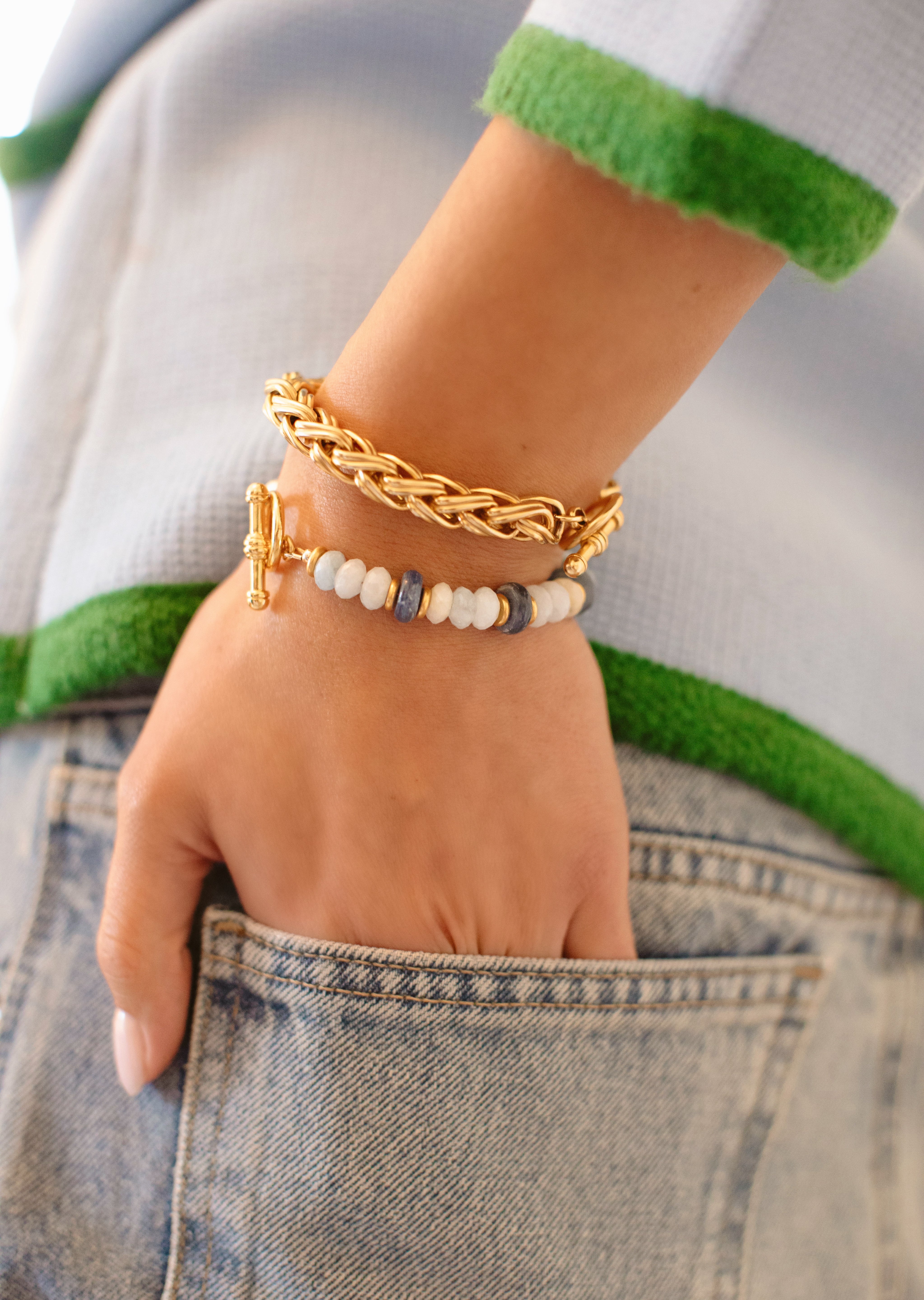 - A bracelet made of semi-precious faceted aquamarine beads, kyanite slices and 24k antique gold plated spacer beads