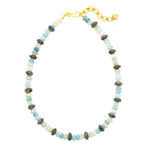 - A strand of semi-precious faceted aquamarine beads, kyanite slices and 24k antique gold plated spacer beads