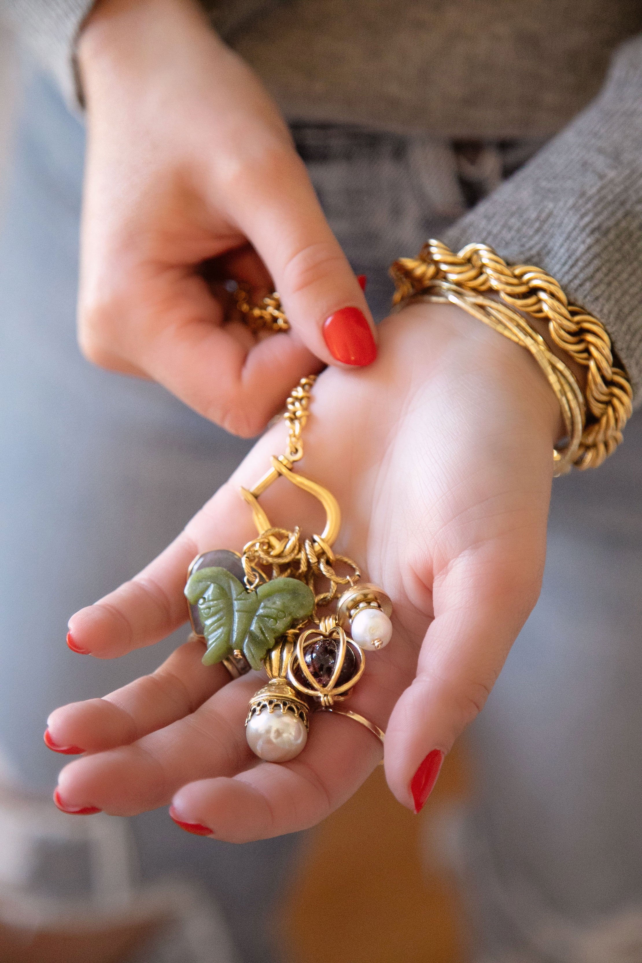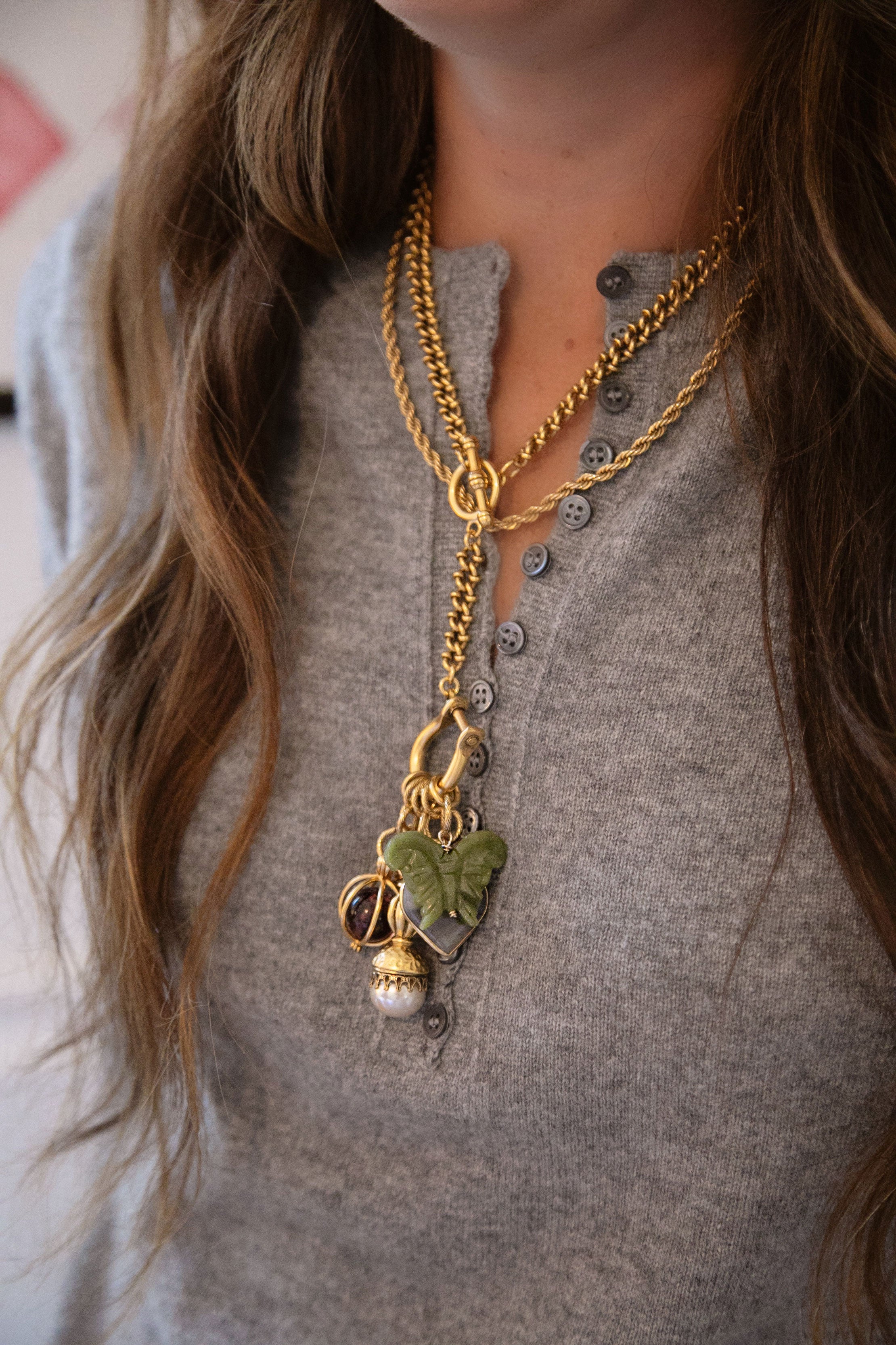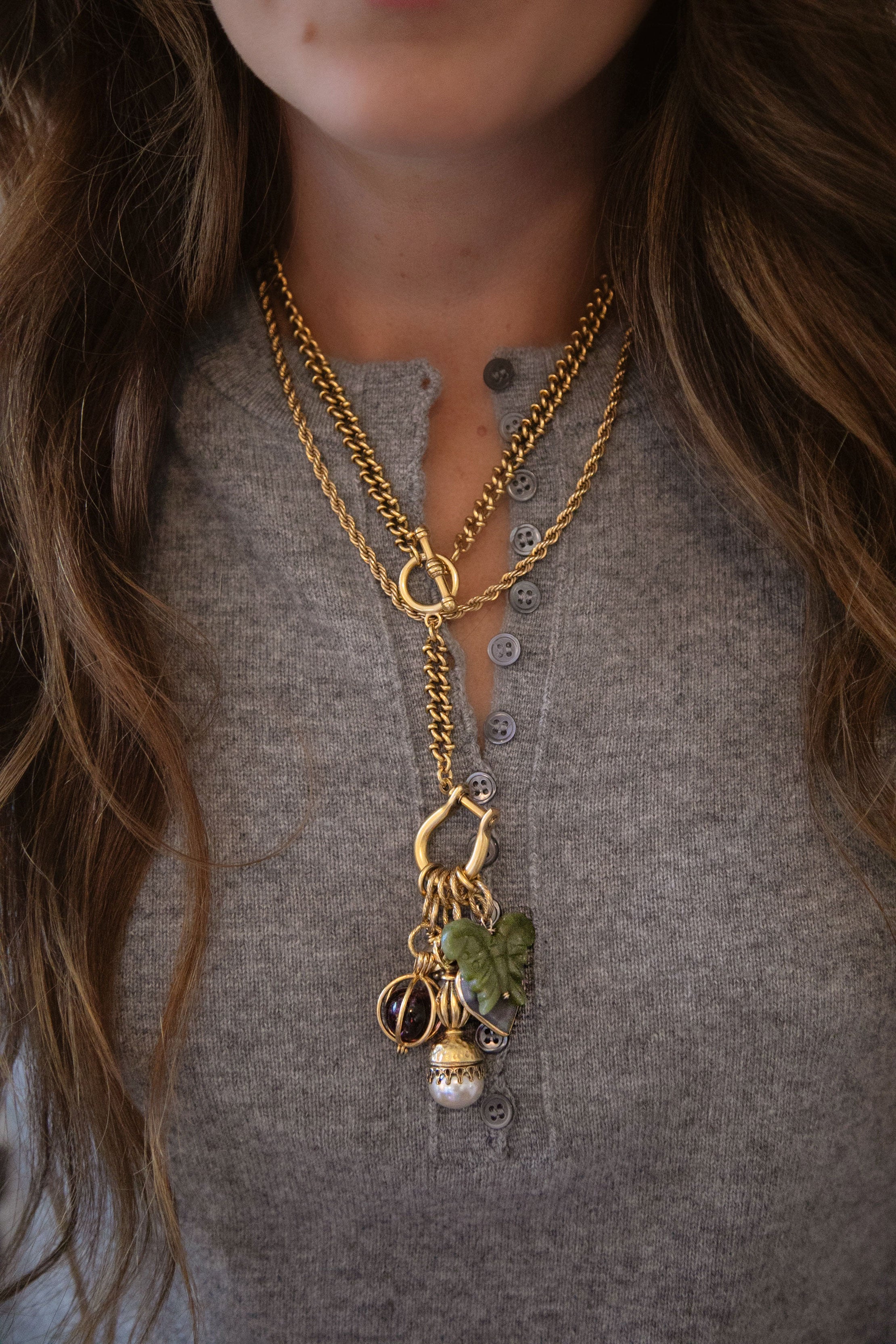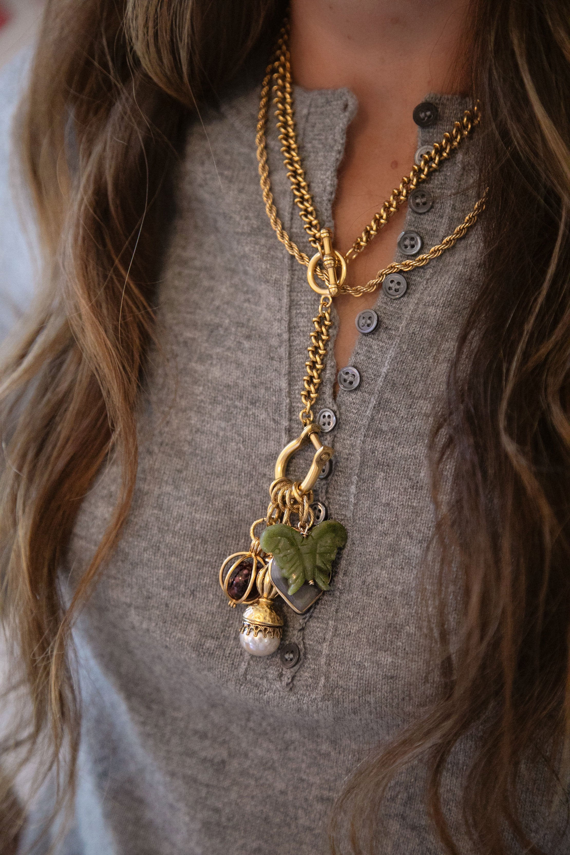 - 24k antique gold plated chain adorned with a nautical link charm holder adorned with our favorite assortment of vintage charms, semi-precious stones and mementos compiled over the past decade