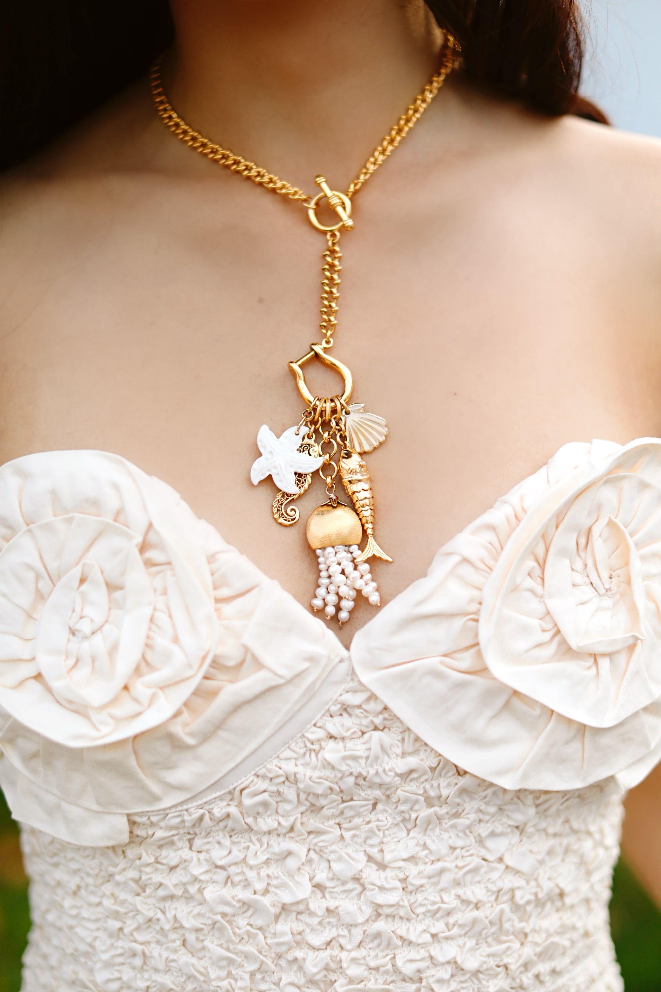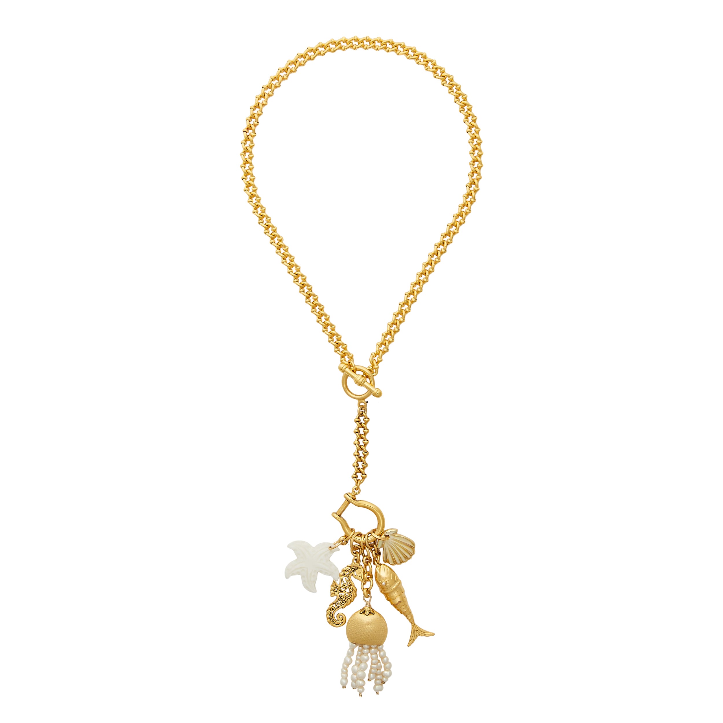 - 24k antique gold plated chain adorned with a nautical link charm holder holding our favorite assortment of sea-inspired charms -- some are made from vintage components! Charms include MOP and freshwater pearl detailing.