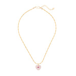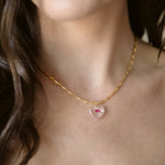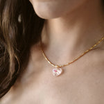 - A mini rose quartz heart with gemstone inlay slides along a 24k antique gold plated twisted hayseed chain