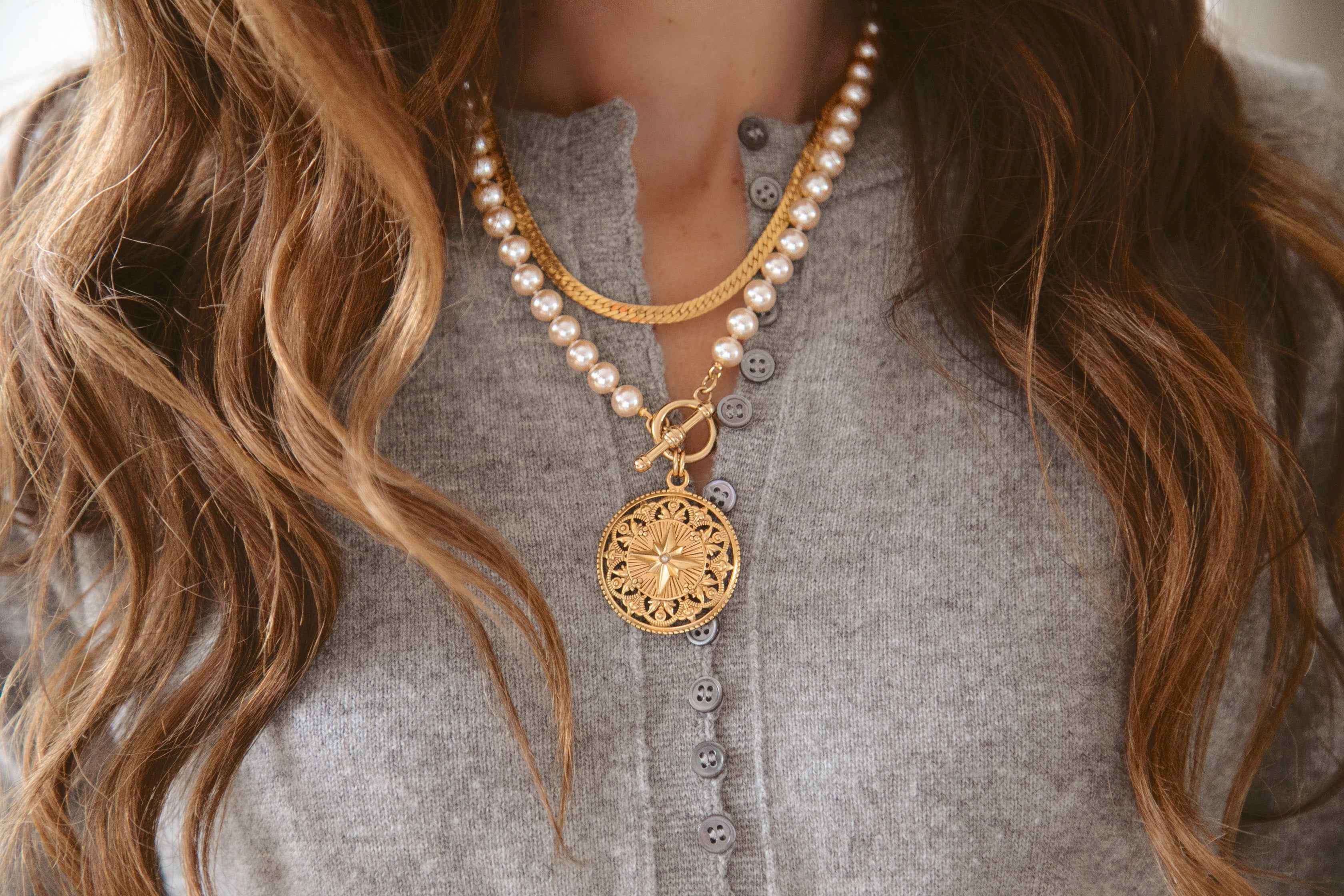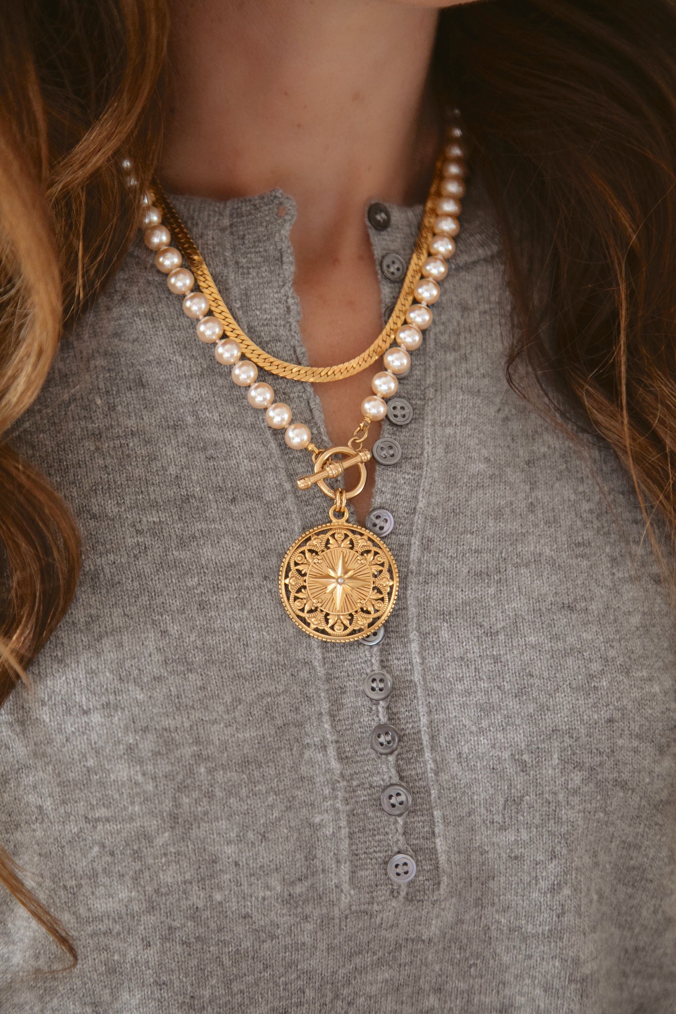 - A 24k antique gold plated brass pendant hangs from a strand of knotted glass pearls
