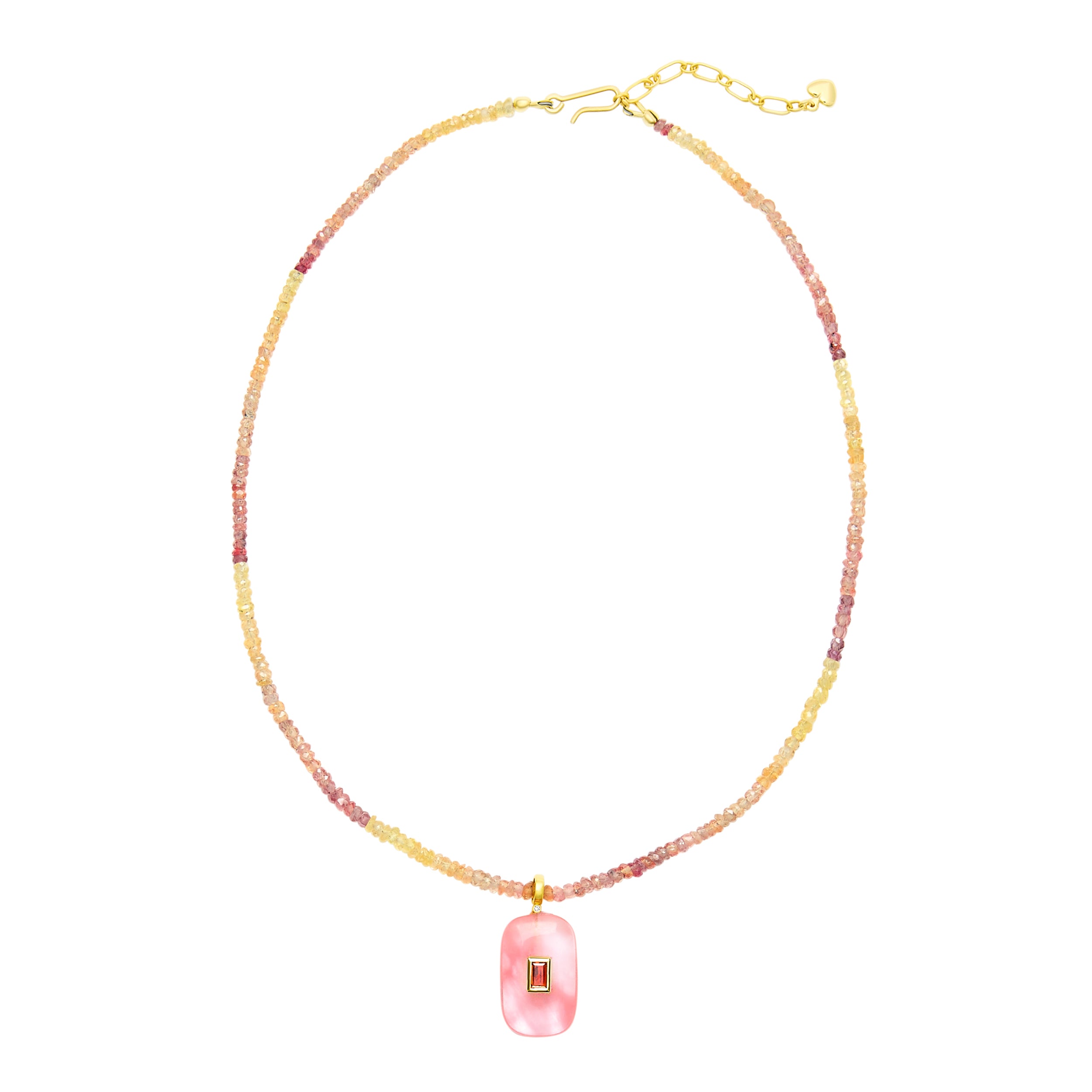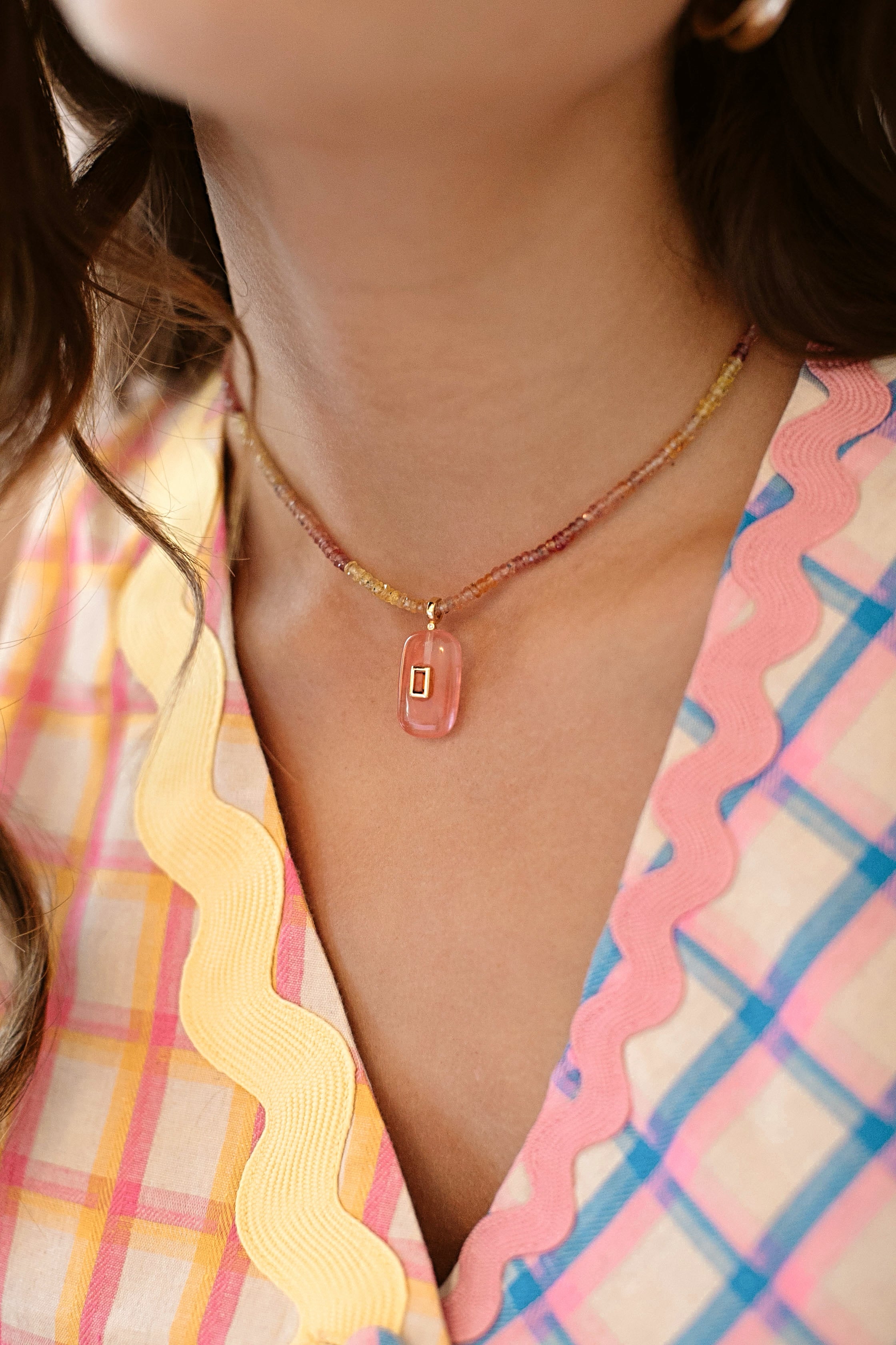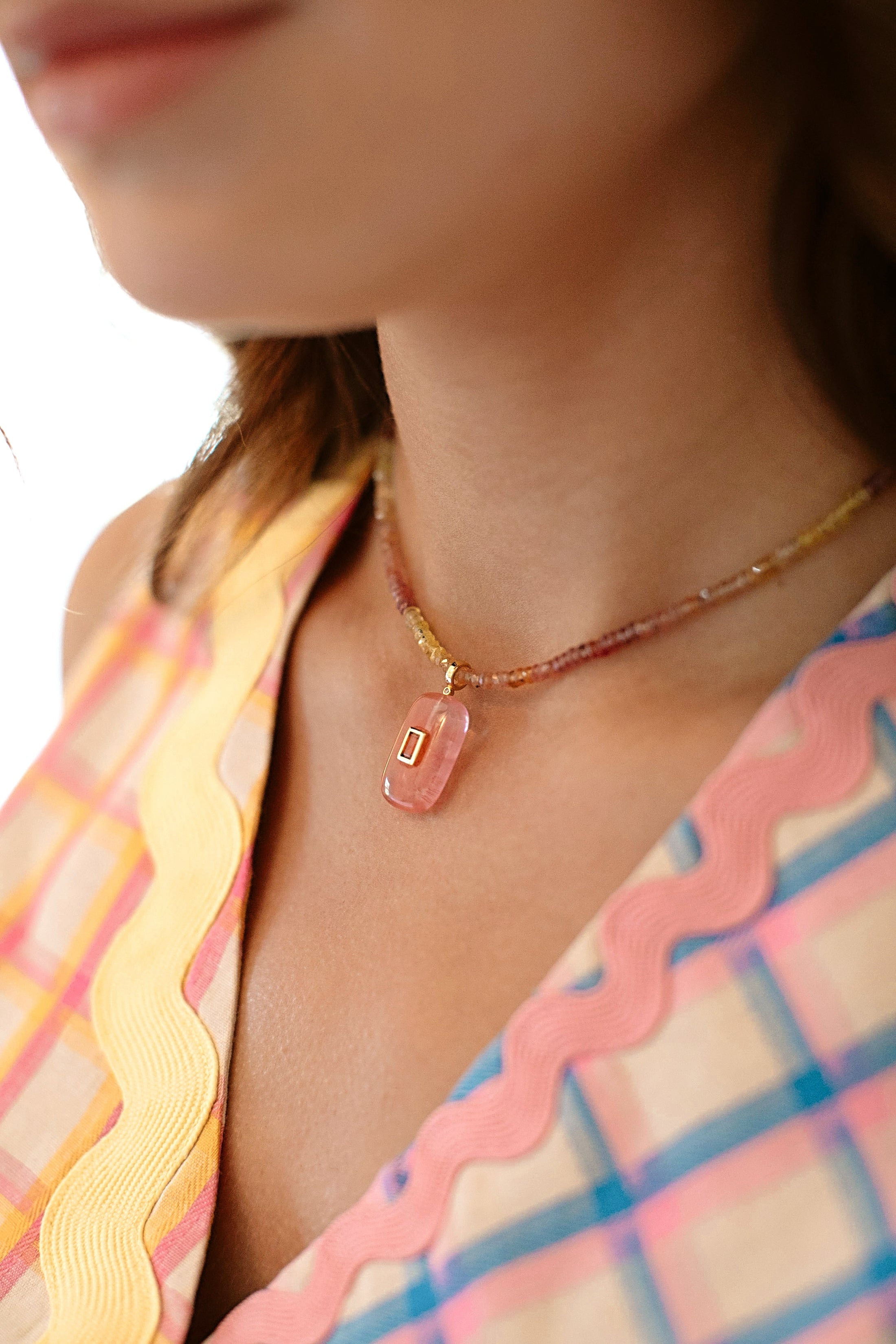 - A cherry quartz semi-precious gemstone pendant adorned with an inset crystal hangs from a strand of faceted yellow and orange shaded sapphire rondelle beads