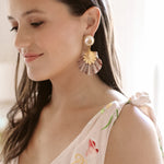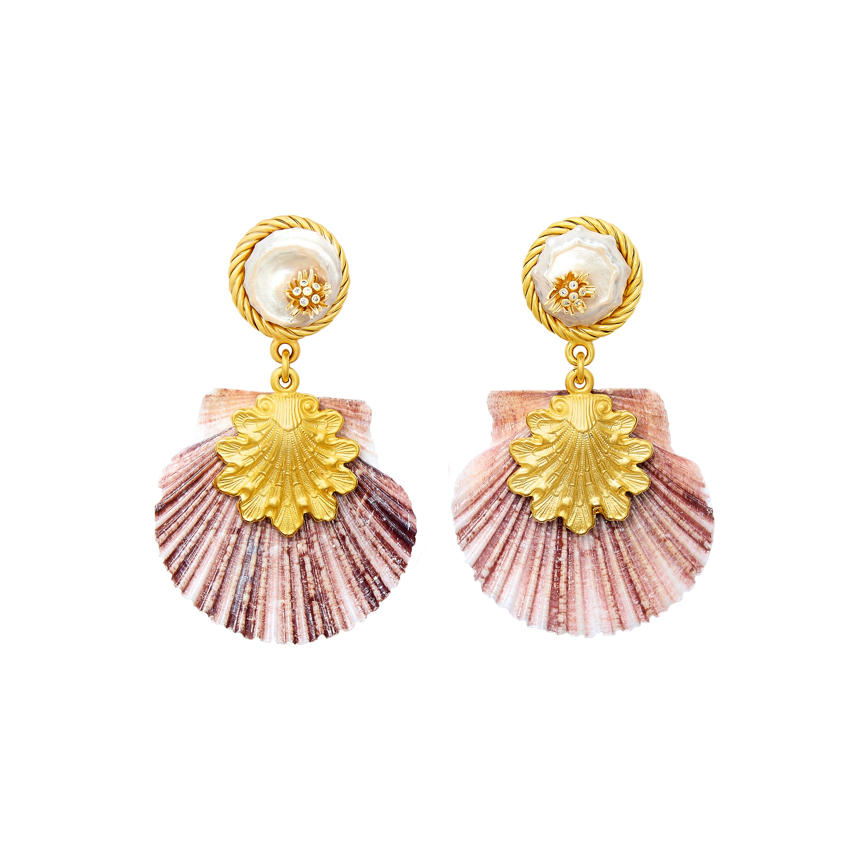- Baby flat scallops adorned with 24k antique gold plated shells hang from twisted rope toppers set with a cut shell top and gold detailing on stainless steel hypoallergenic posts