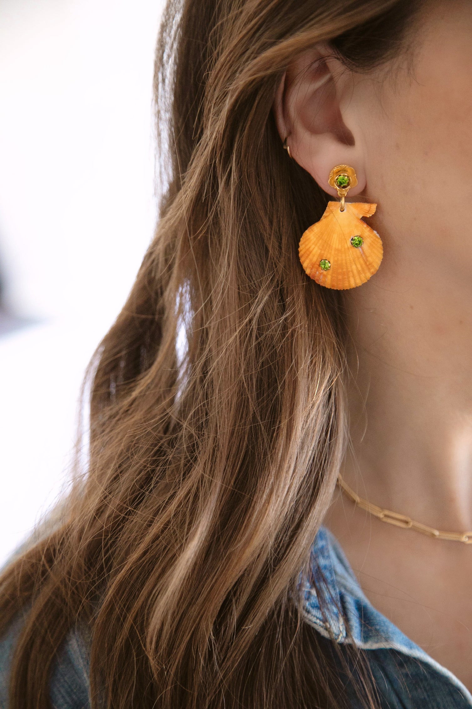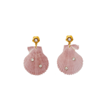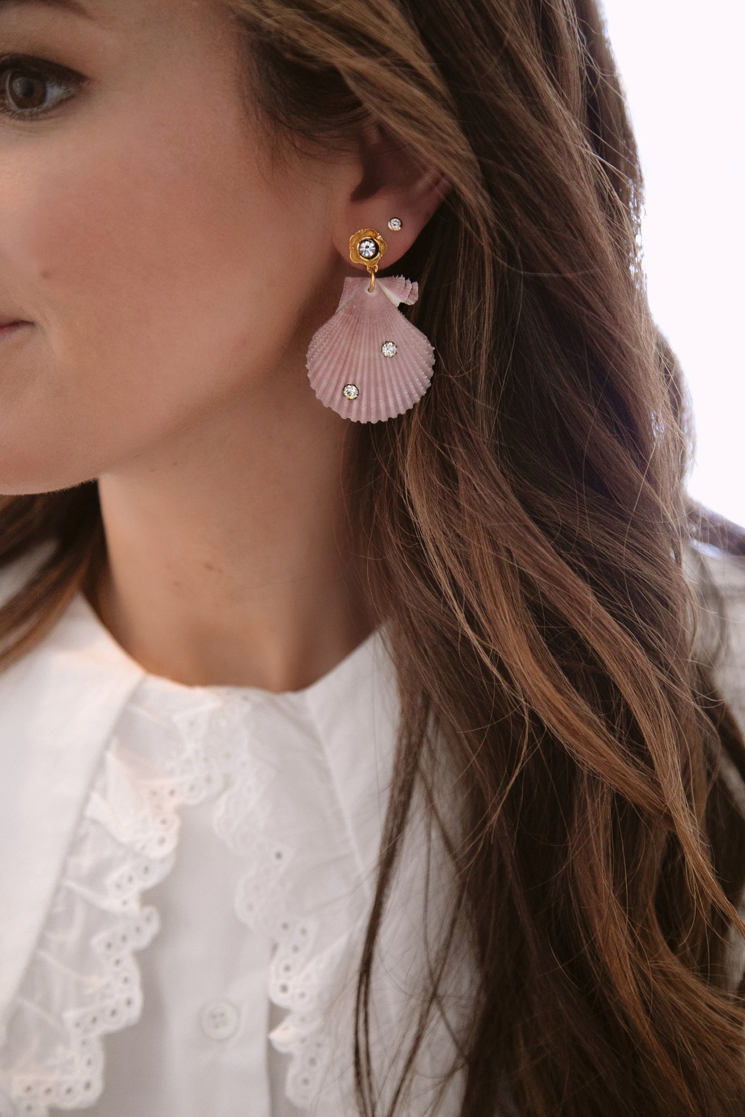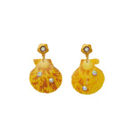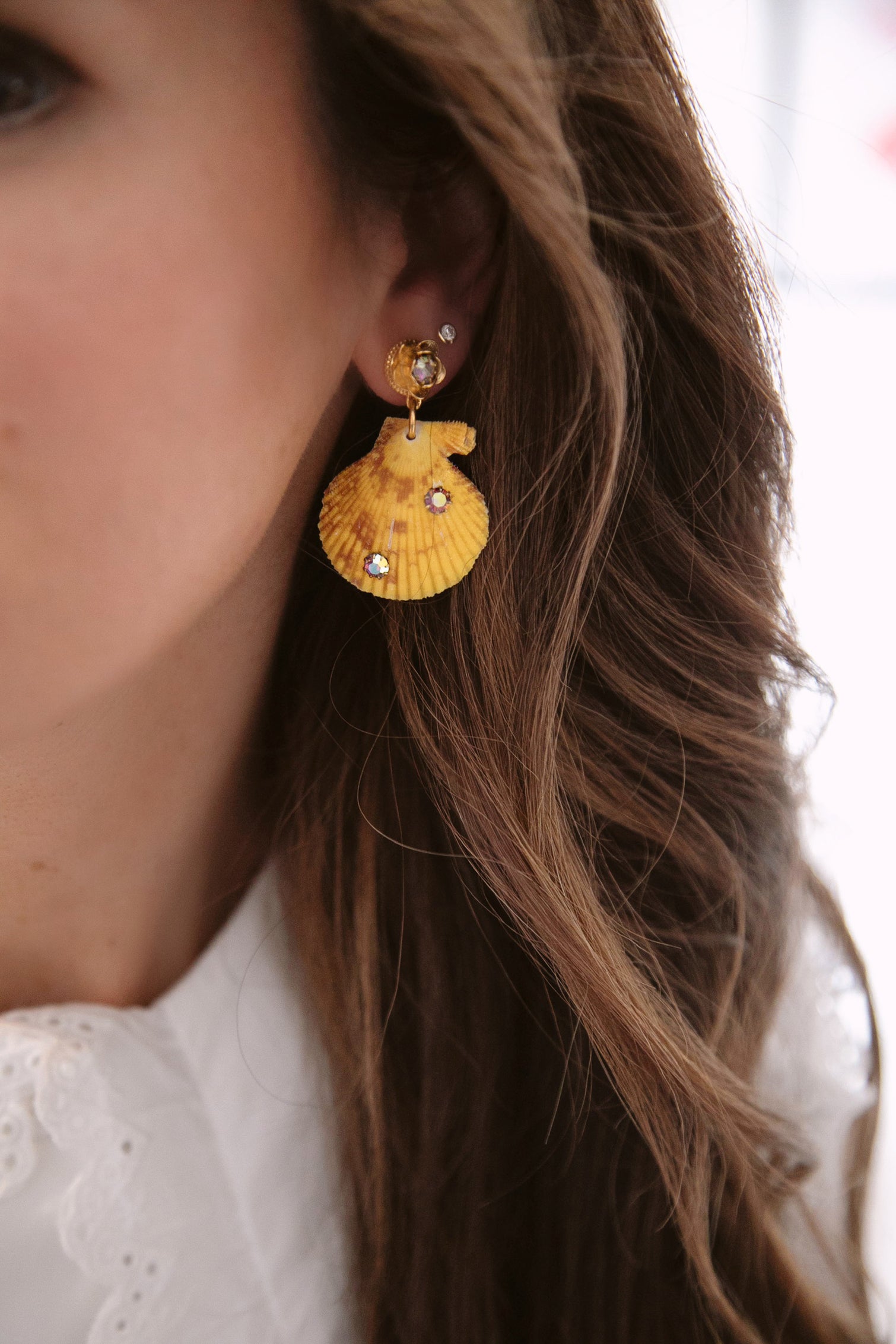 - Swarovski crystals set in Scallop Shells hang from 24k antique gold plated flower toppers set with crystals on stainless steel hypoallergenic posts