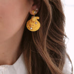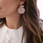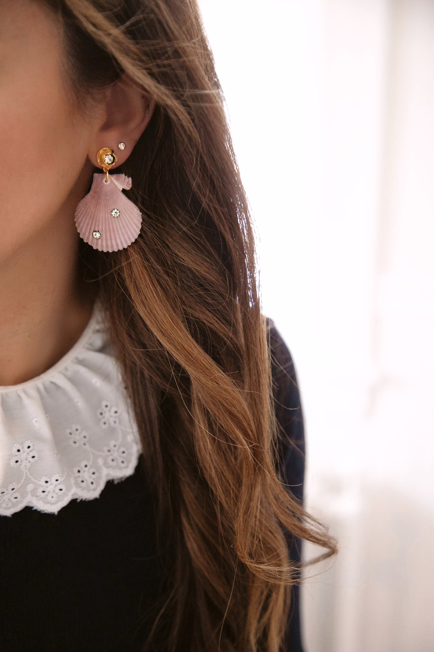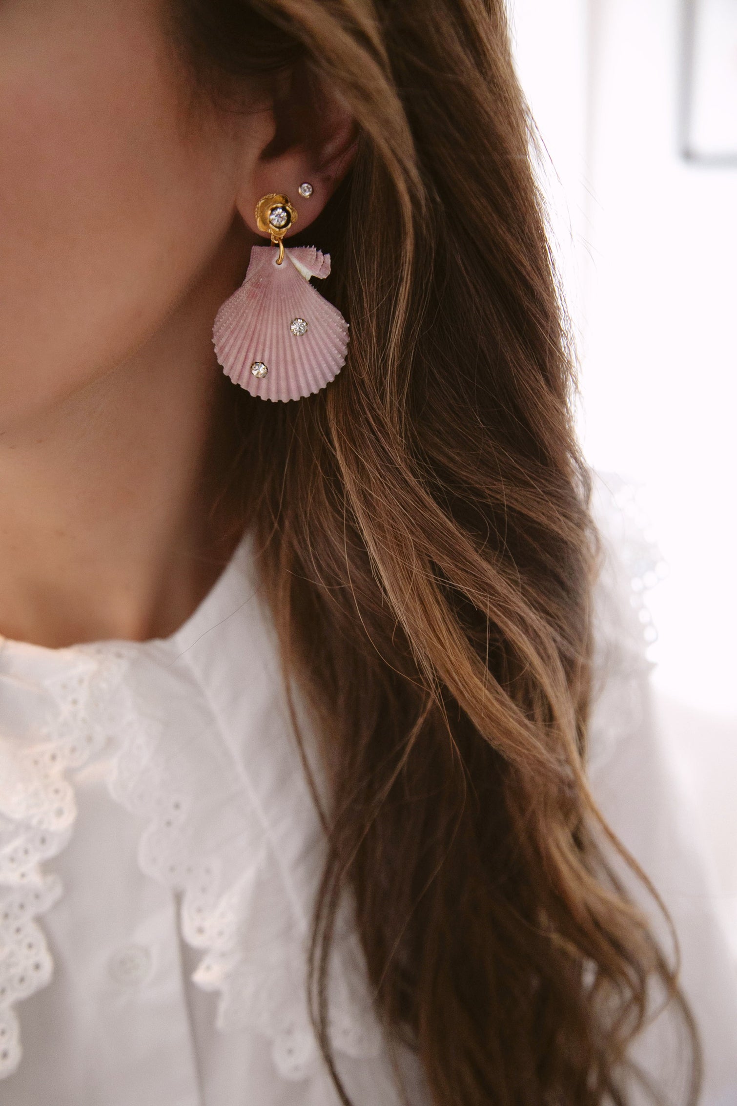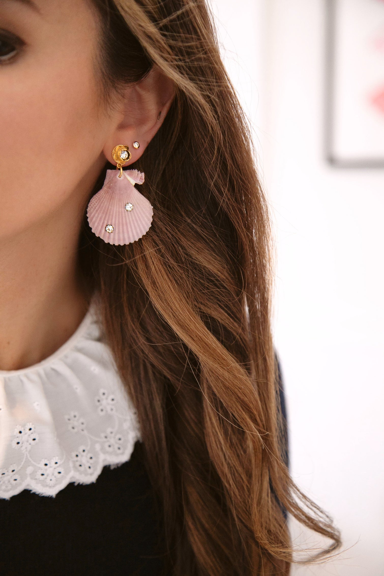 - Swarovski crystals set in Scallop Shells hang from 24k antique gold plated flower toppers set with crystals on stainless steel hypoallergenic posts