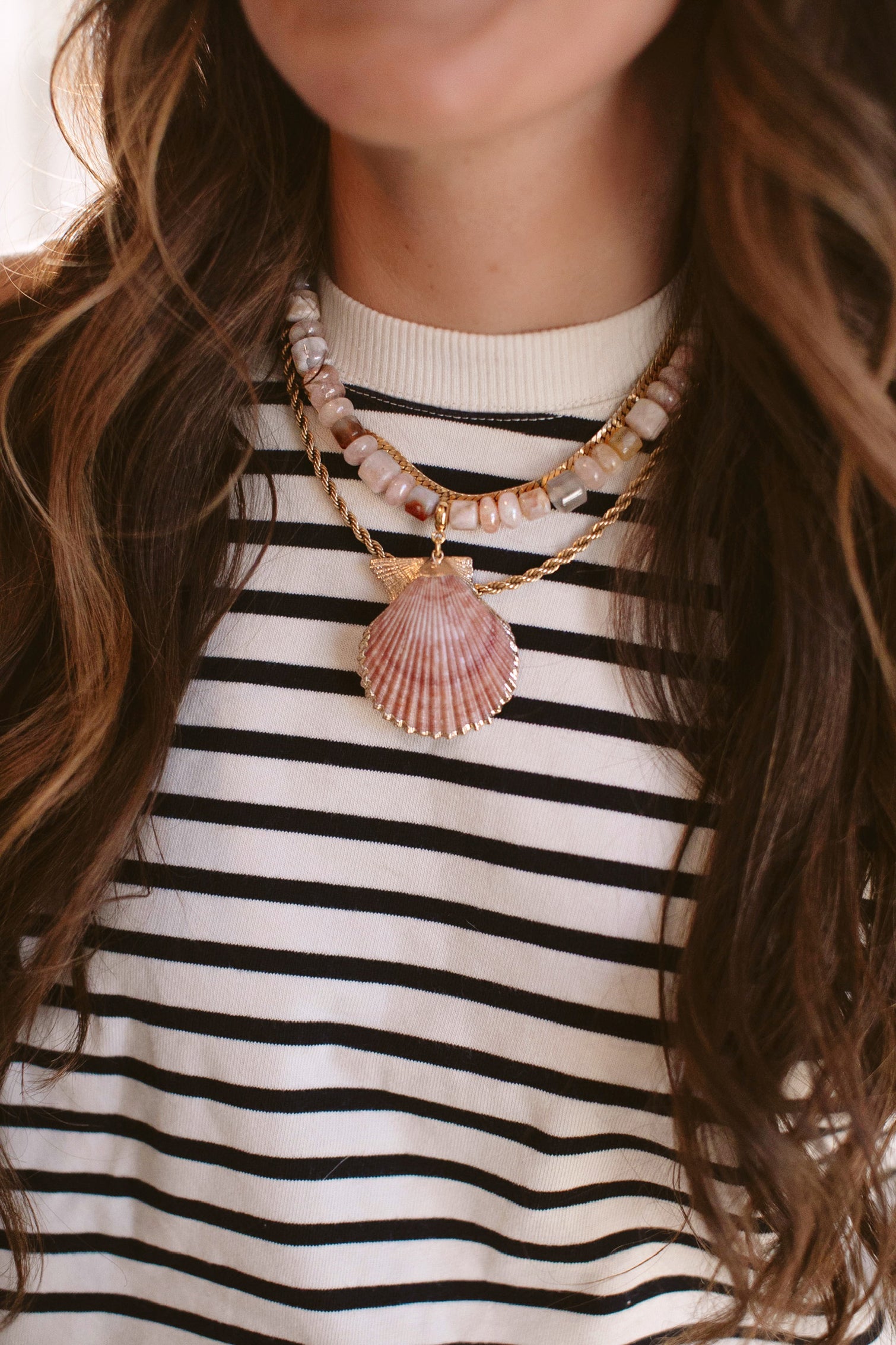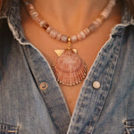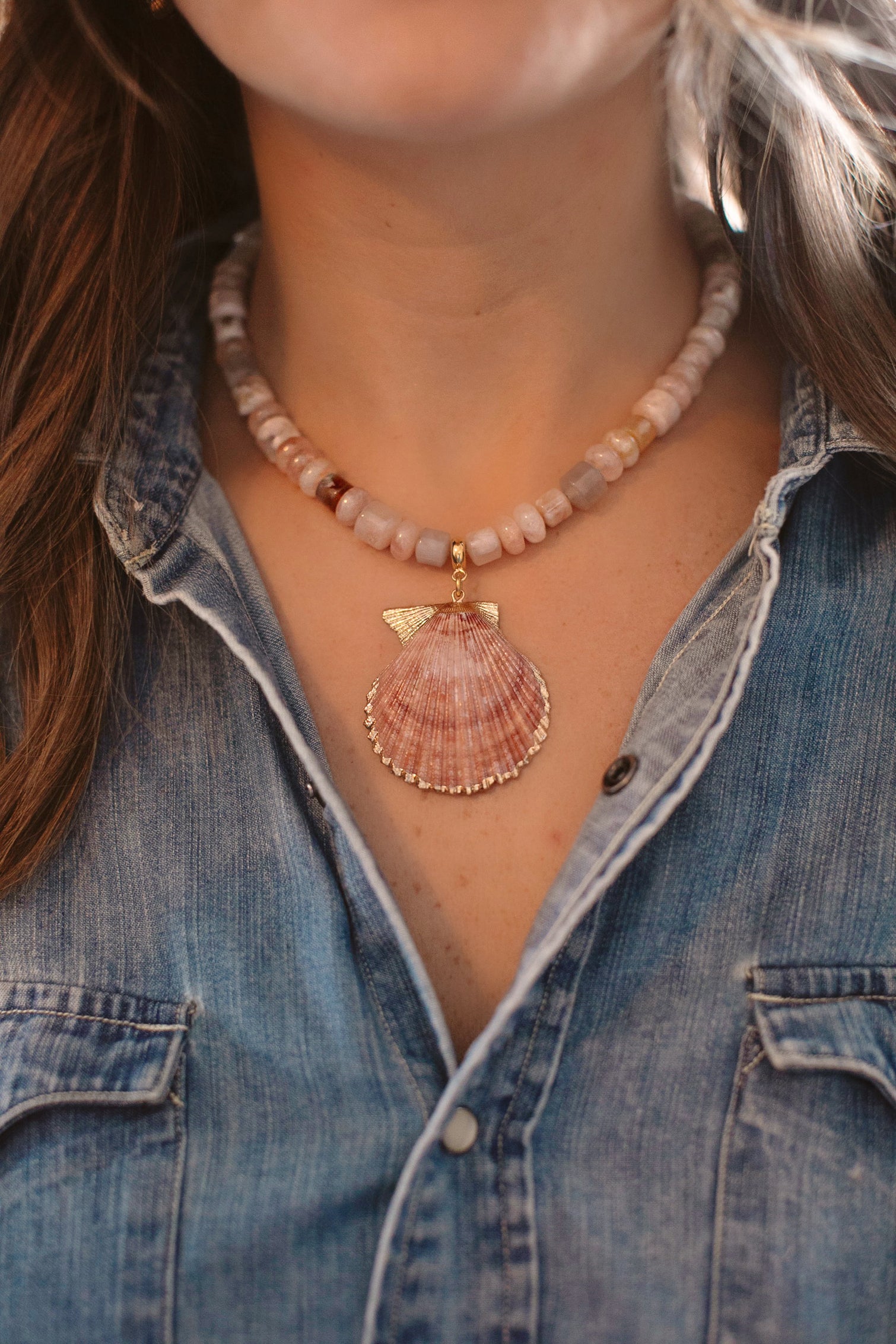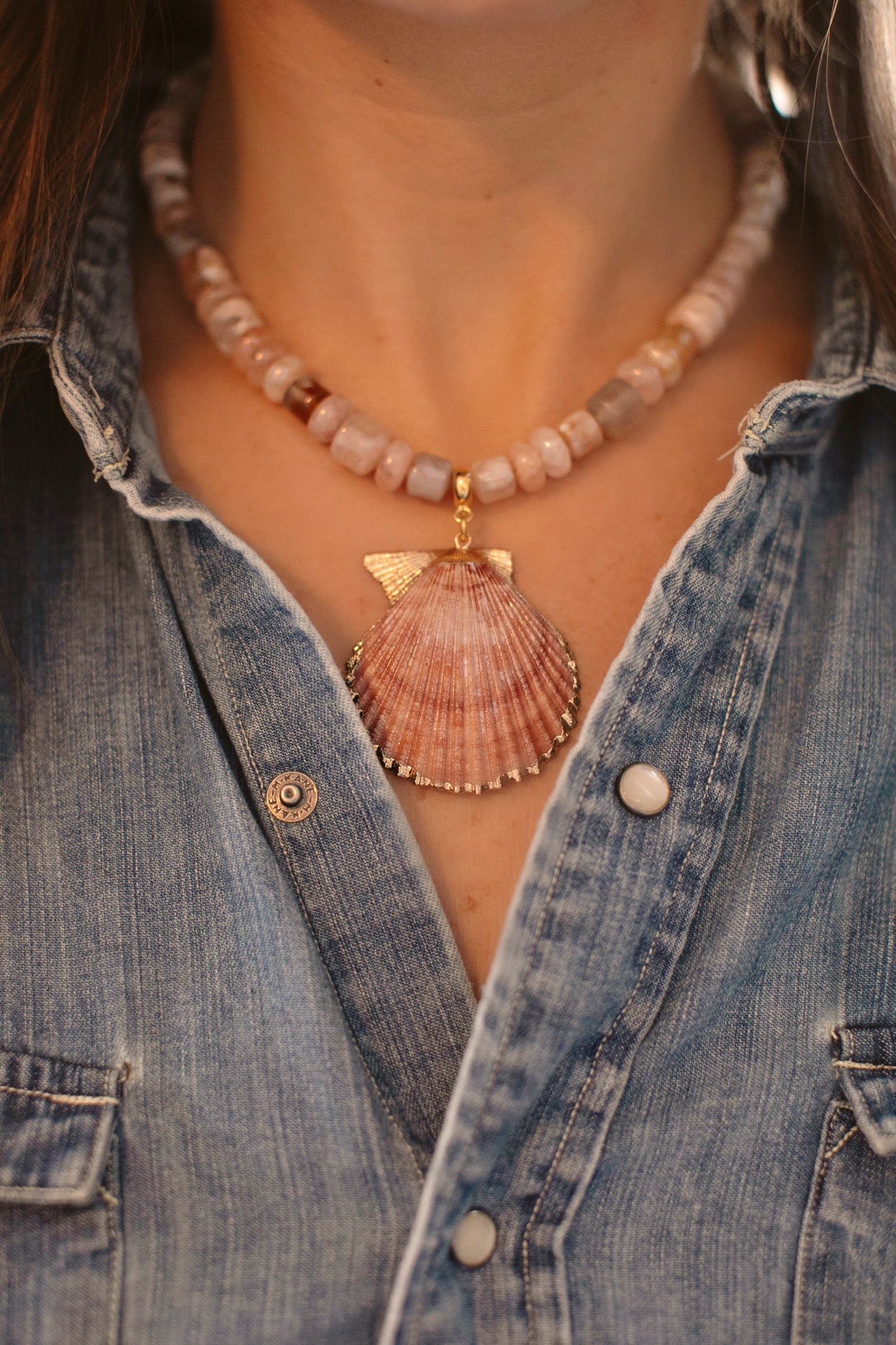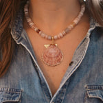 - A strand of semi-precious gemstone Flower Agate beads adorned with a gold rimmed Pecten Shell