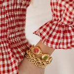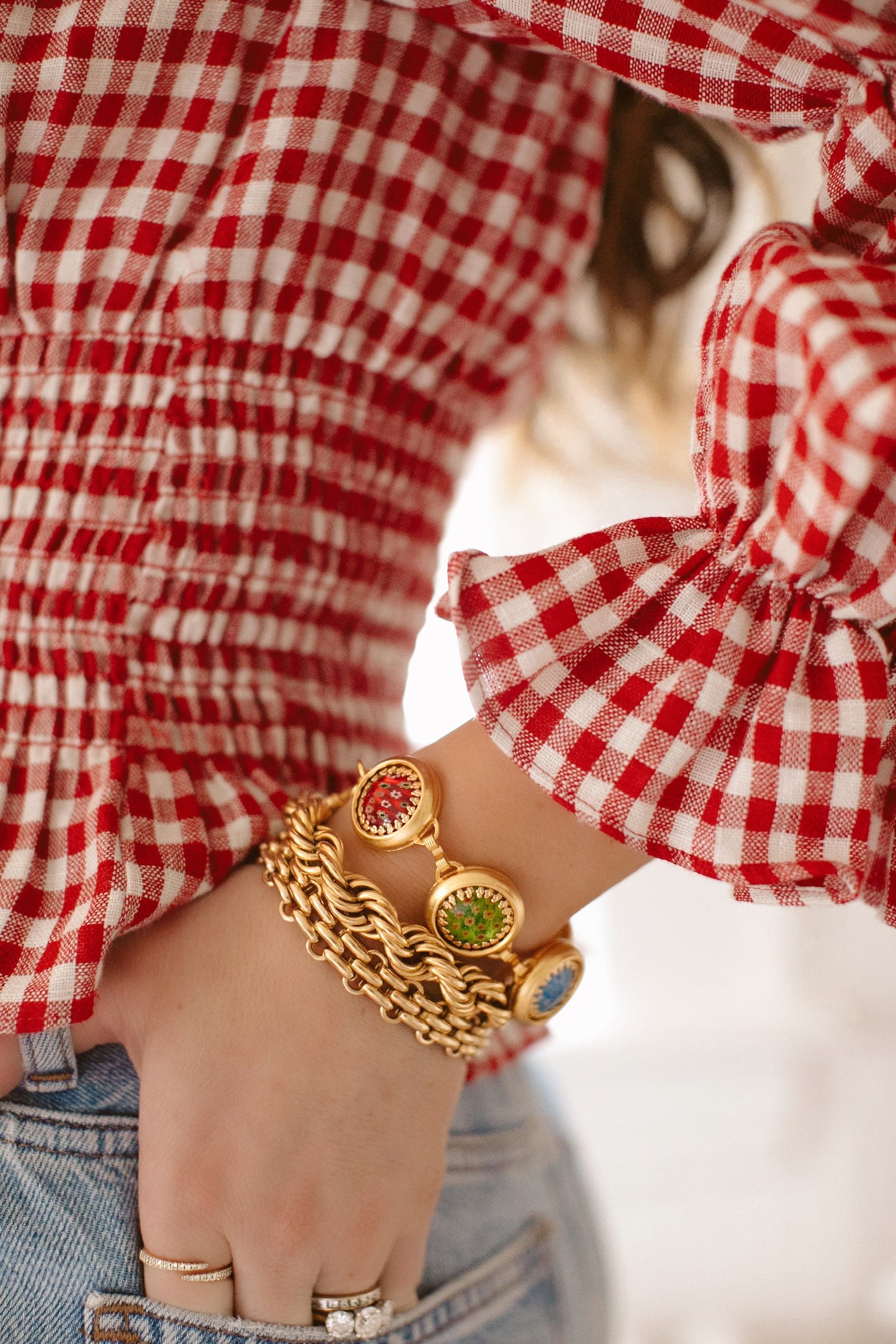 - Millefiori glass cabochons on 24k antique gold plated brass settings