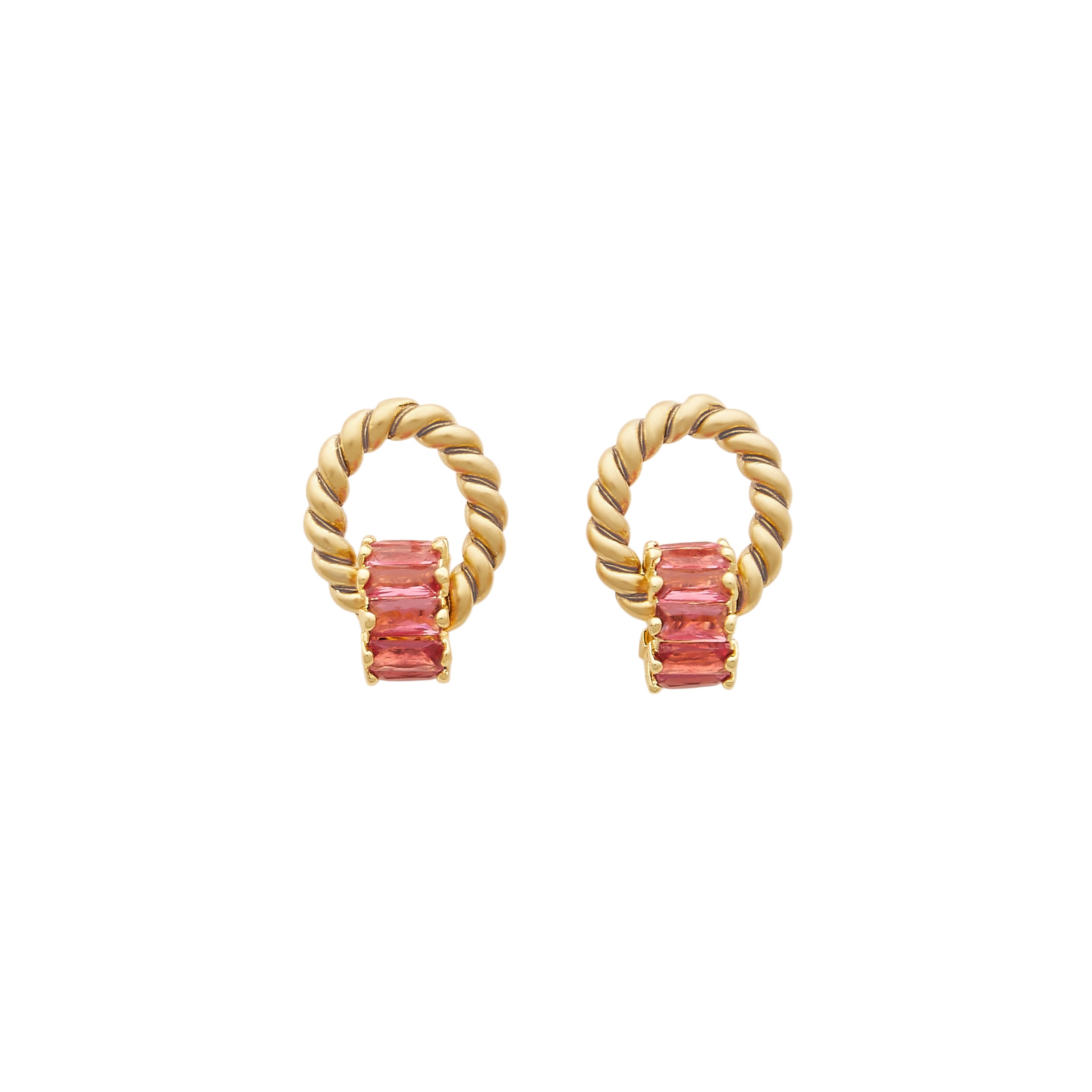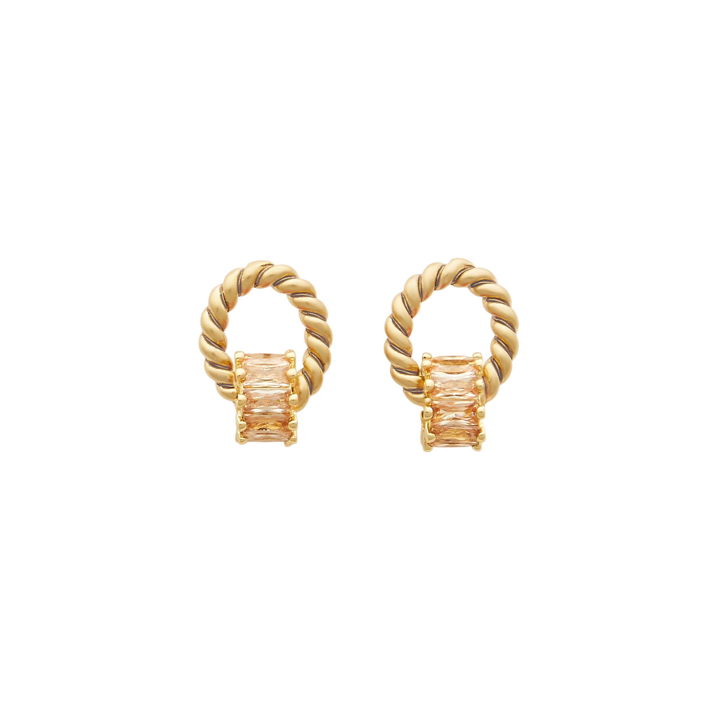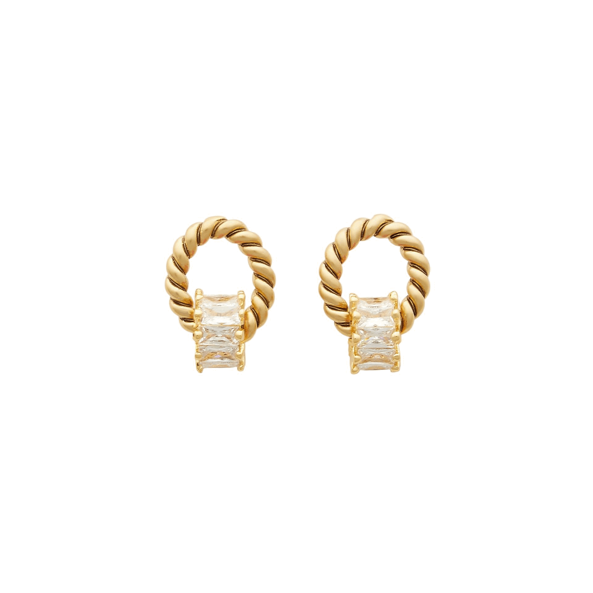 - A ring of crystal baguettes hangs from our signature 24k antique gold plated twisted toppers on stainless steel hypoallergenic posts