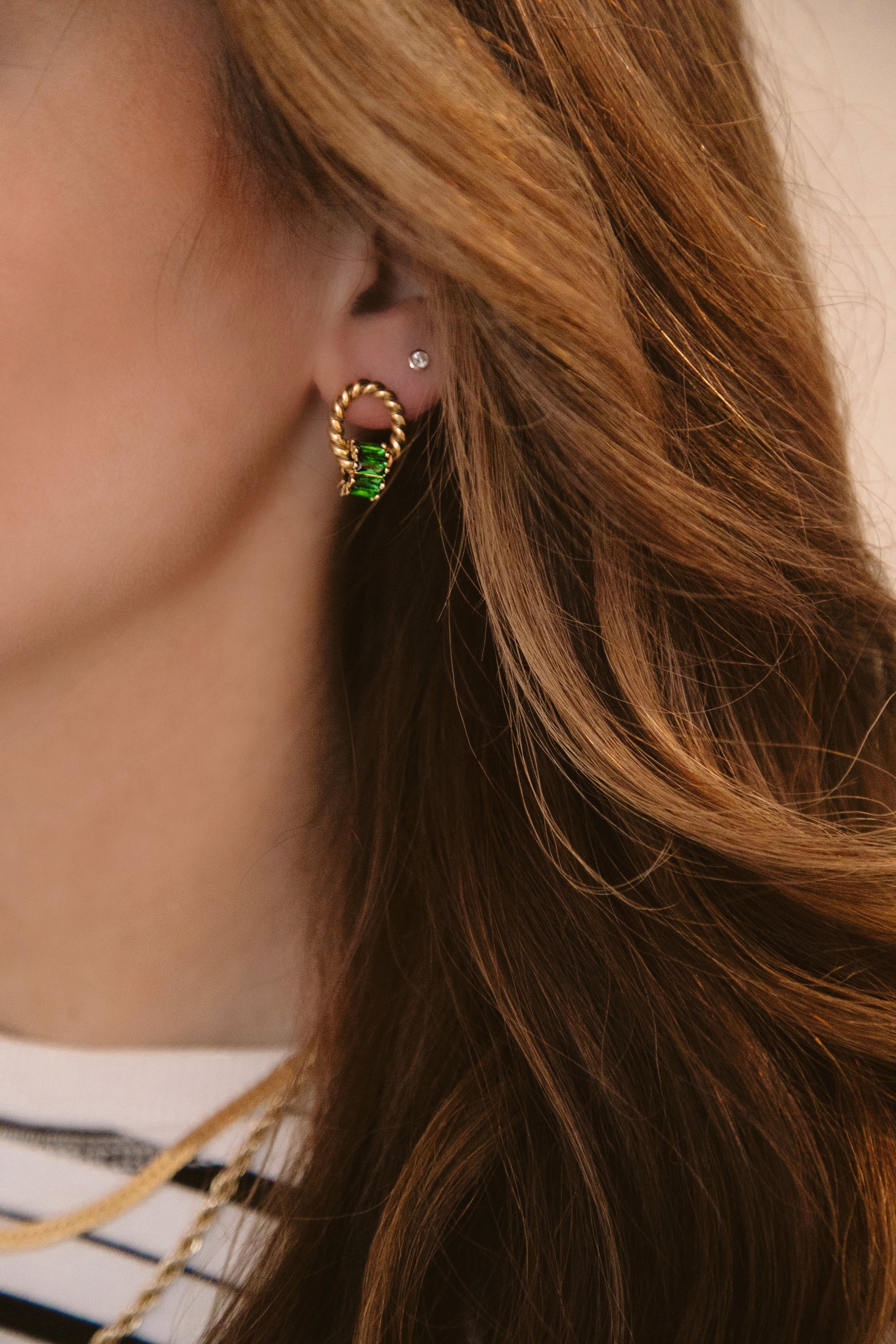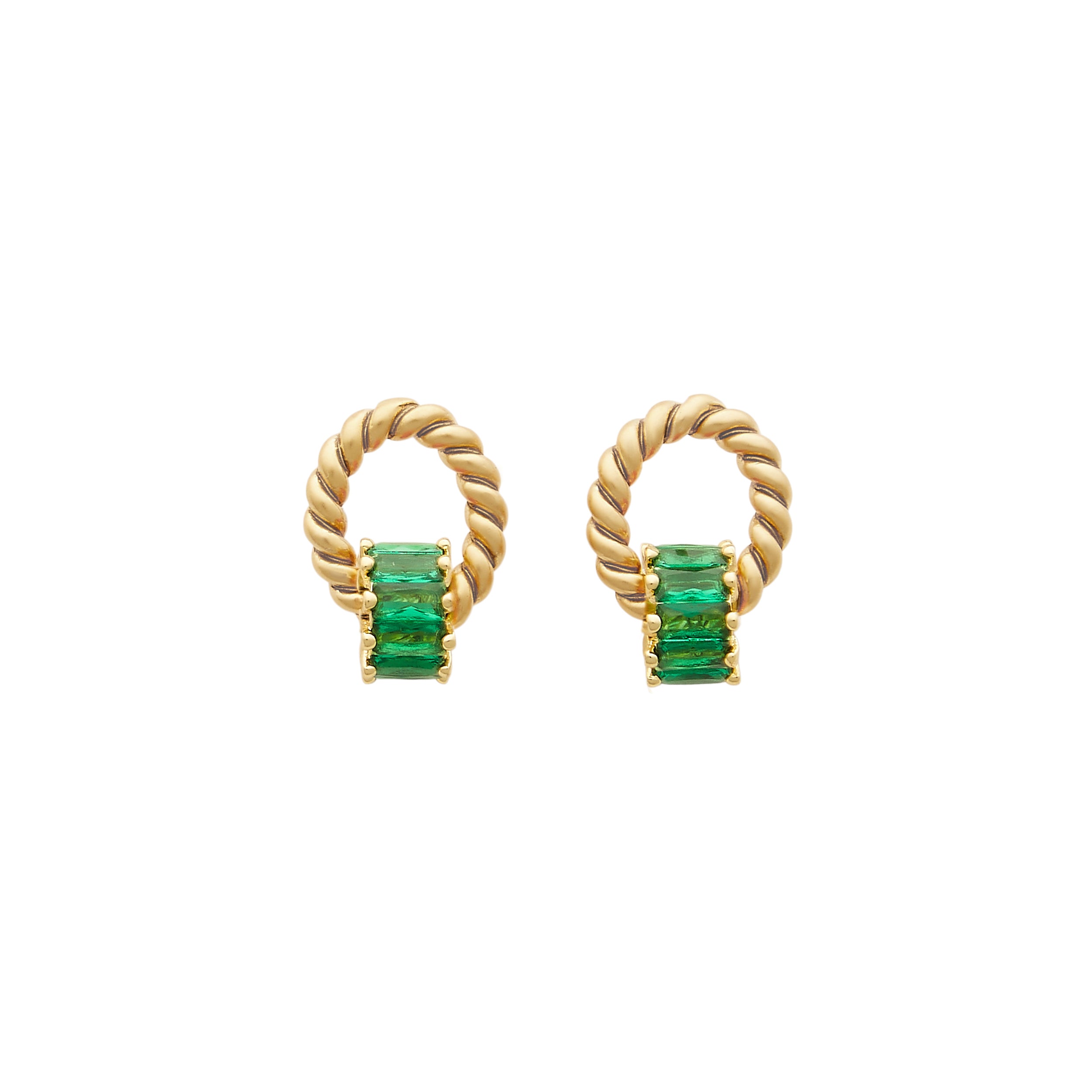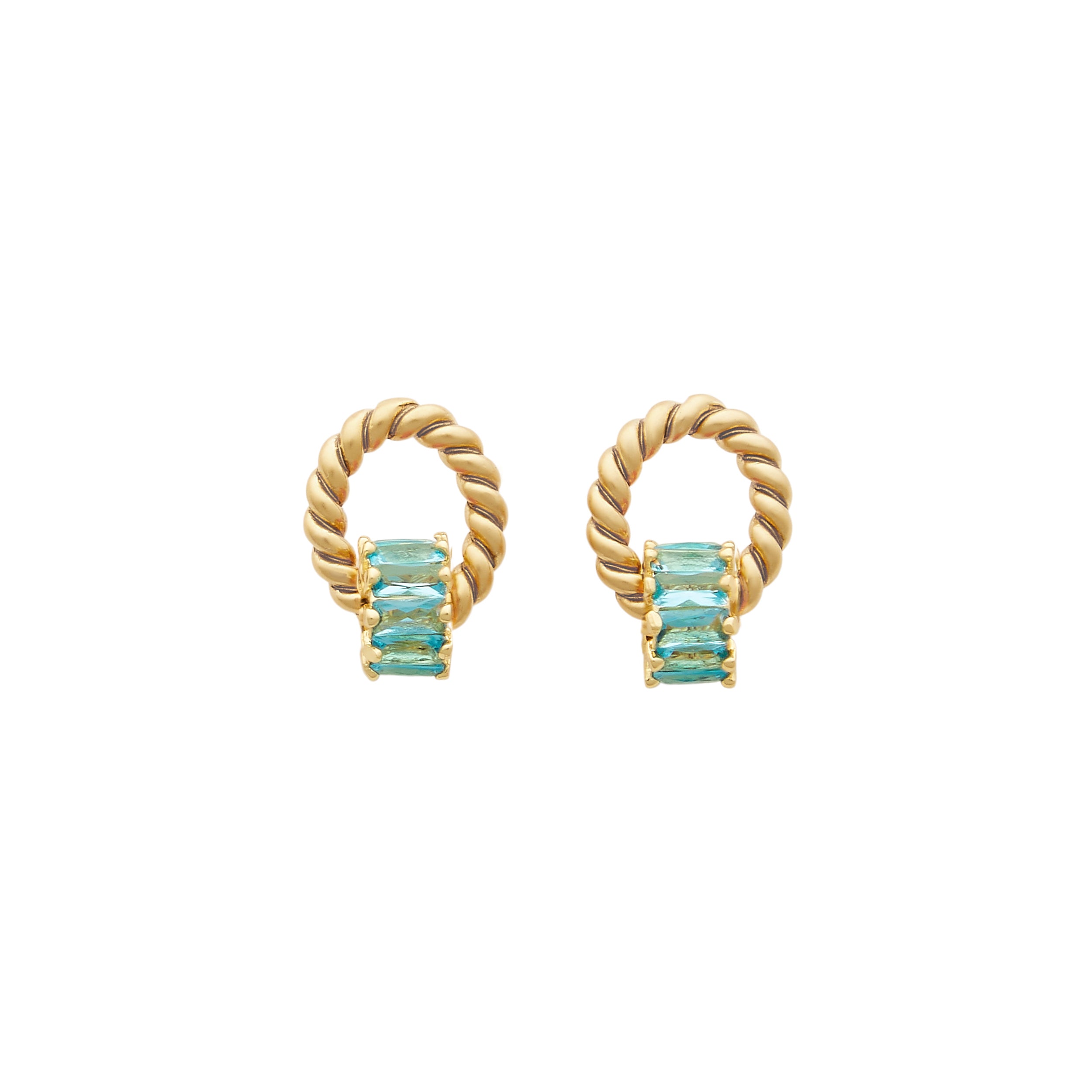 - A ring of crystal baguettes hangs from our signature 24k antique gold plated twisted toppers on stainless steel hypoallergenic posts