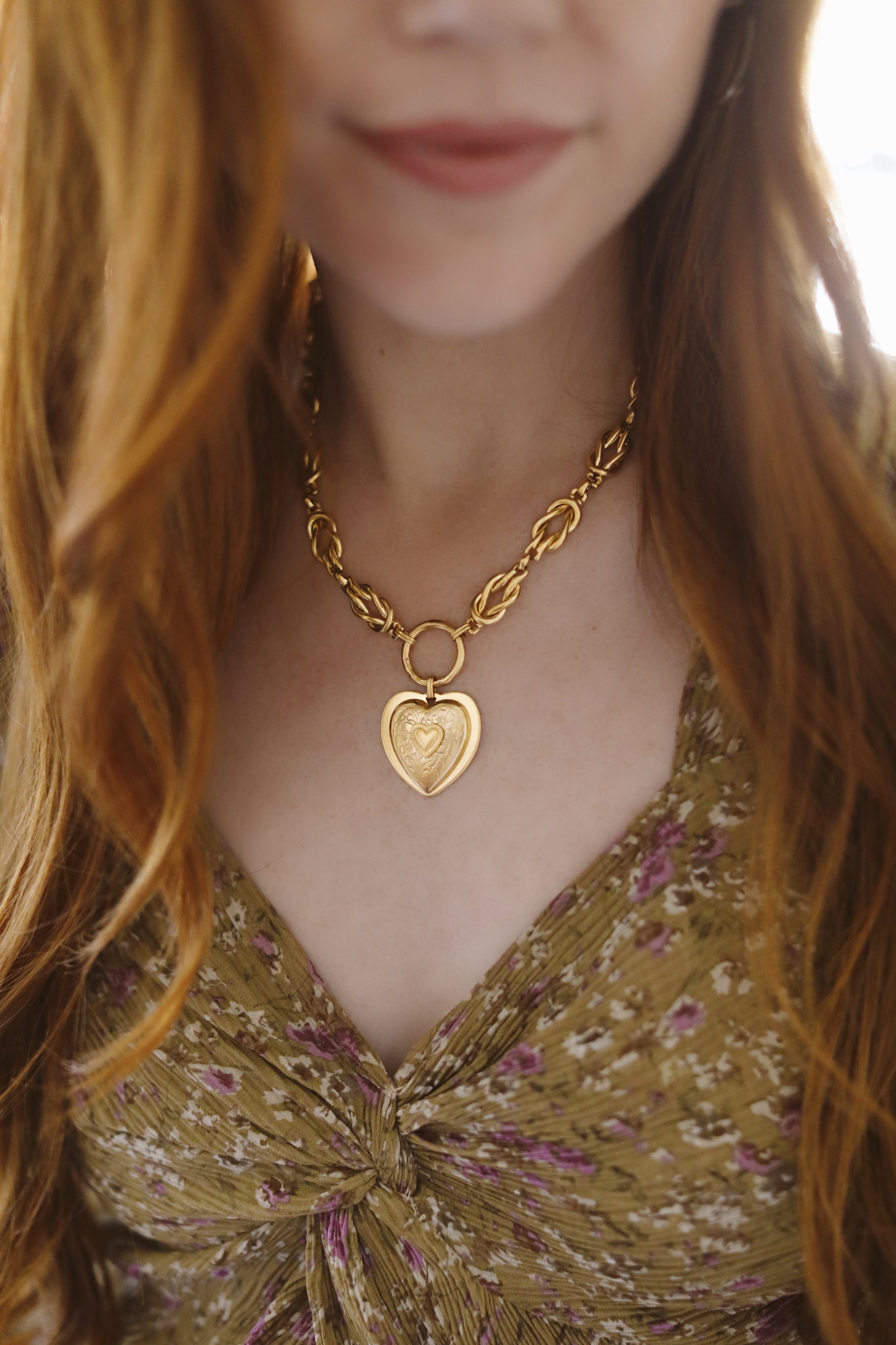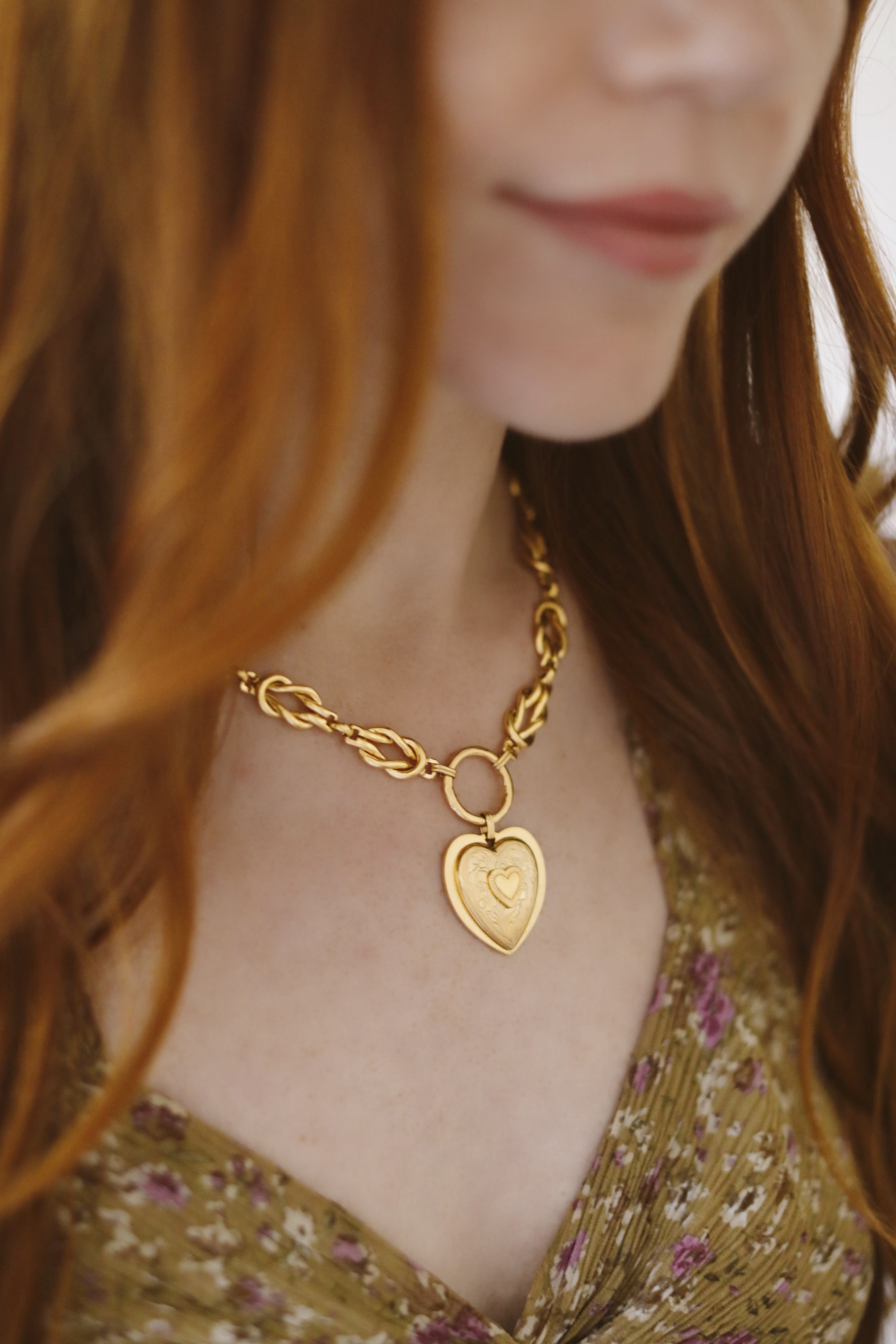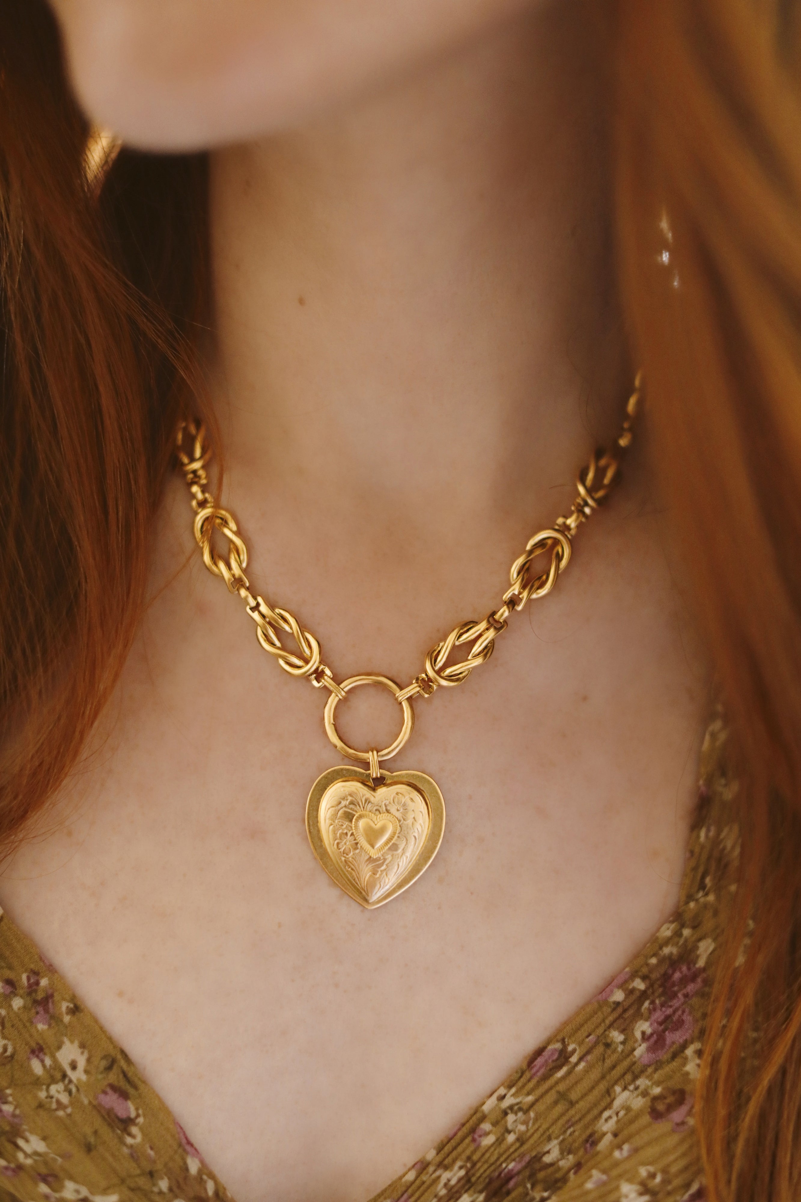 - A 24k antique gold plated heart pendant hands from 24k antique gold plated linked infinity knots