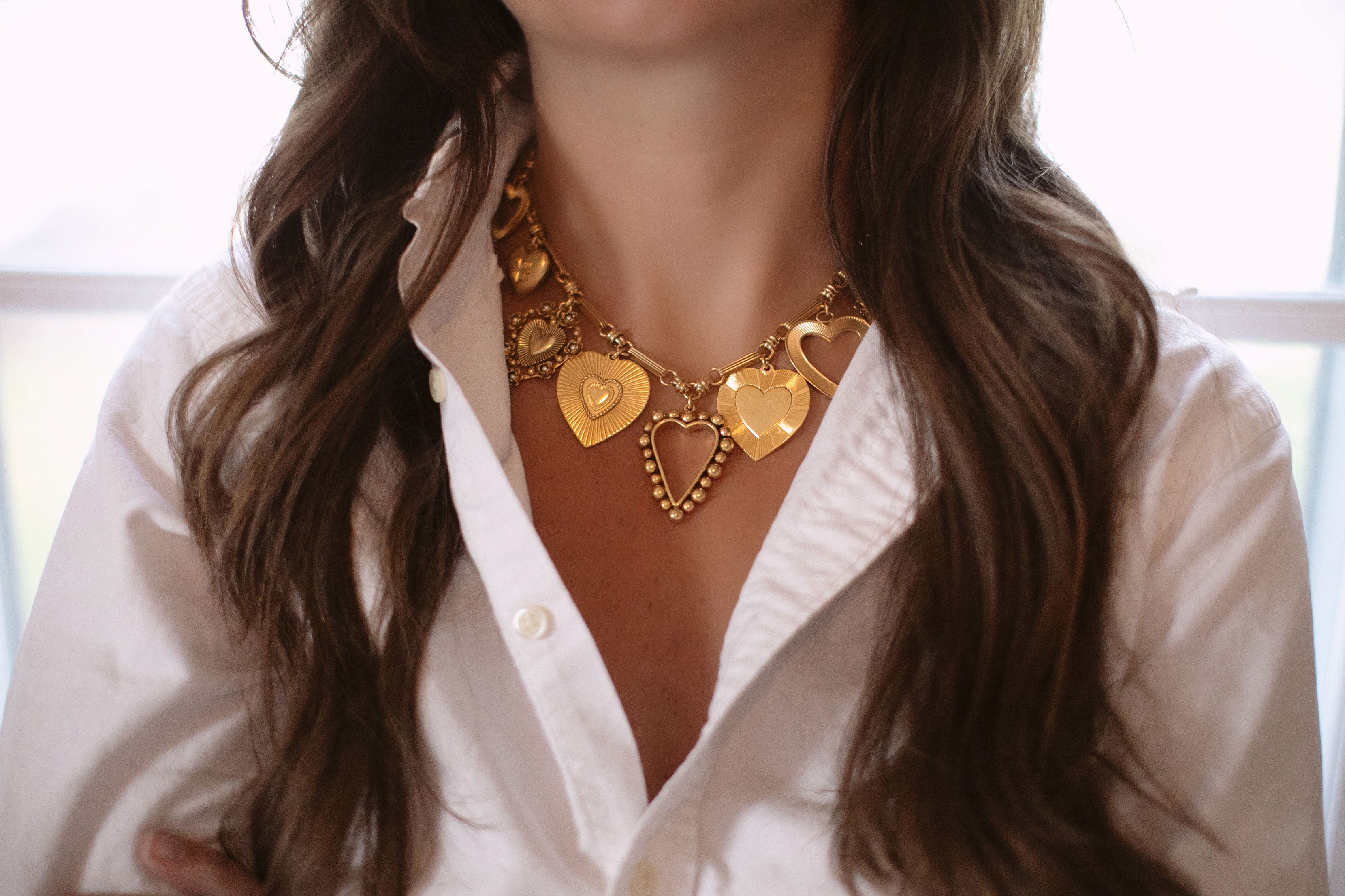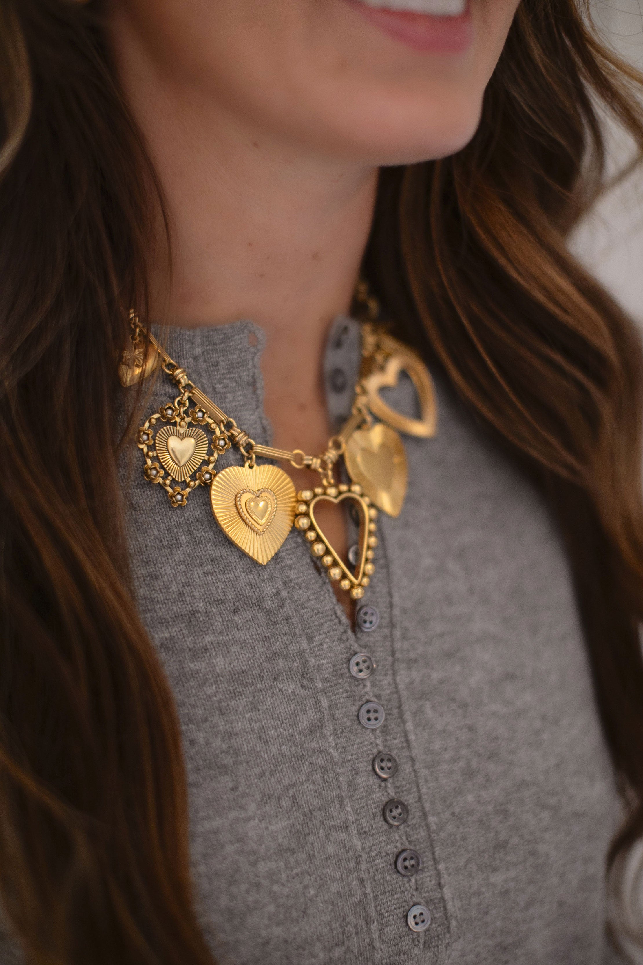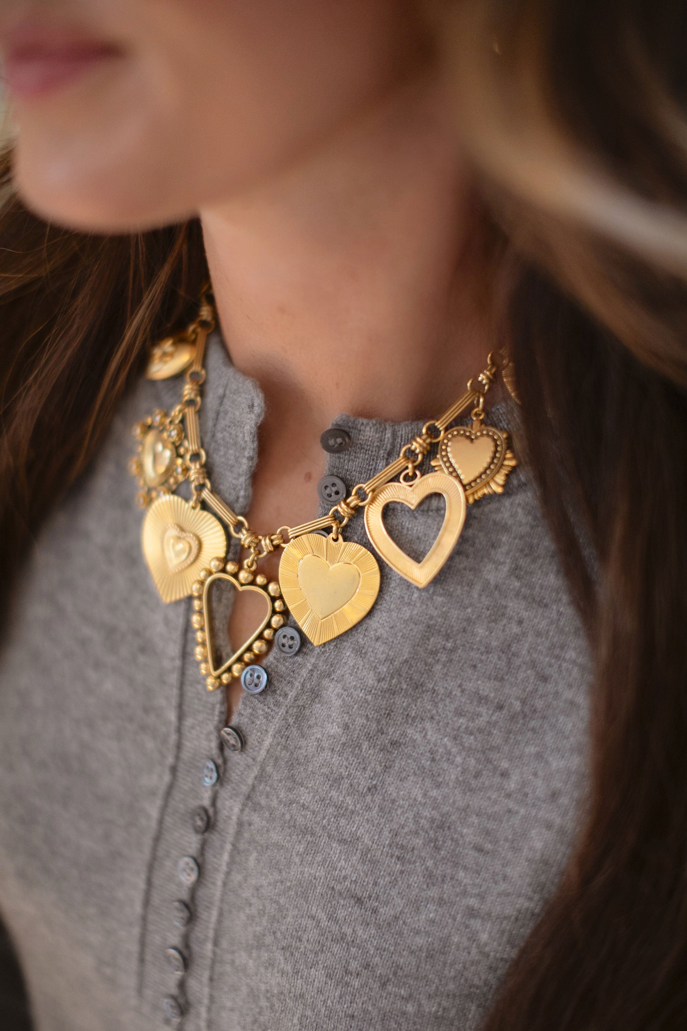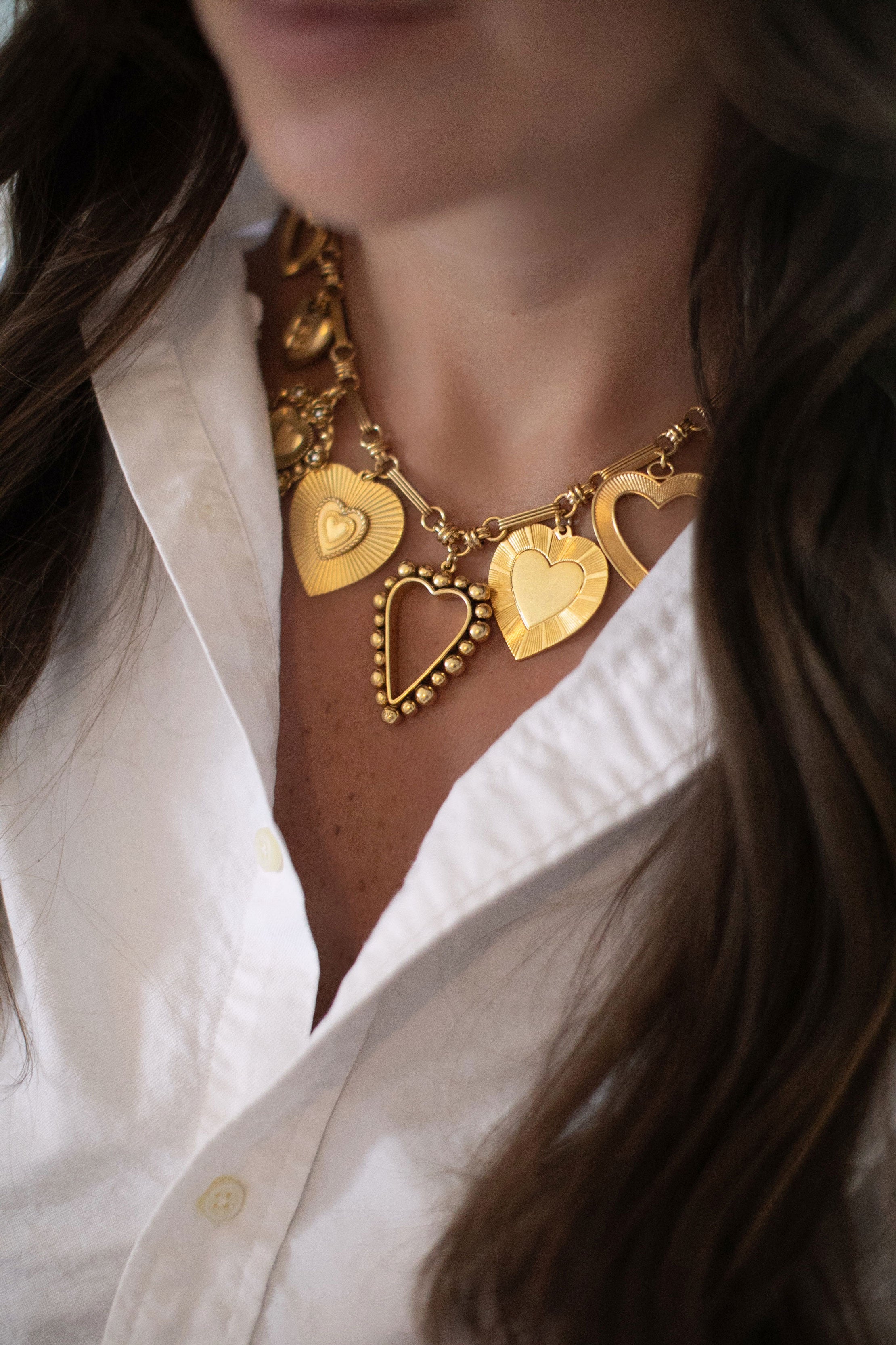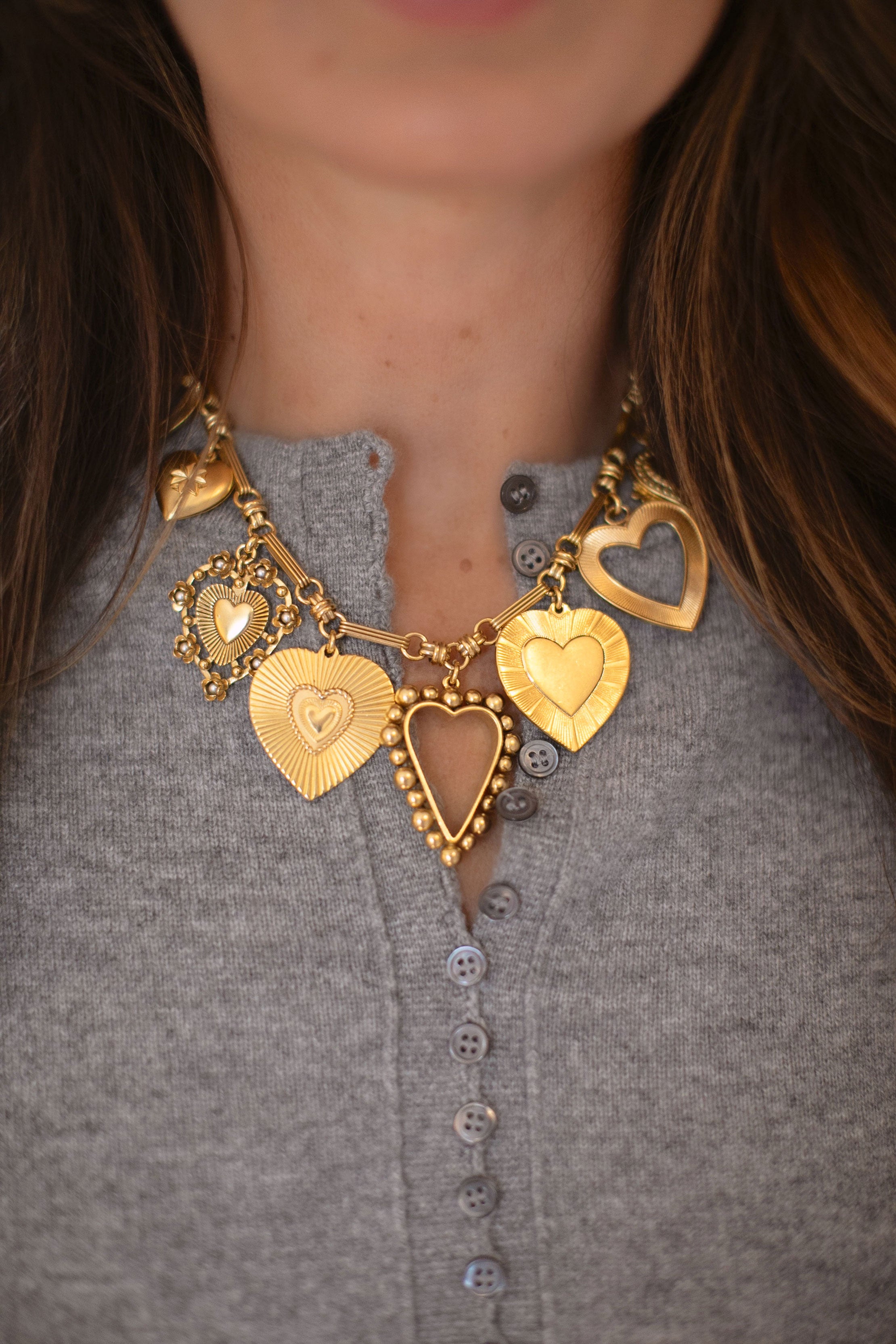 - A 24k antique gold plated brass chain with a variety of our favorite 24k antique gold plated brass heart pendants and charms - one is set with mini freshwater pearls