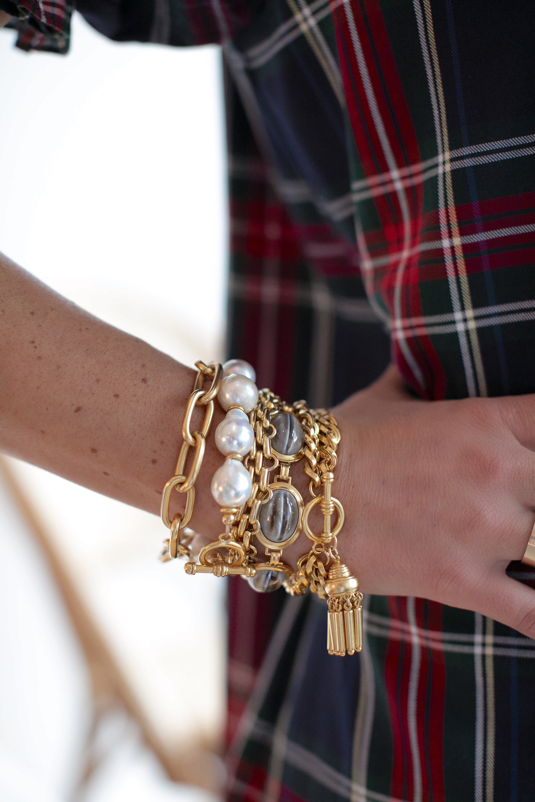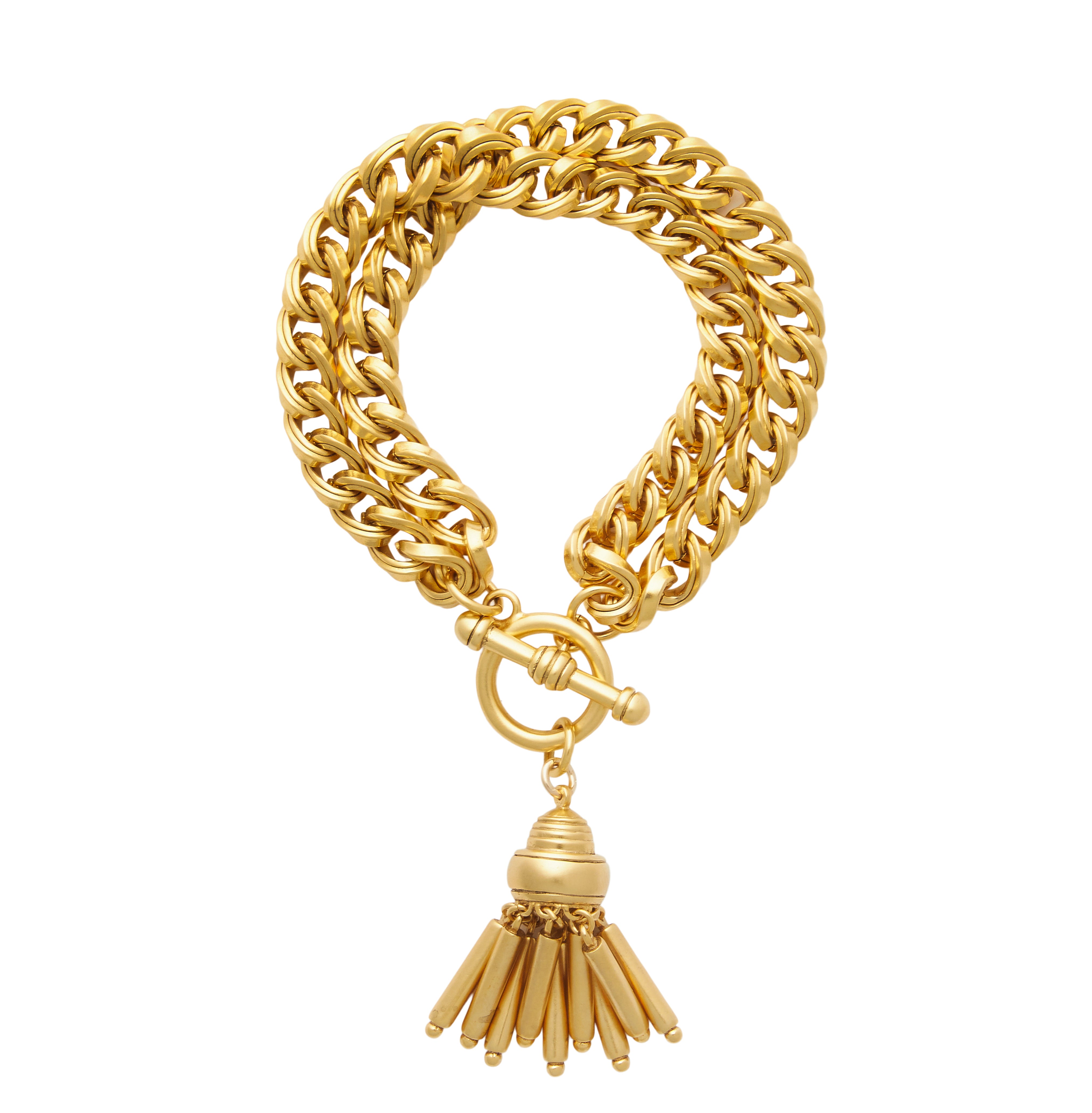 - A 24k antique gold plated tassel hangs from a 24k antique gold plated double chunky link chain.