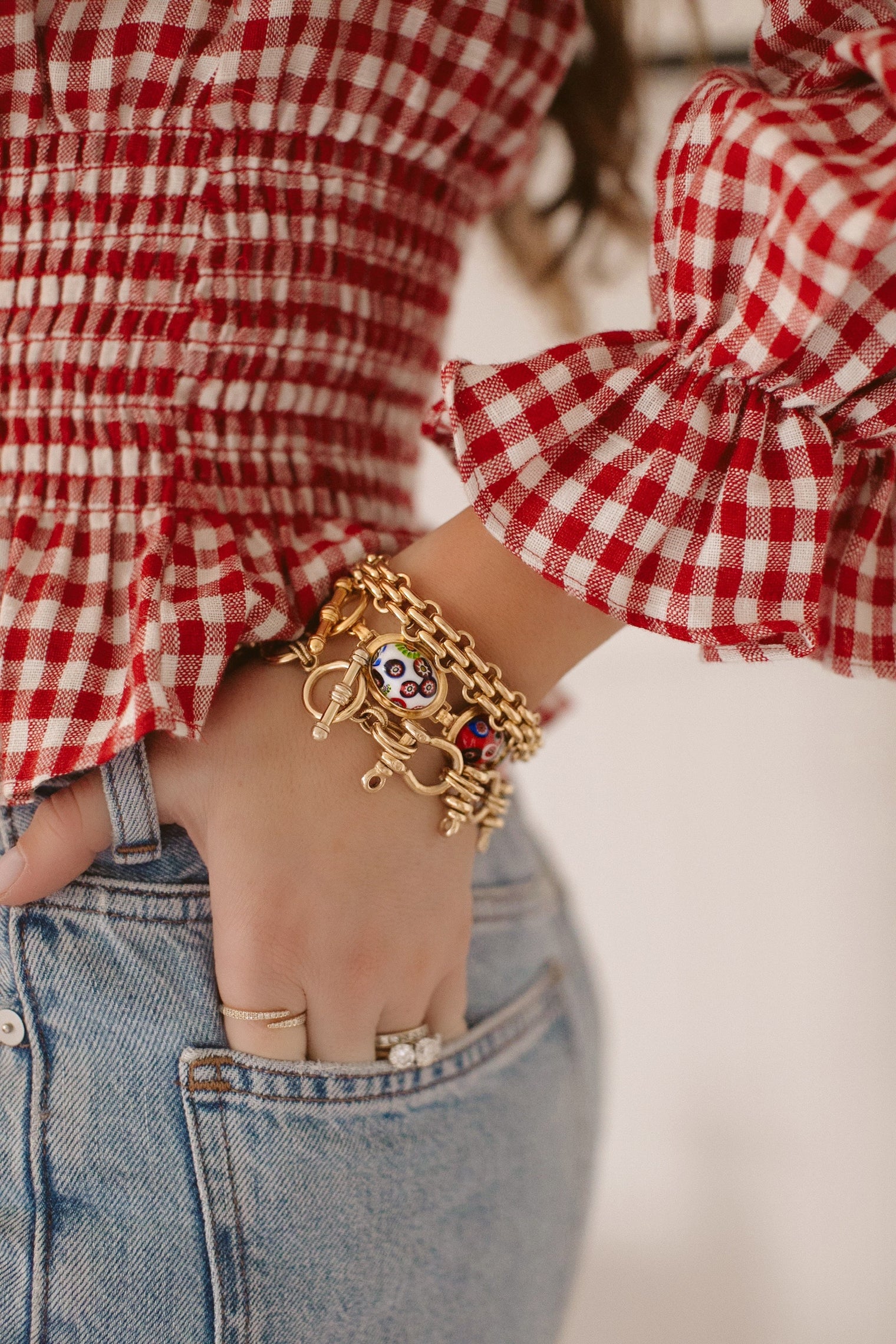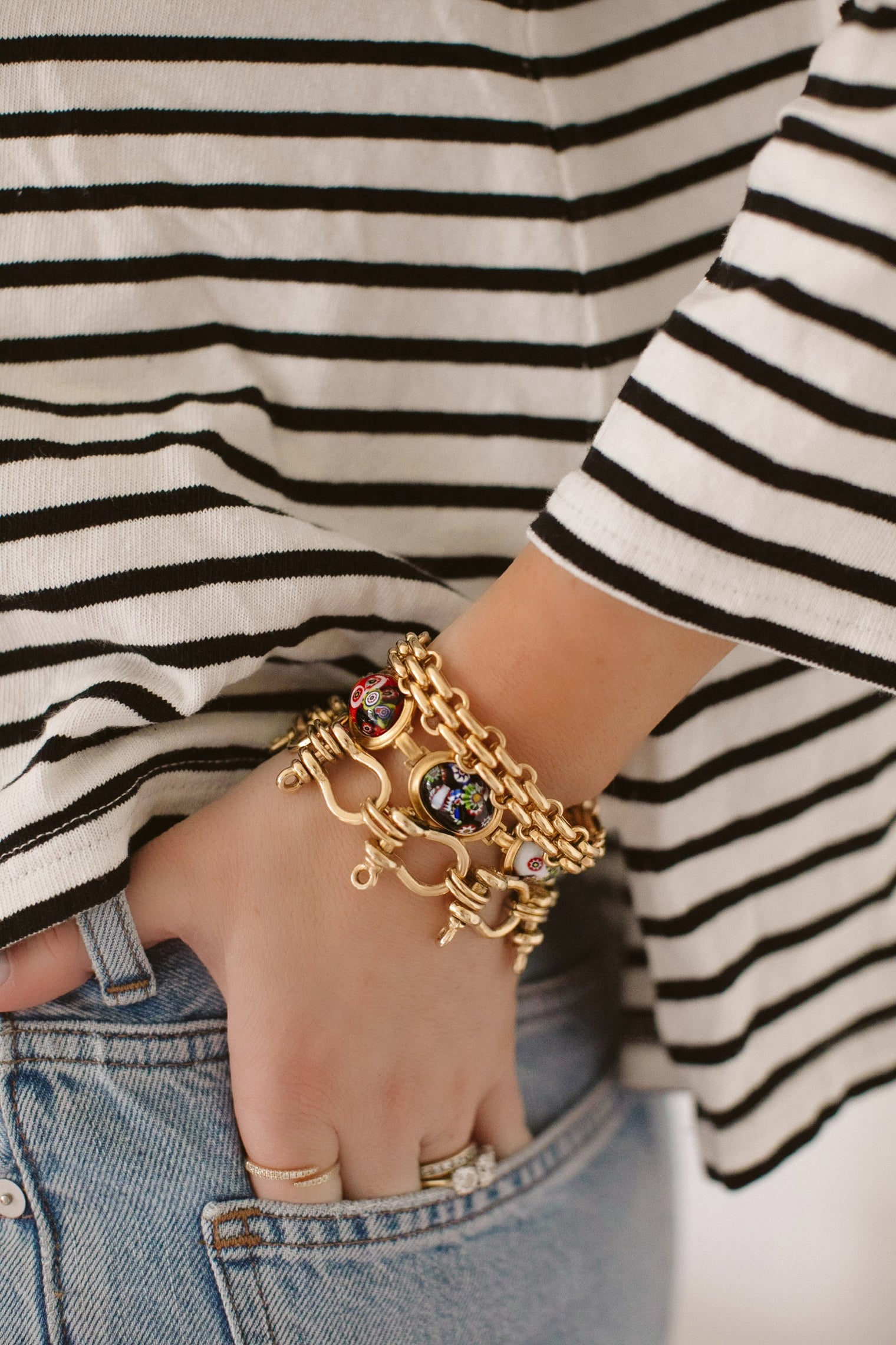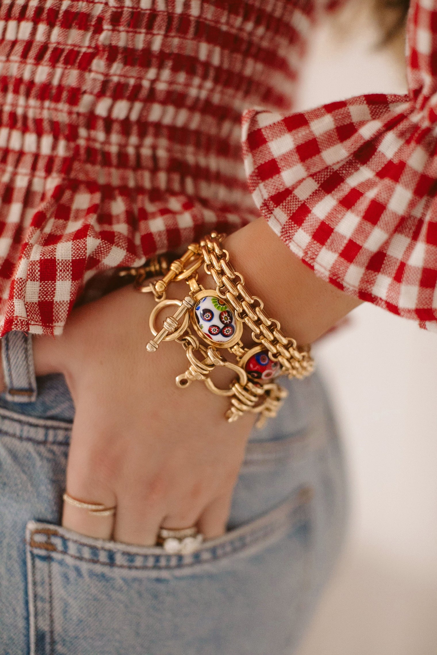 - Millefiori glass cabochons on 24k antique gold plated brass settings