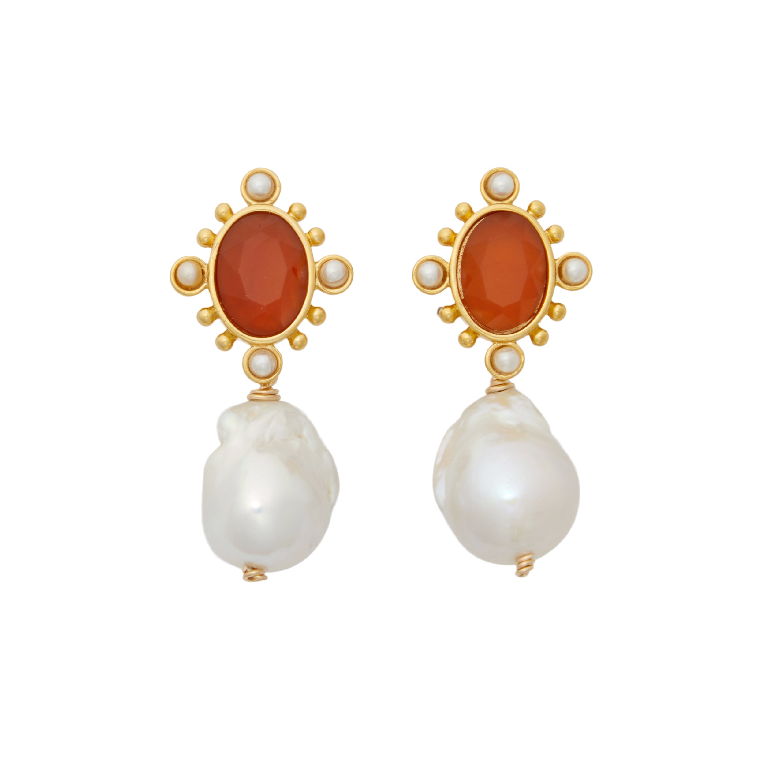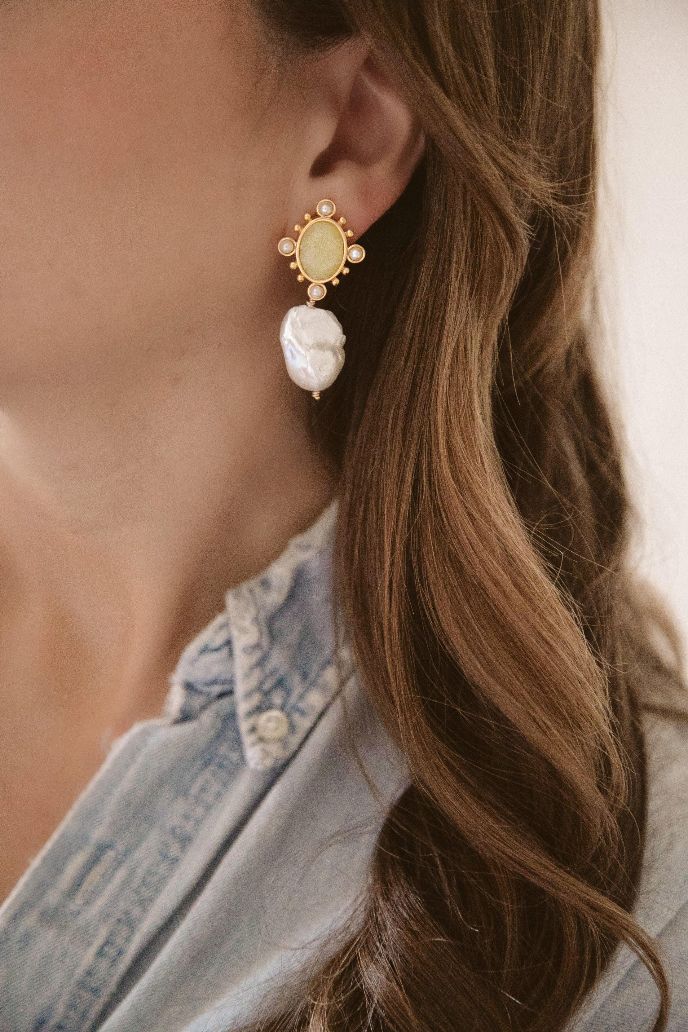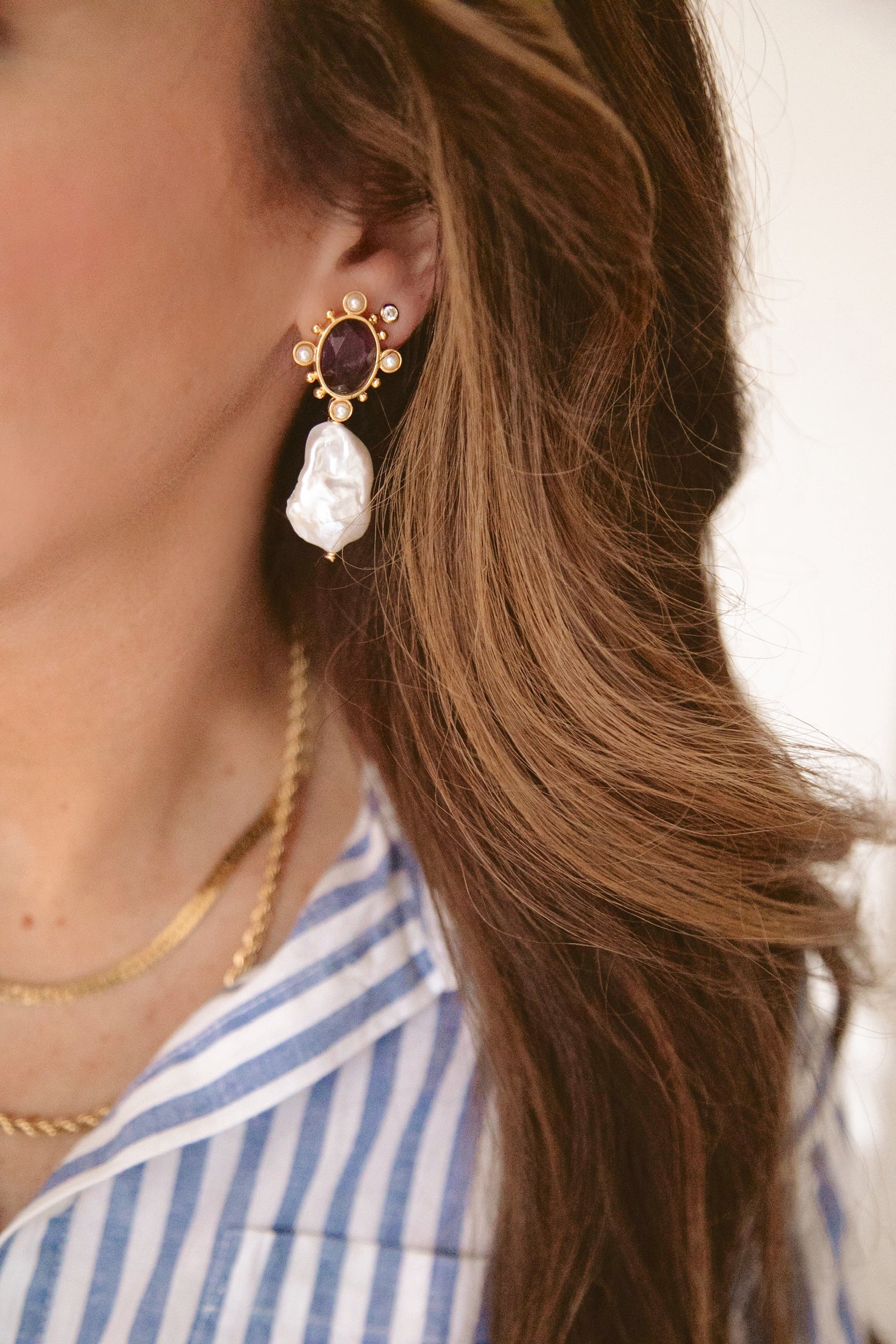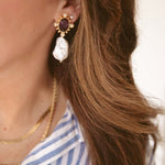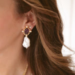 - Baroque freshwater pearls hang from 24k antique gold plated toppers set with semi precious gemstones and mini freshwater pearls on stainless steel hypoallergenic posts