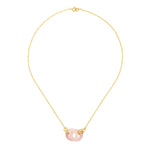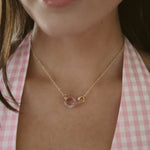 - Two interlocking rings of rose quartz hang from a 14/20 gold filled double rope chain