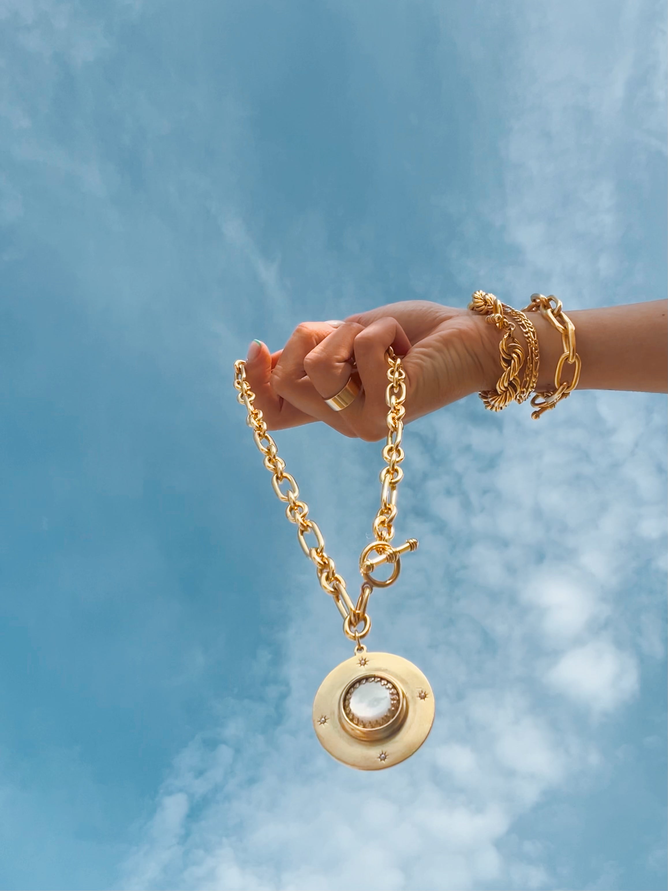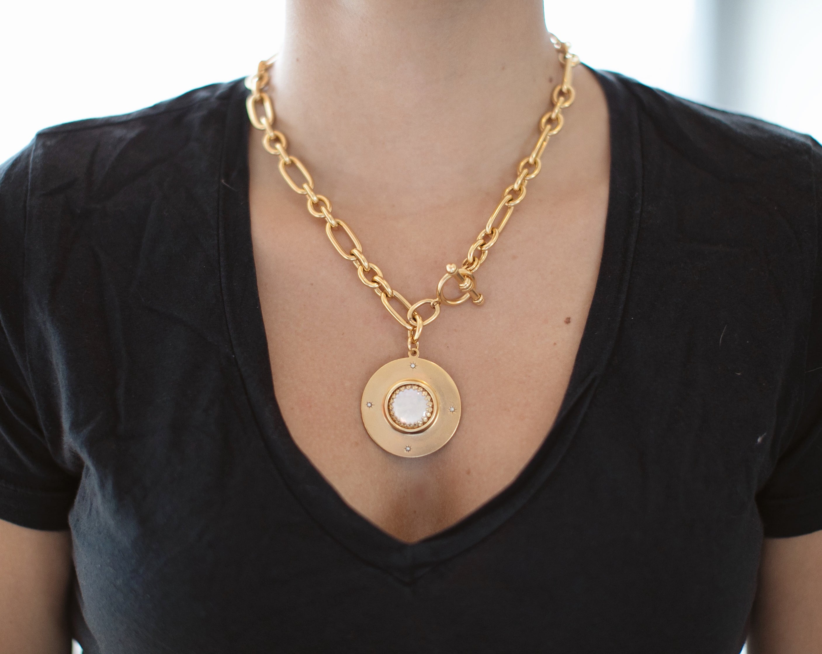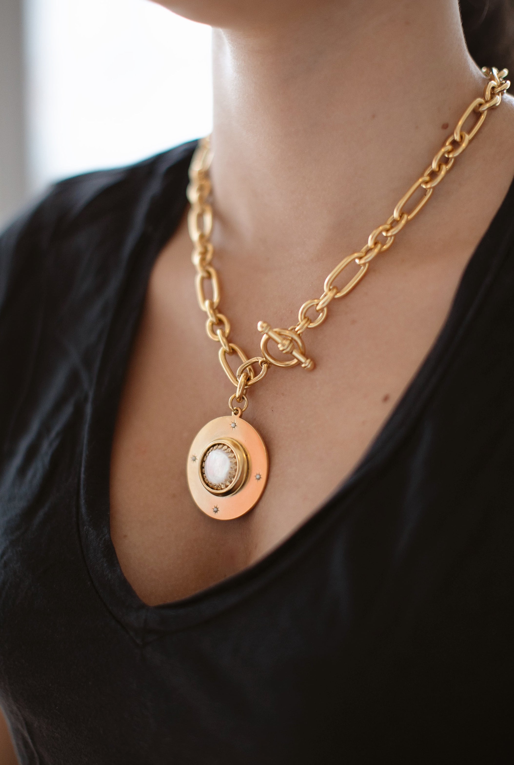 - A 24k antique gold plated pendant set with mini glass pearls and a MOP cabochon hangs from a 24k antique gold plated chain