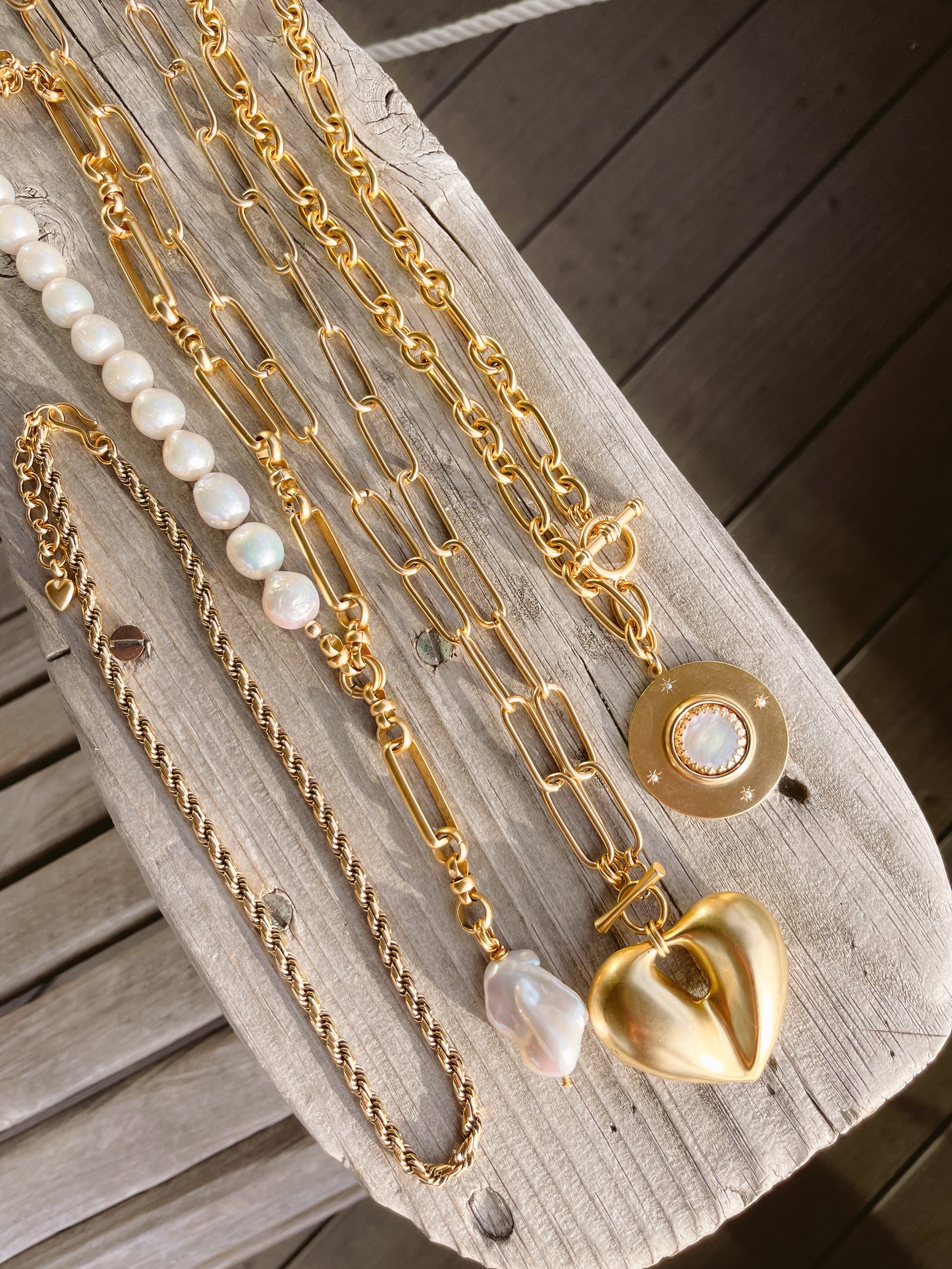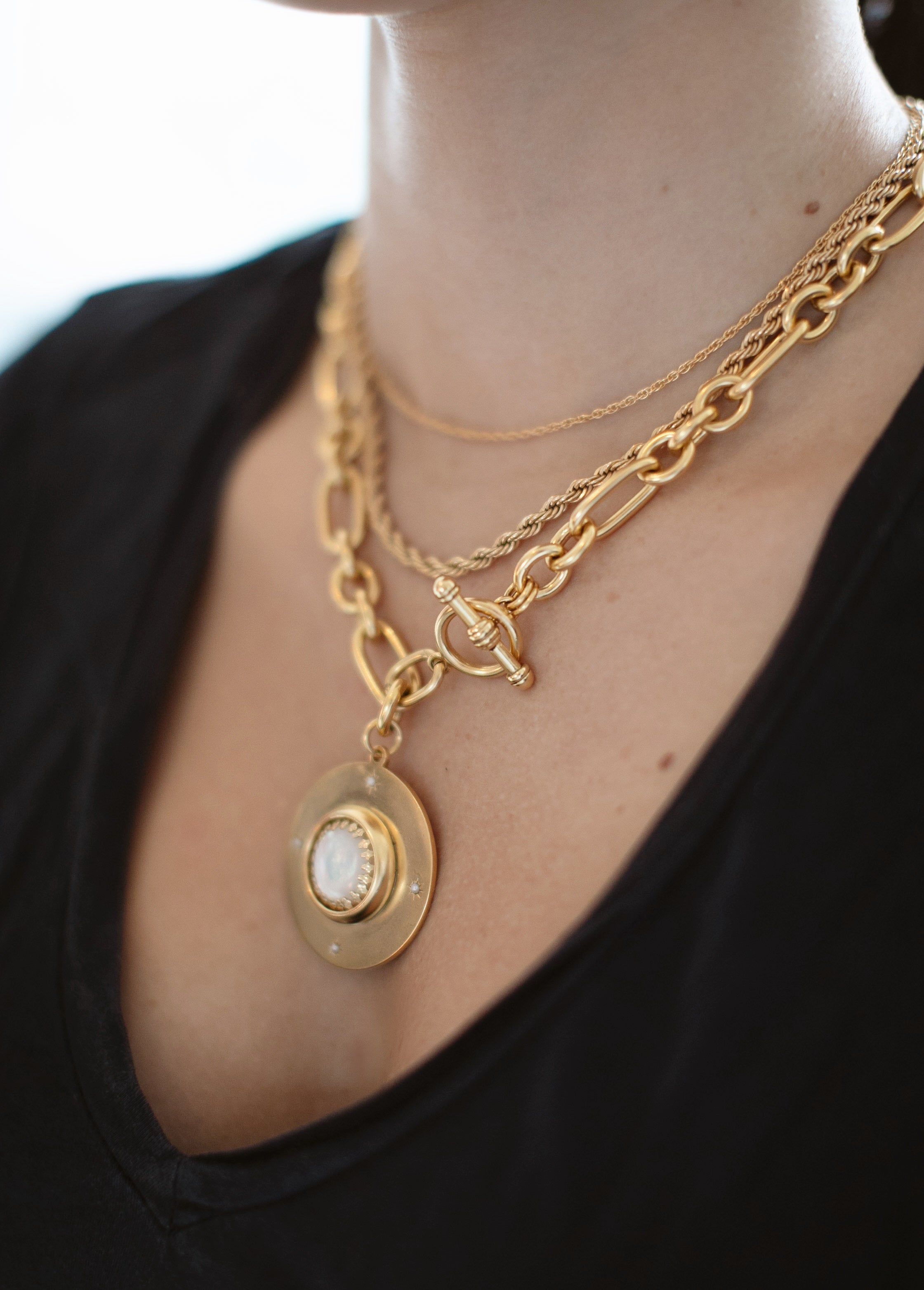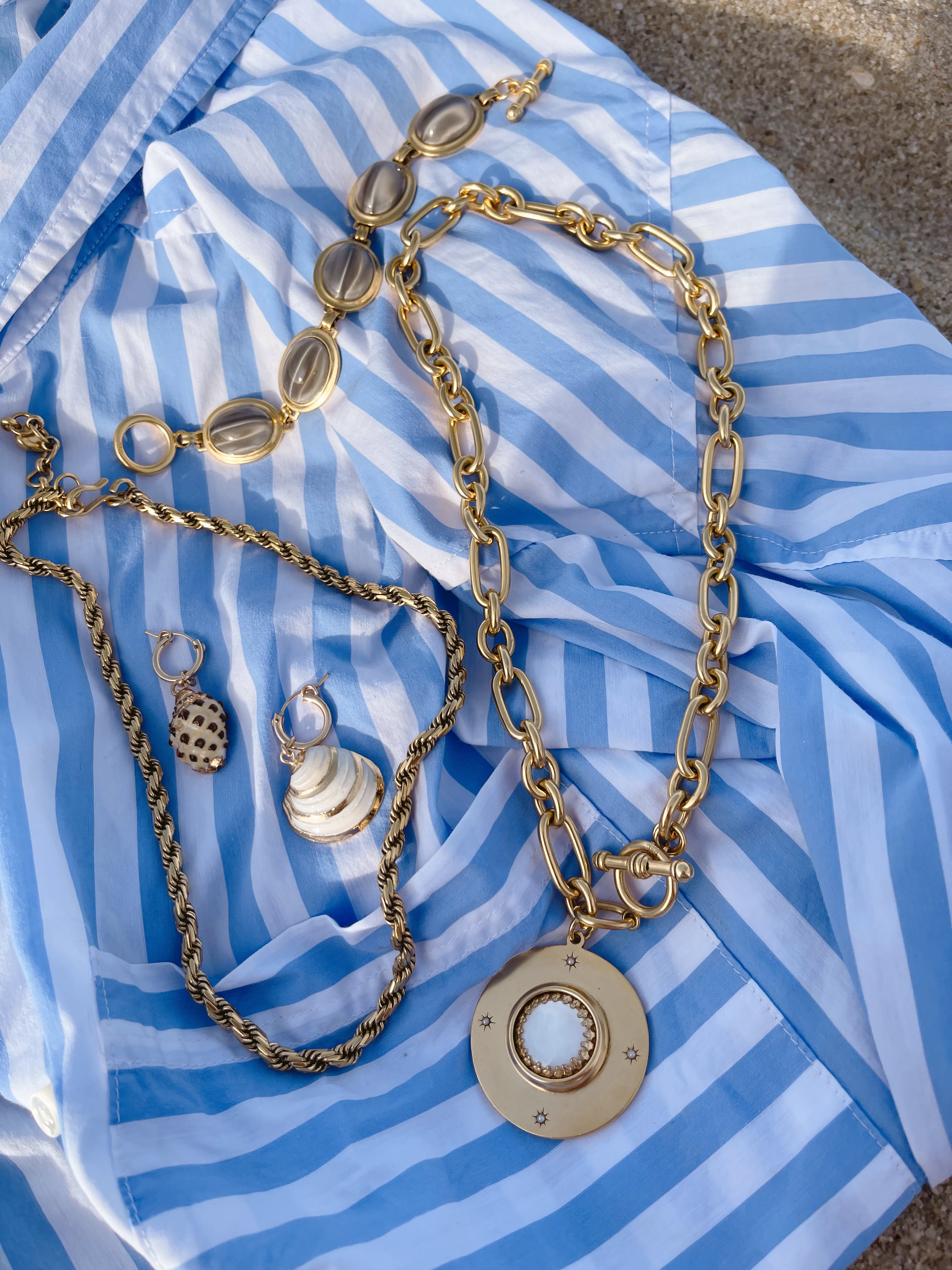 - A 24k antique gold plated pendant set with mini glass pearls and a MOP cabochon hangs from a 24k antique gold plated chain