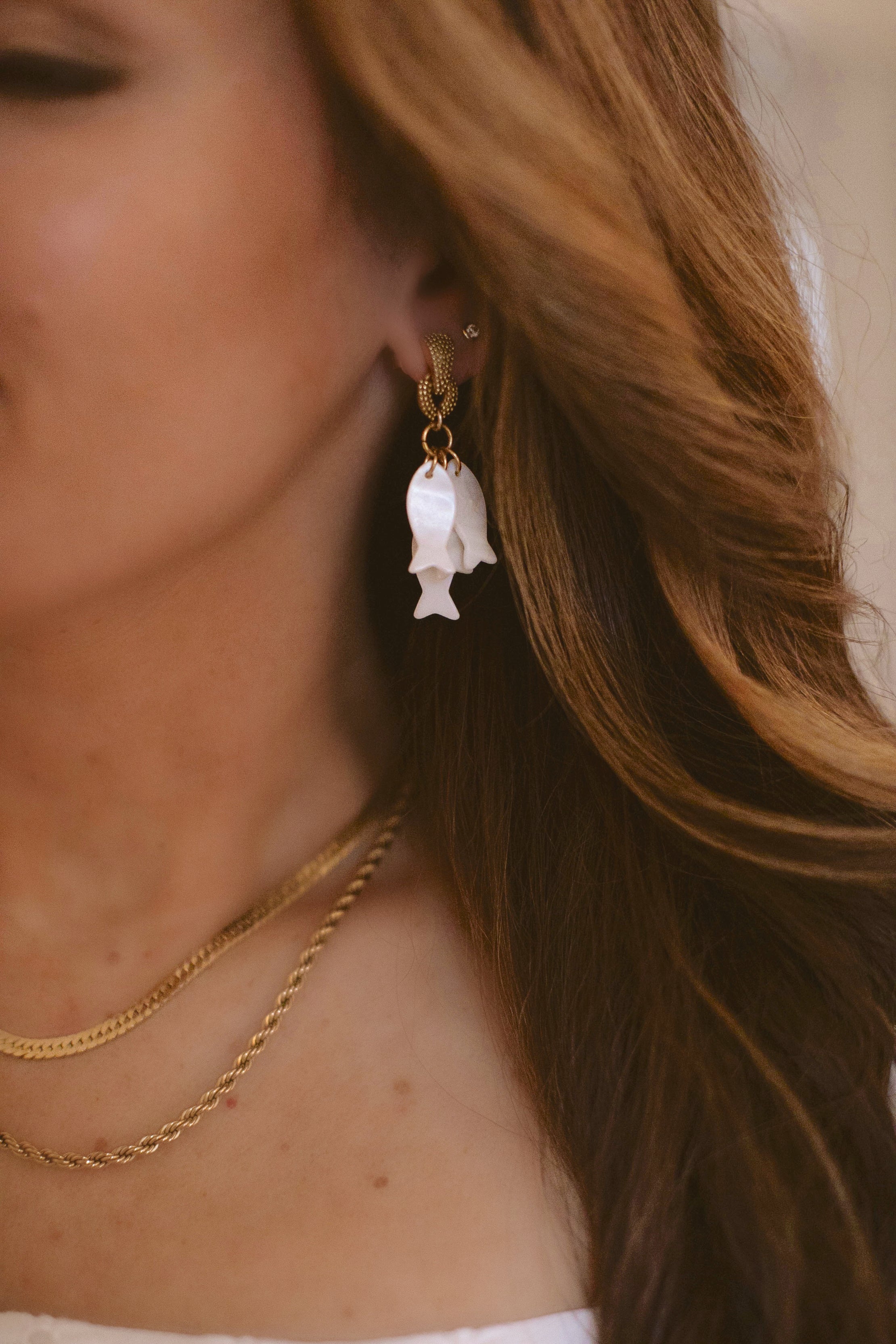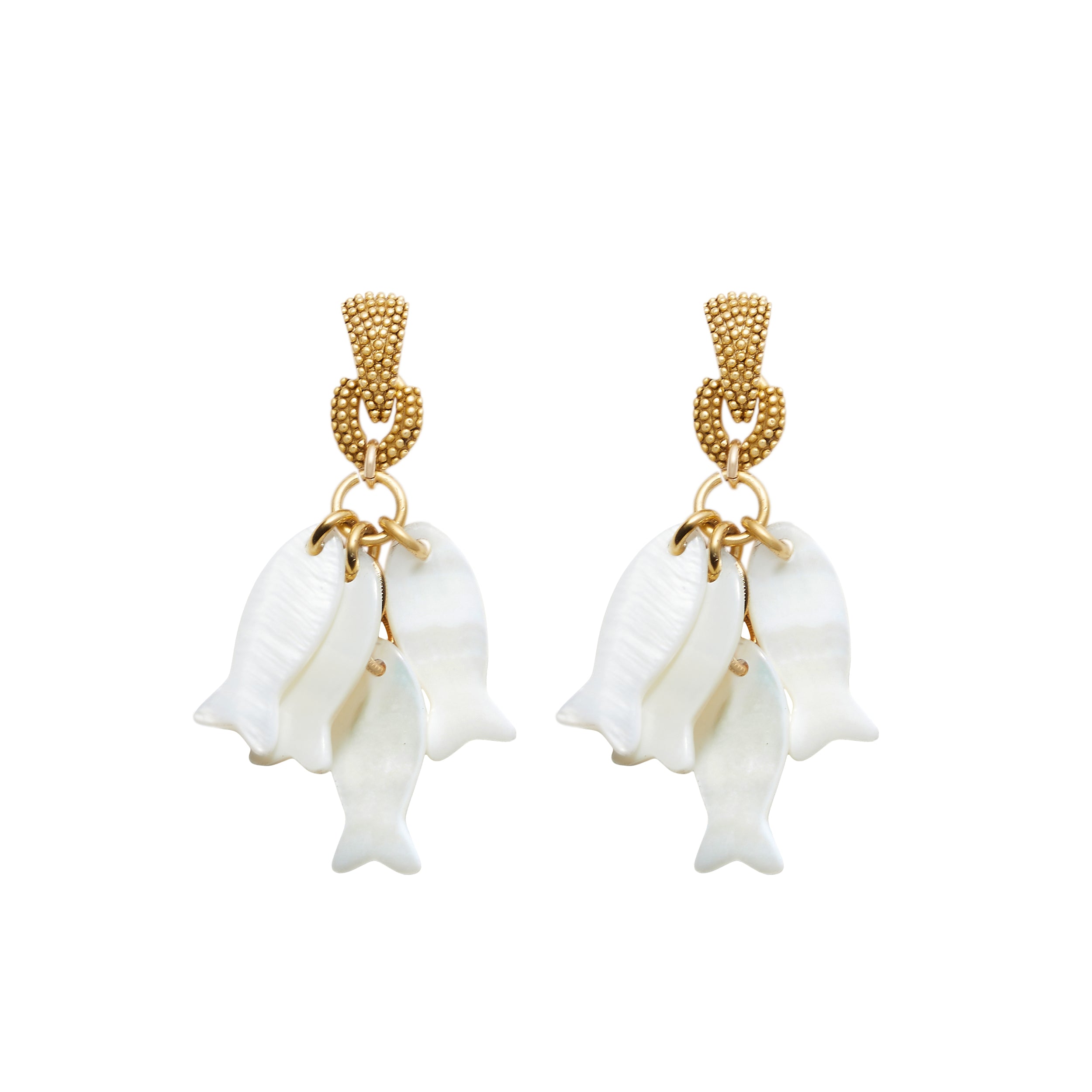 - MOP fish charms hang from textured 24k antique gold plated toppers on stainless steel hypoallergenic posts