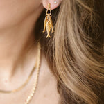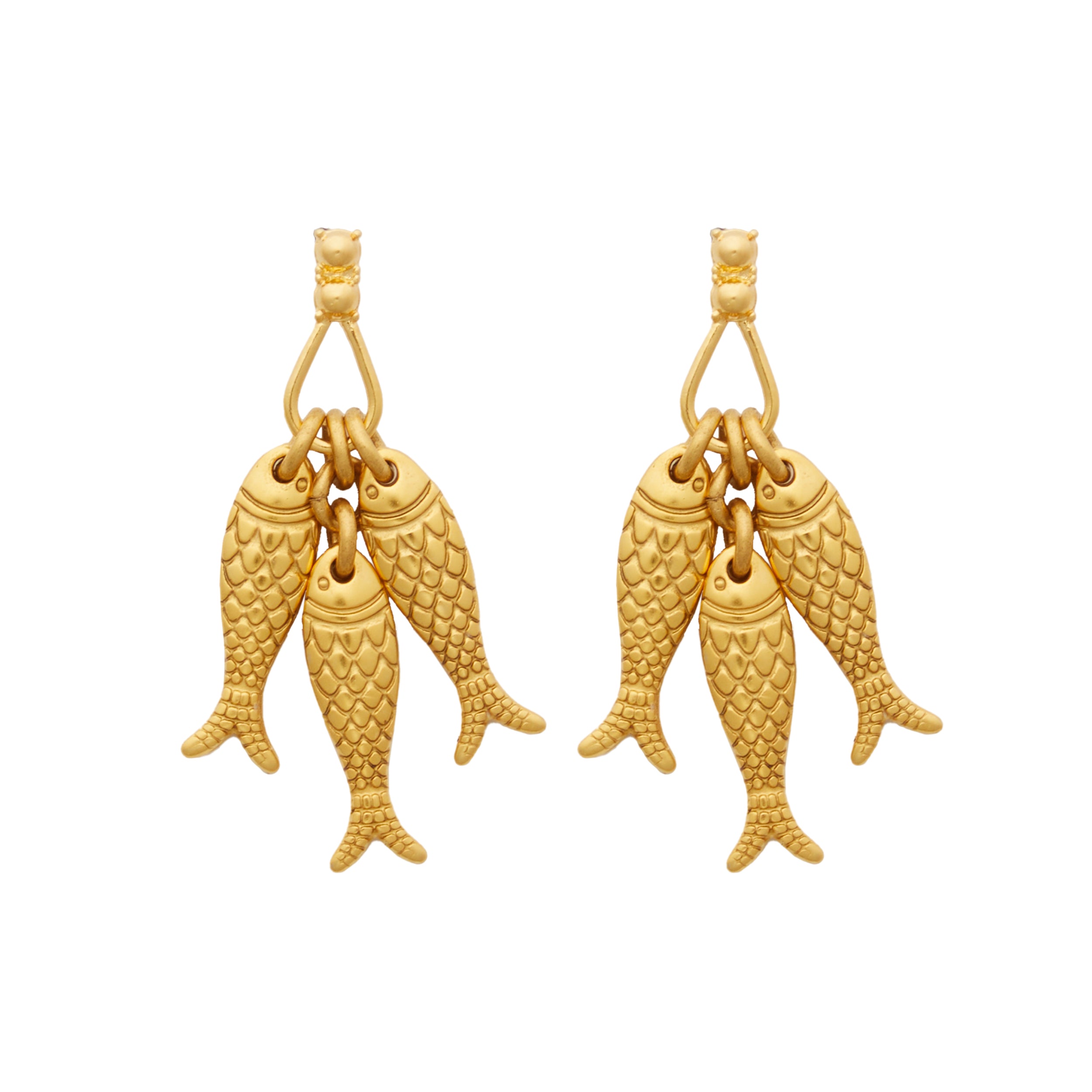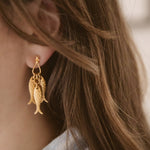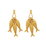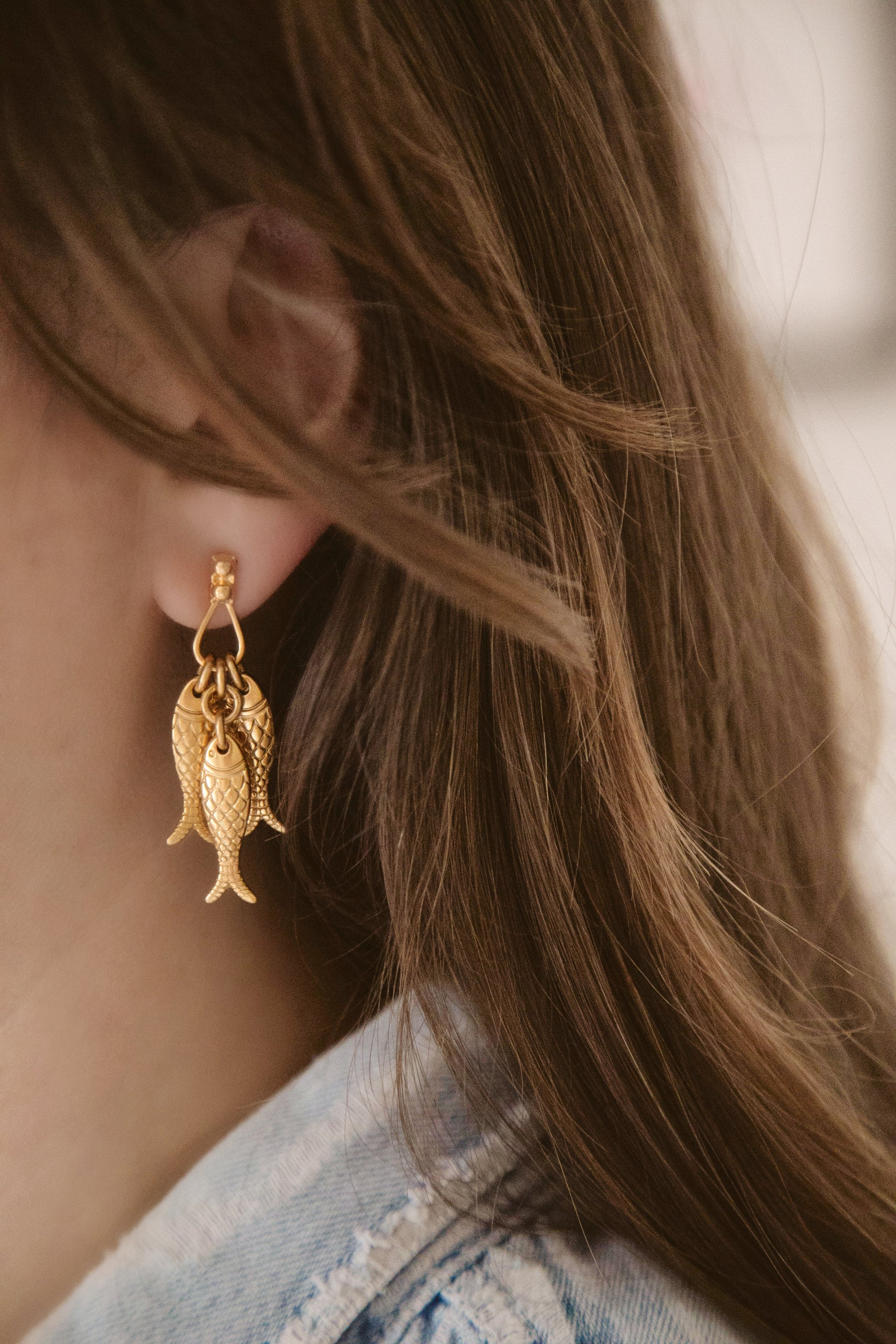 - 24k antique gold plated fish charms hang from 24k antique gold plated toppers on stainless steel hypoallergenic posts