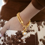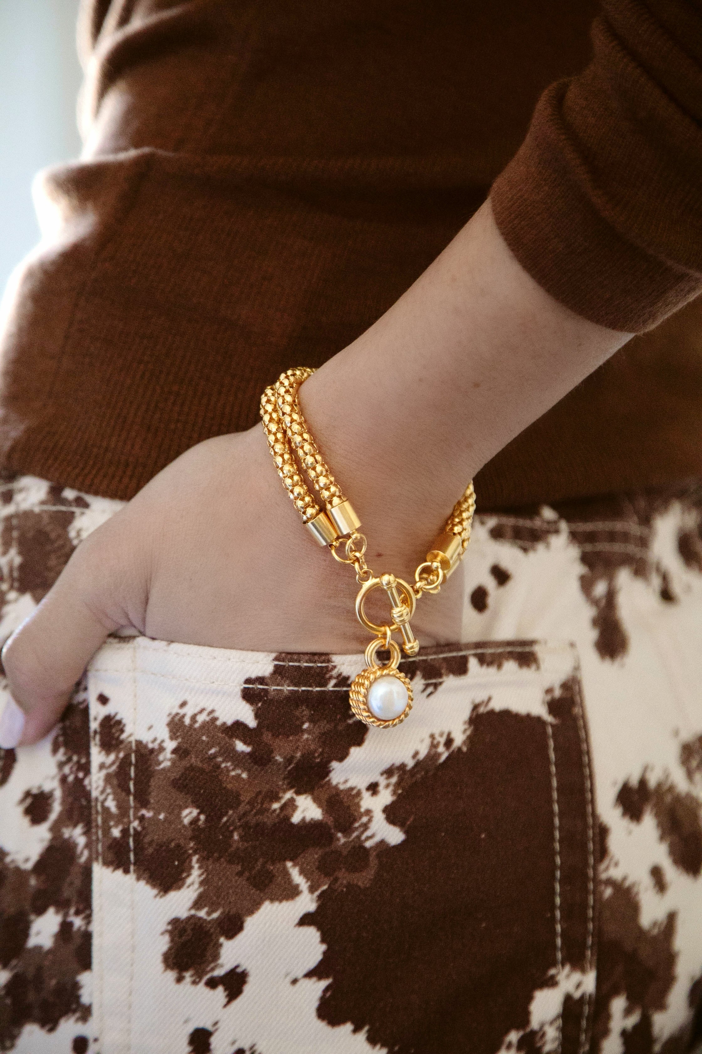 - A 24k antique gold plated twisted rope and pearl charm hangs from a double link serpentine chain