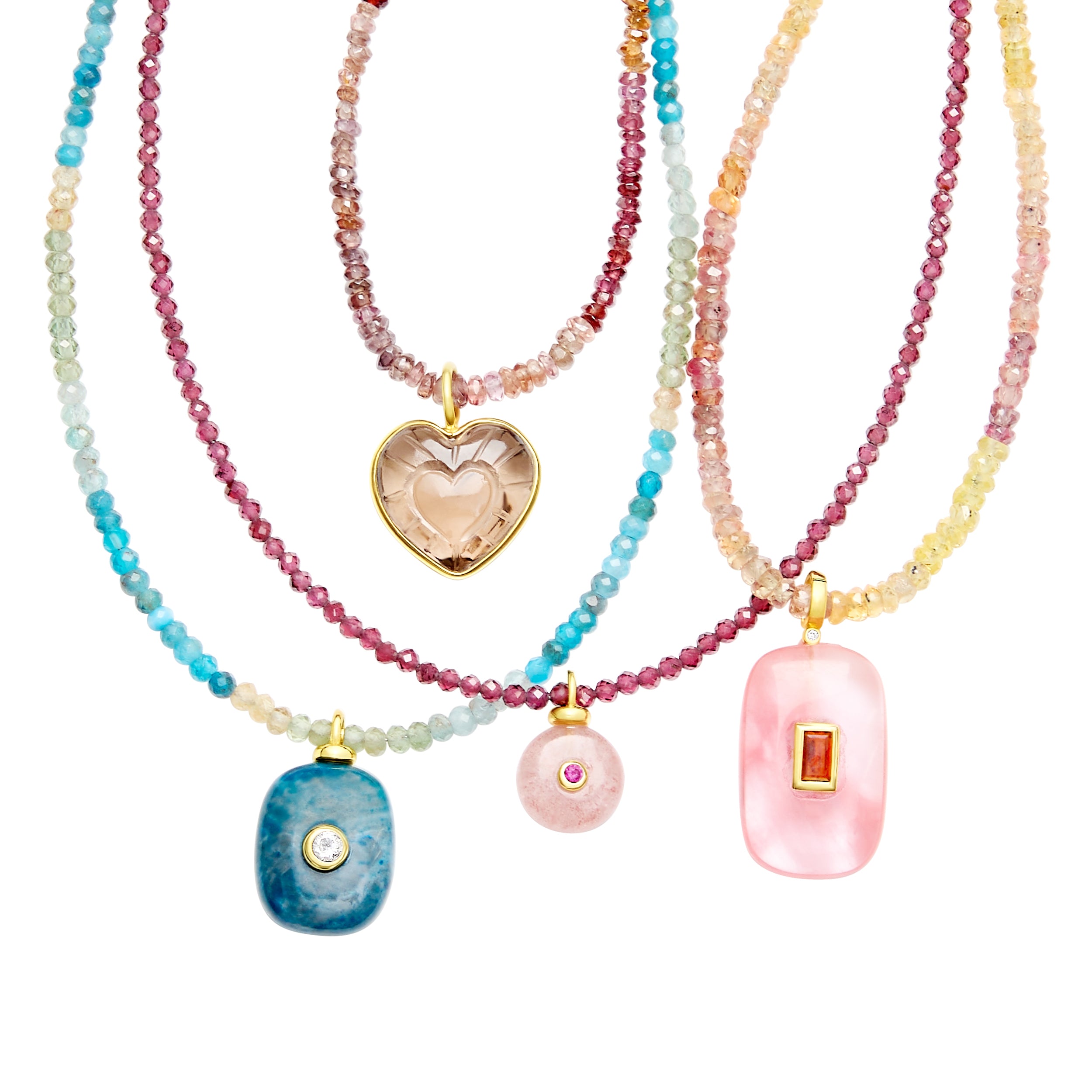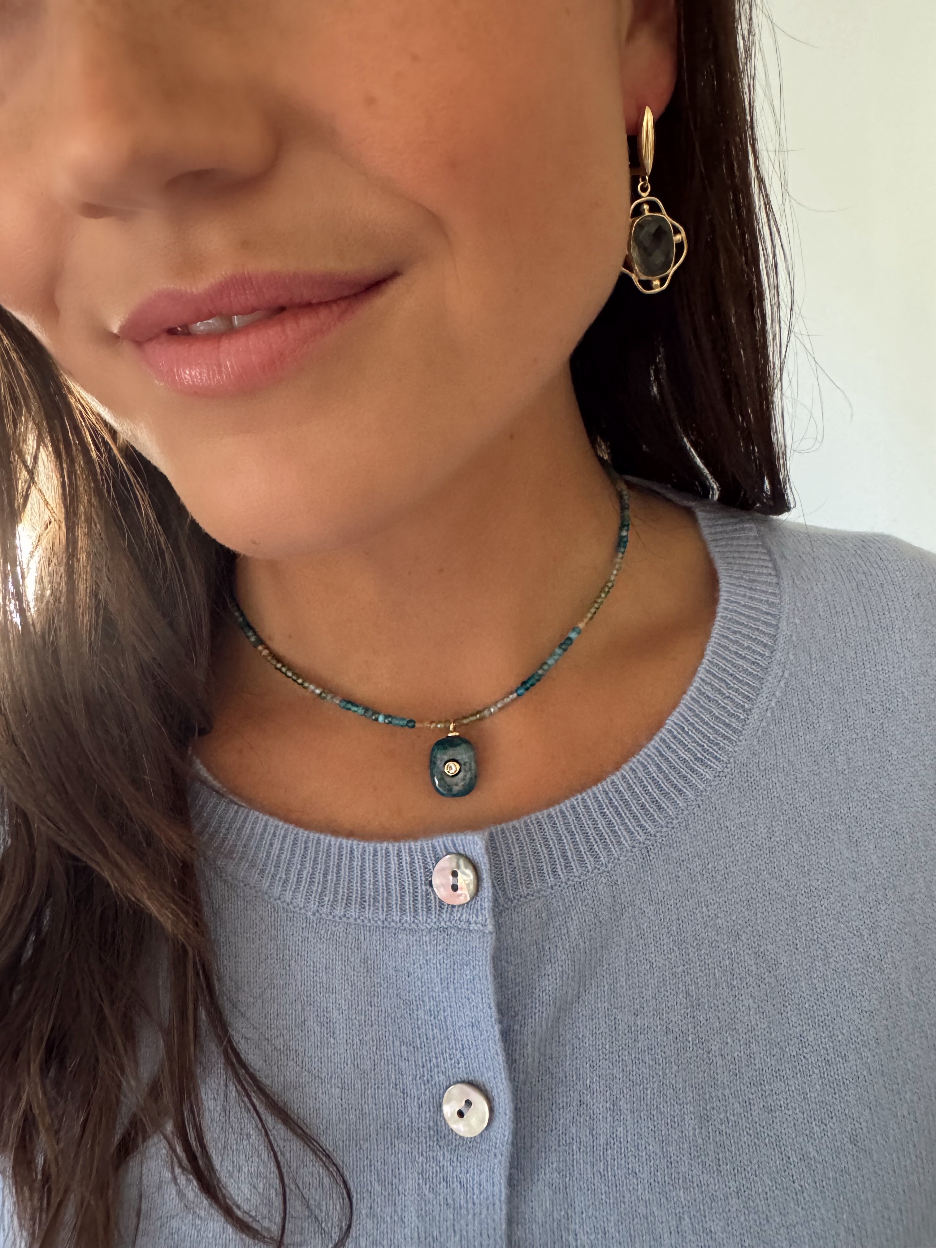- A blue agate semi-precious gemstone pendant adorned with an inset crystal hangs from a strand of faceted shaded apatite rondelle beads