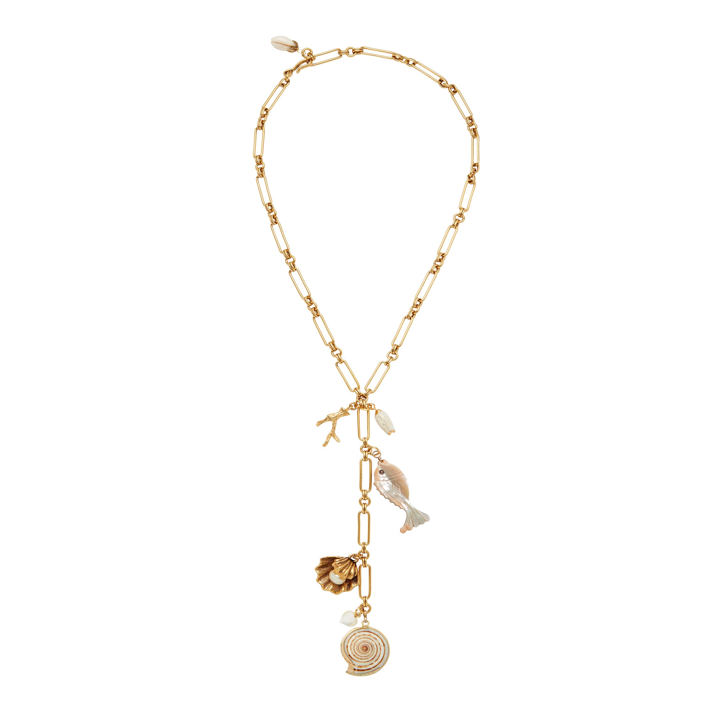 - 24k antique gold plated chain adorned with authentic vintage shells rimmed in gold plating, a vintage fish charm, an antique gold plated brass coral branch, an antique gold plated scallop shell with genuine pearl and a MOP heart