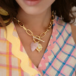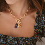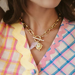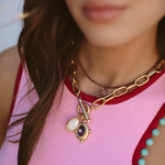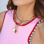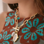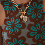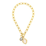 - Two semi-precious gemstone charms or vintage glass charms hang on a 24k antique gold plated heavy brass link chain with a toggle closure featuring two freshwater pearl cabochons