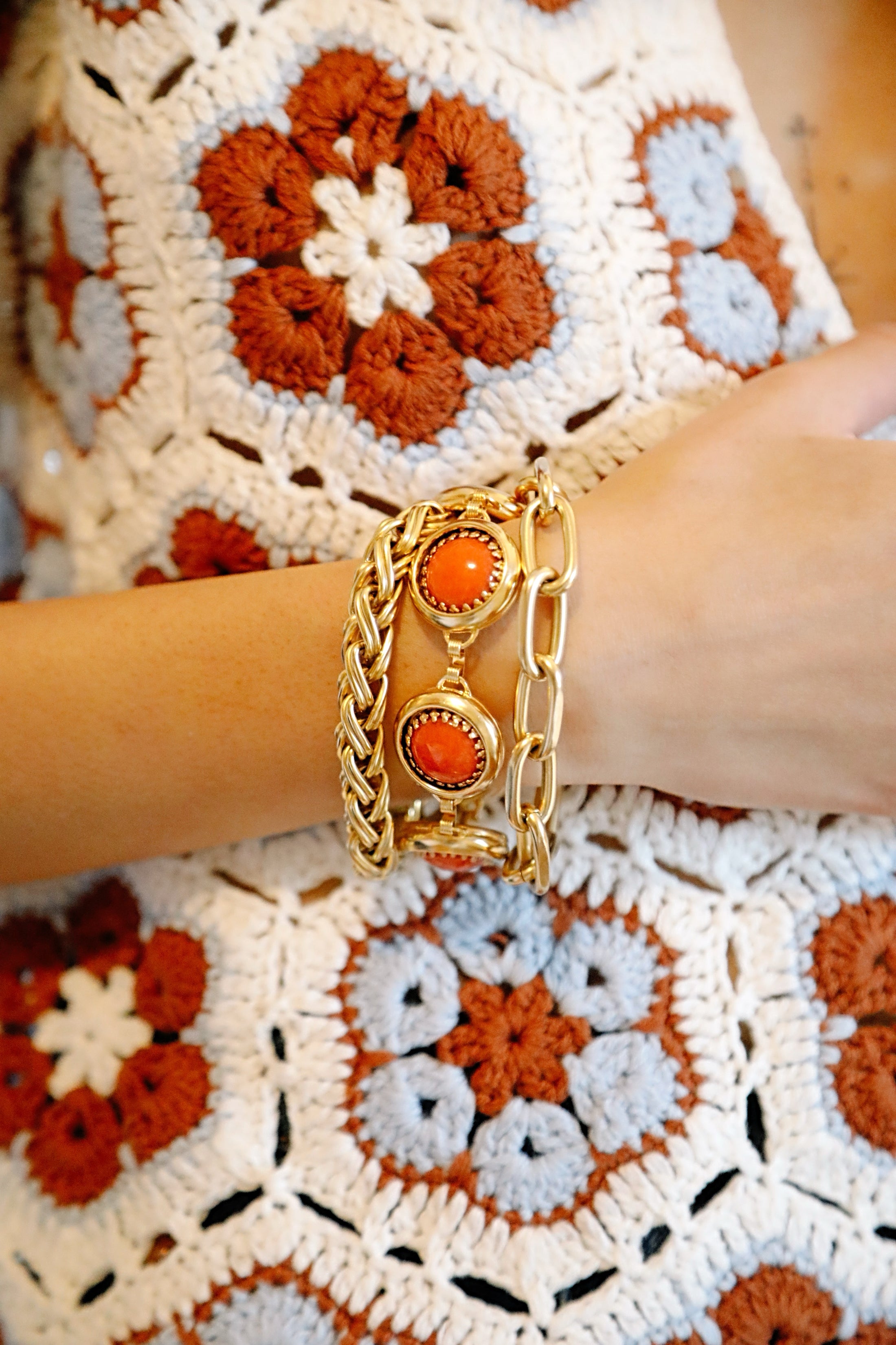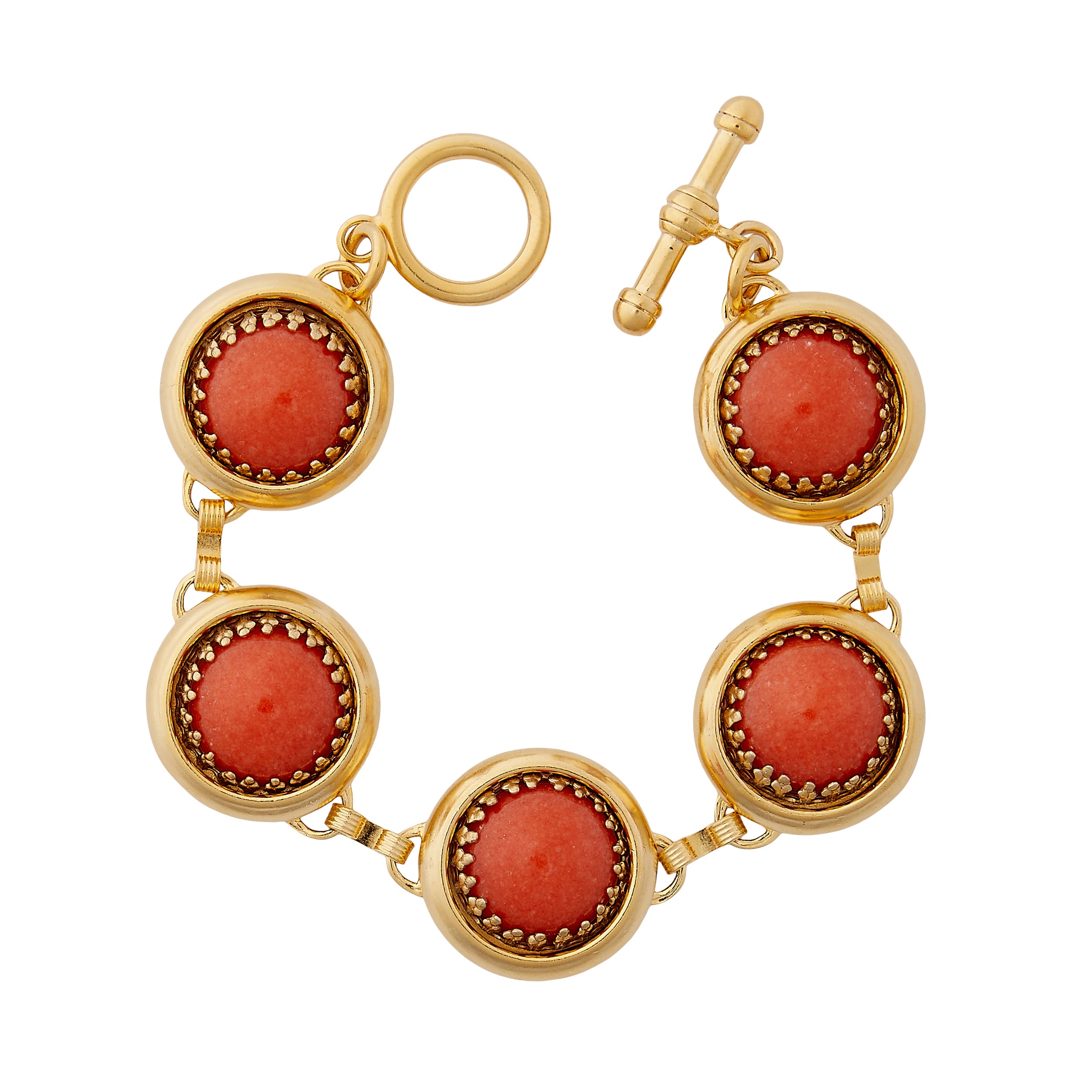 - Dolomite coral cabochons are set in 24k antique gold plated brass settings