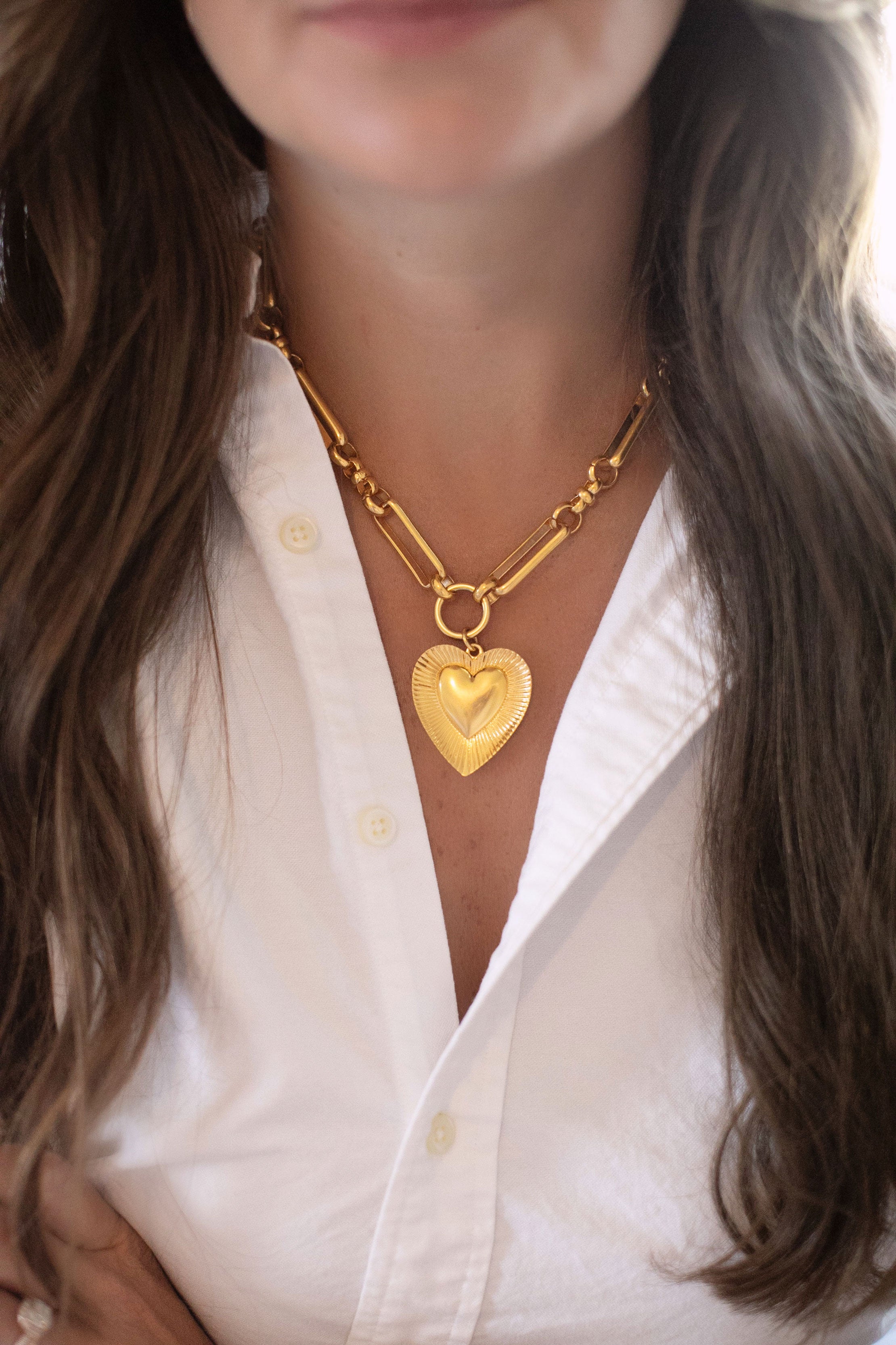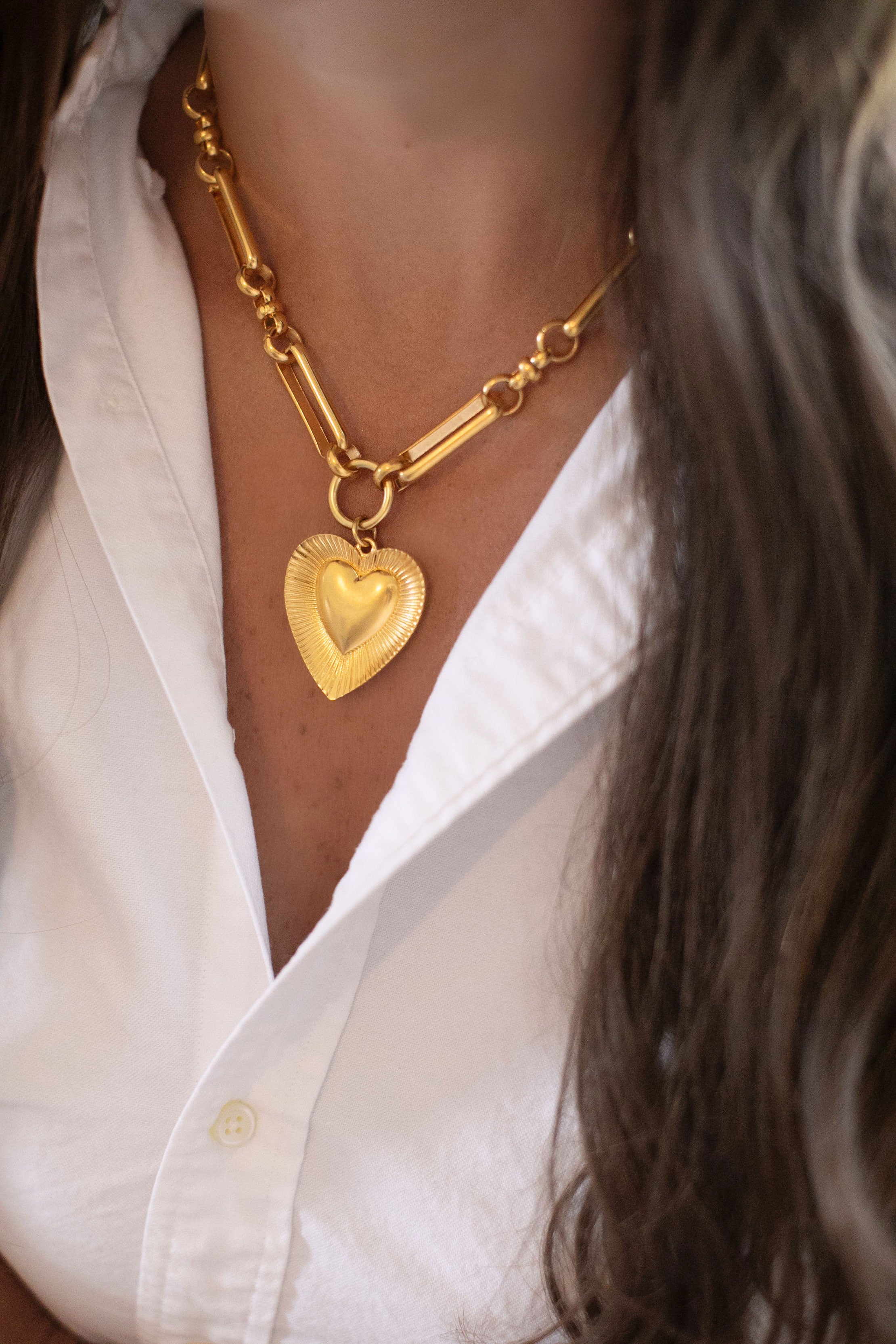 - 24k antique gold plated brass heart medallion and long-short link chain