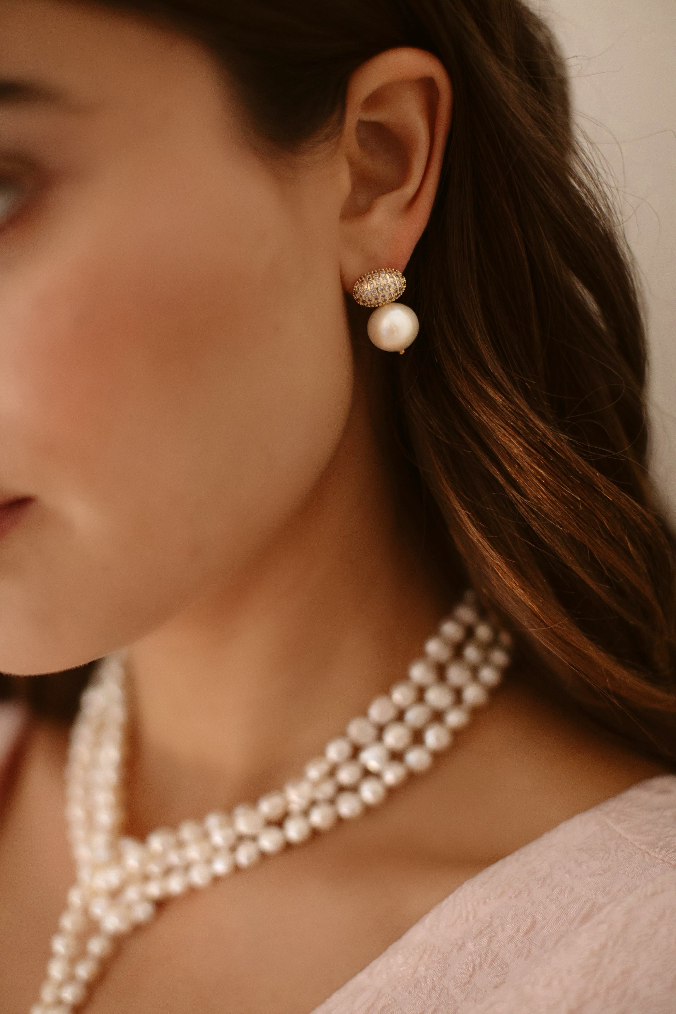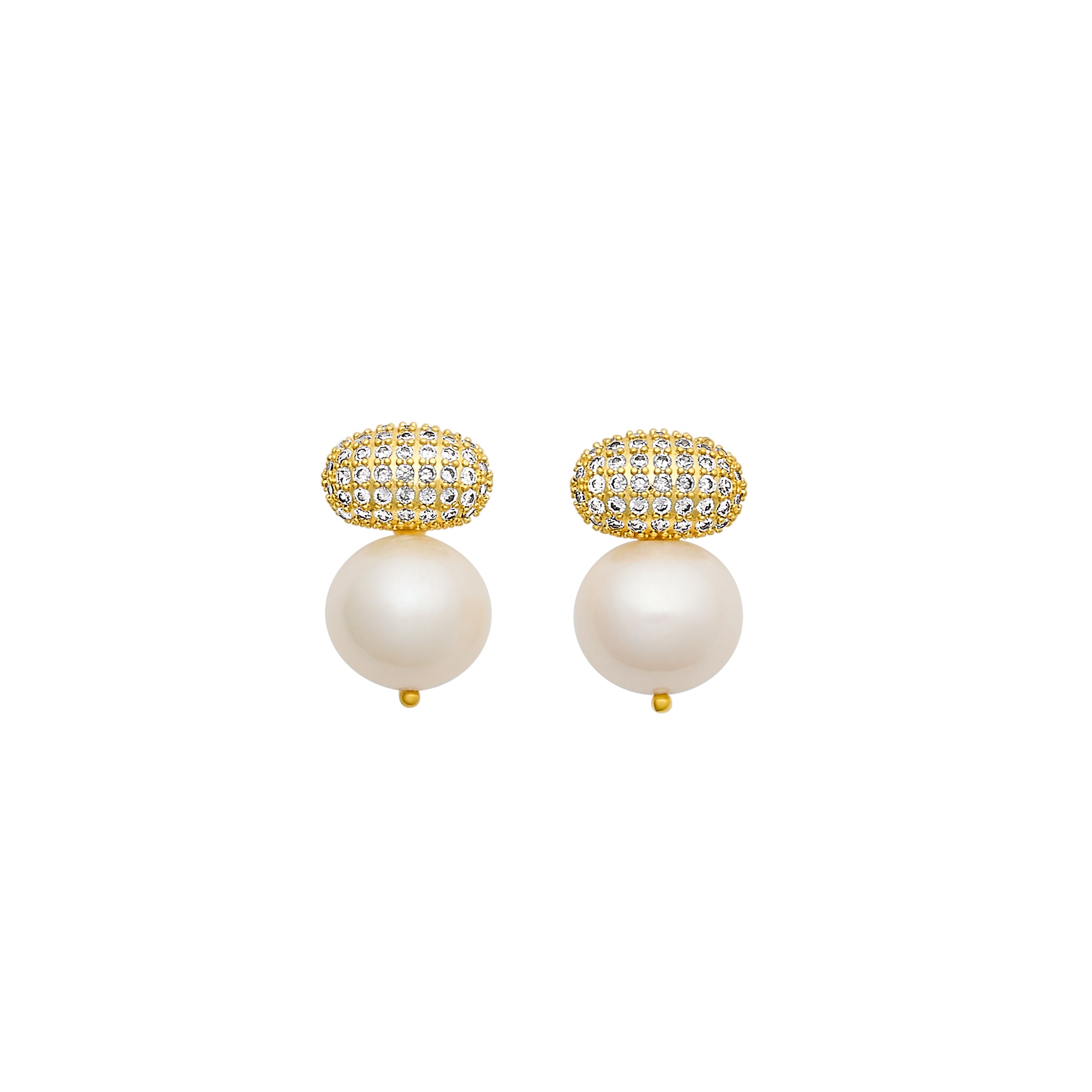 - Freshwater pearls hang from 18k antique gold plated brass toppers set with pave crystals on hypoallergenic posts