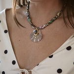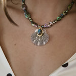 - A baby flat scallop shell with a labradorite cabochon hangs from a strand of freshwater pearls, abalone hearts and irregular pod shaped beads