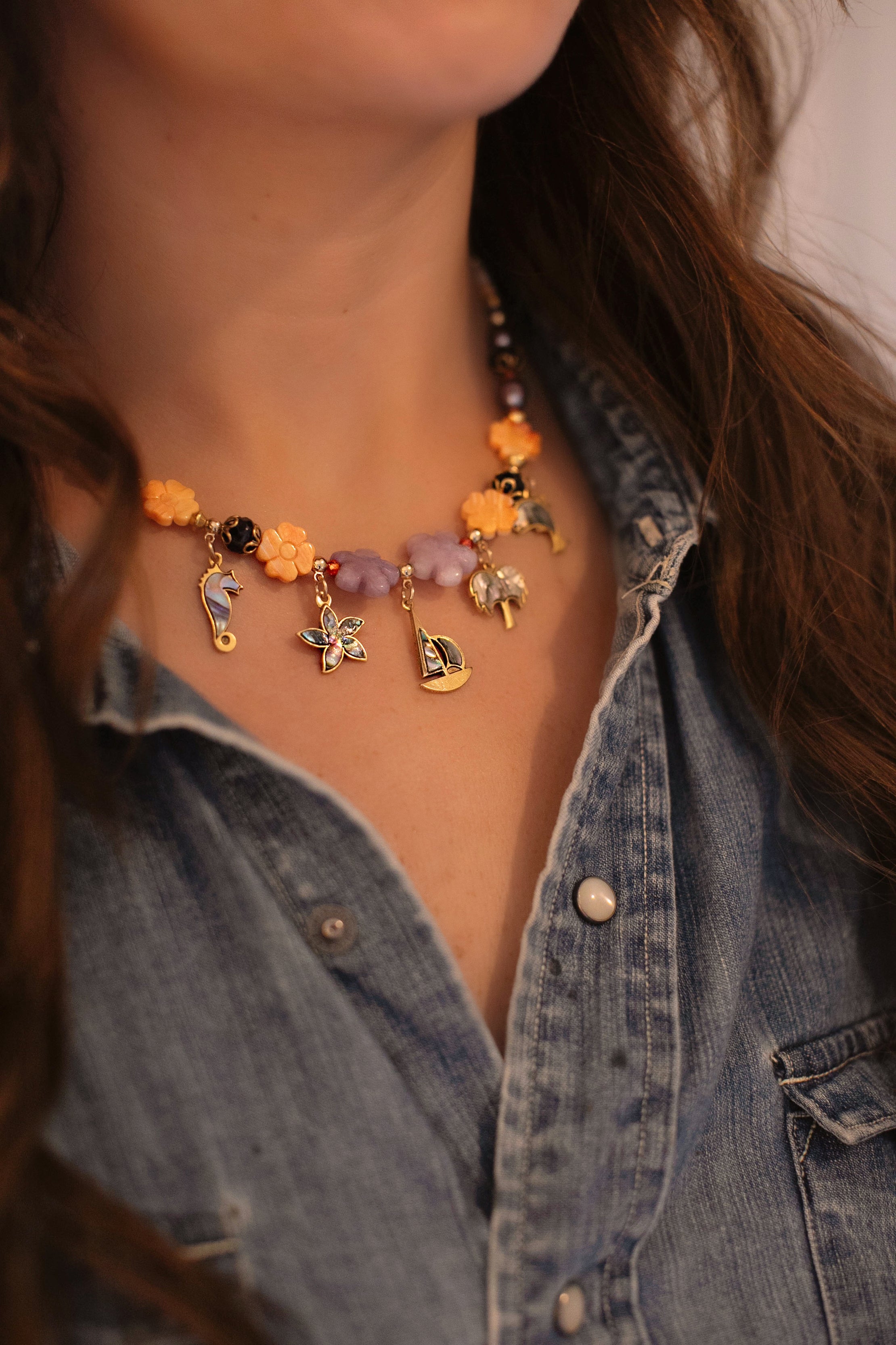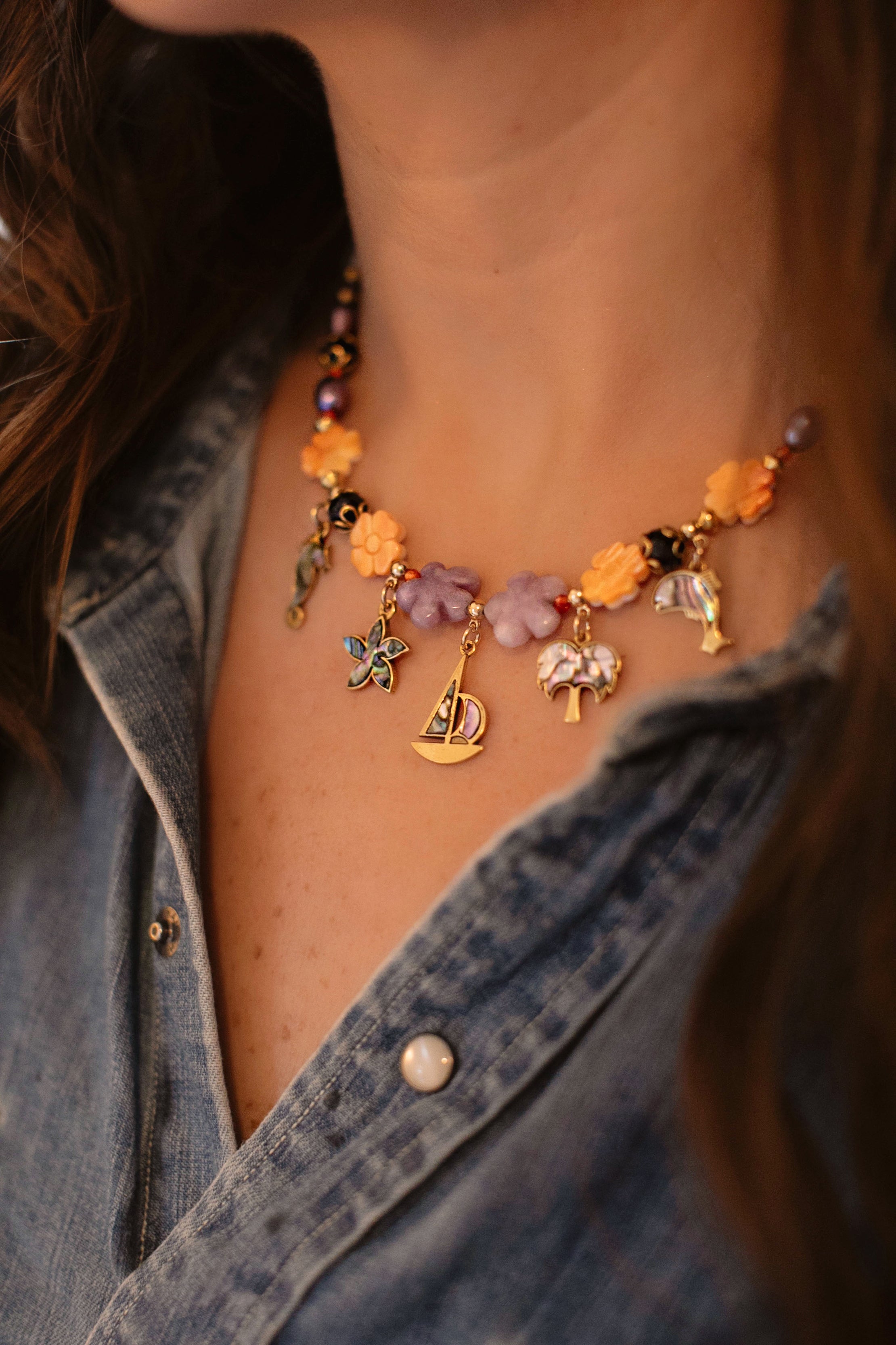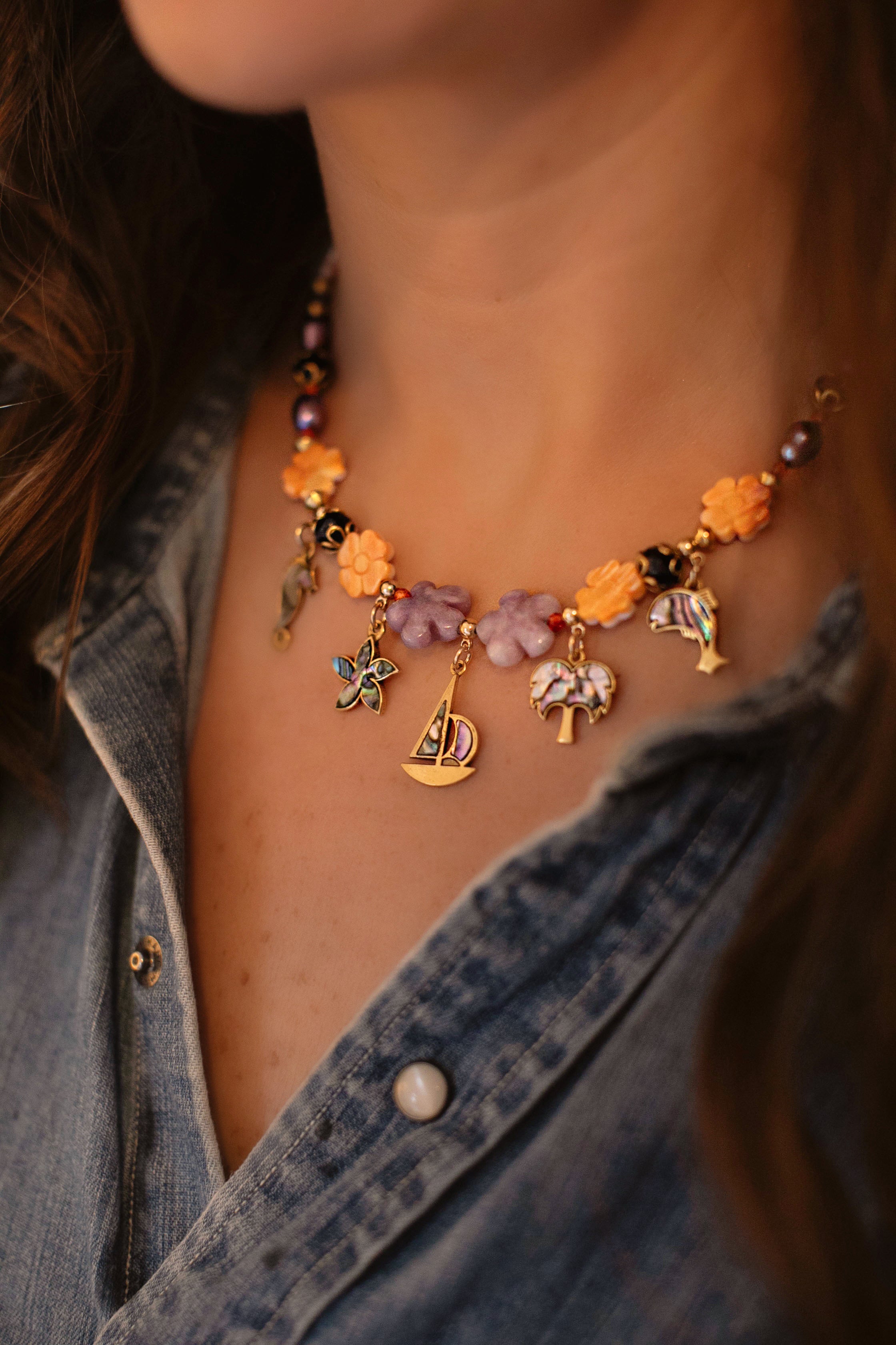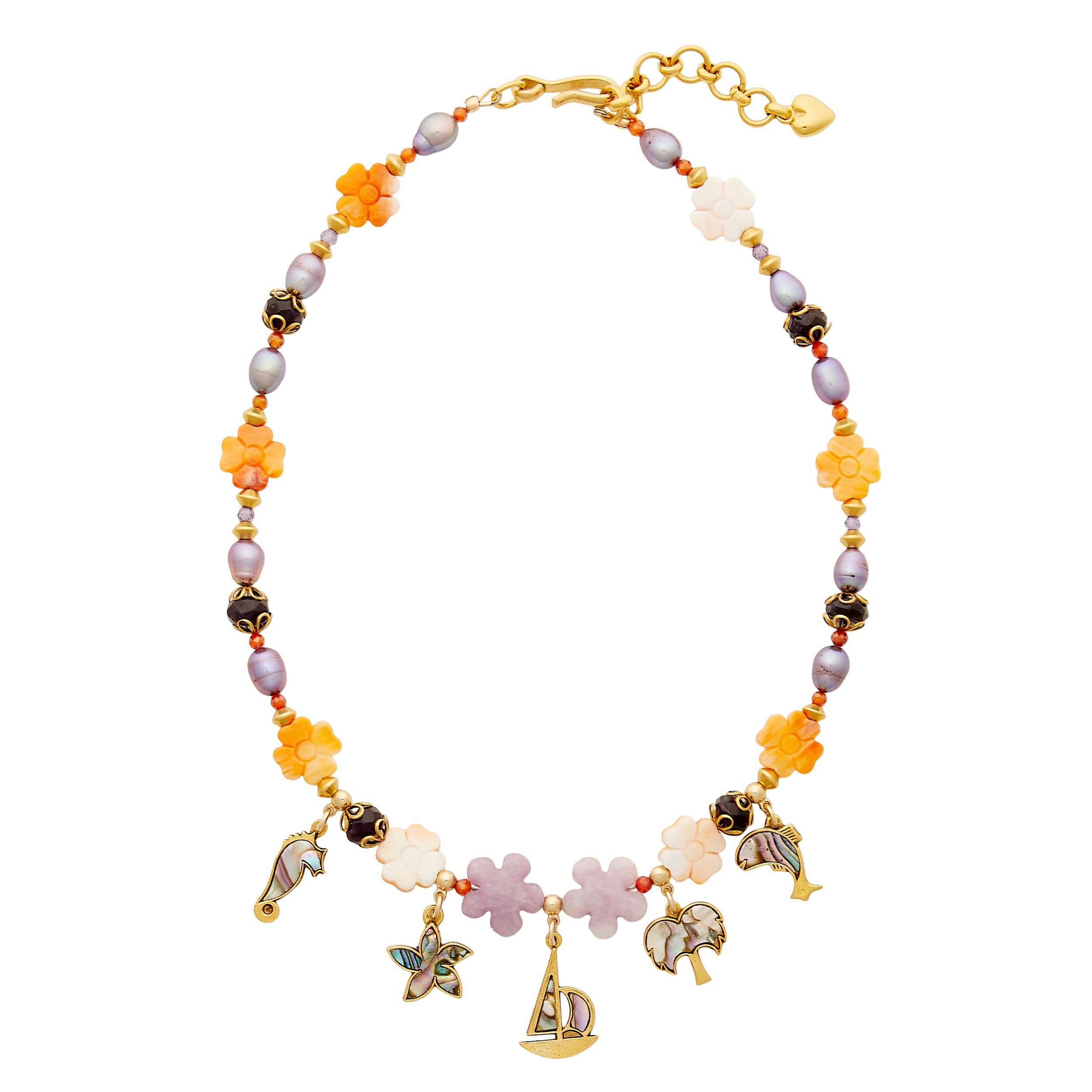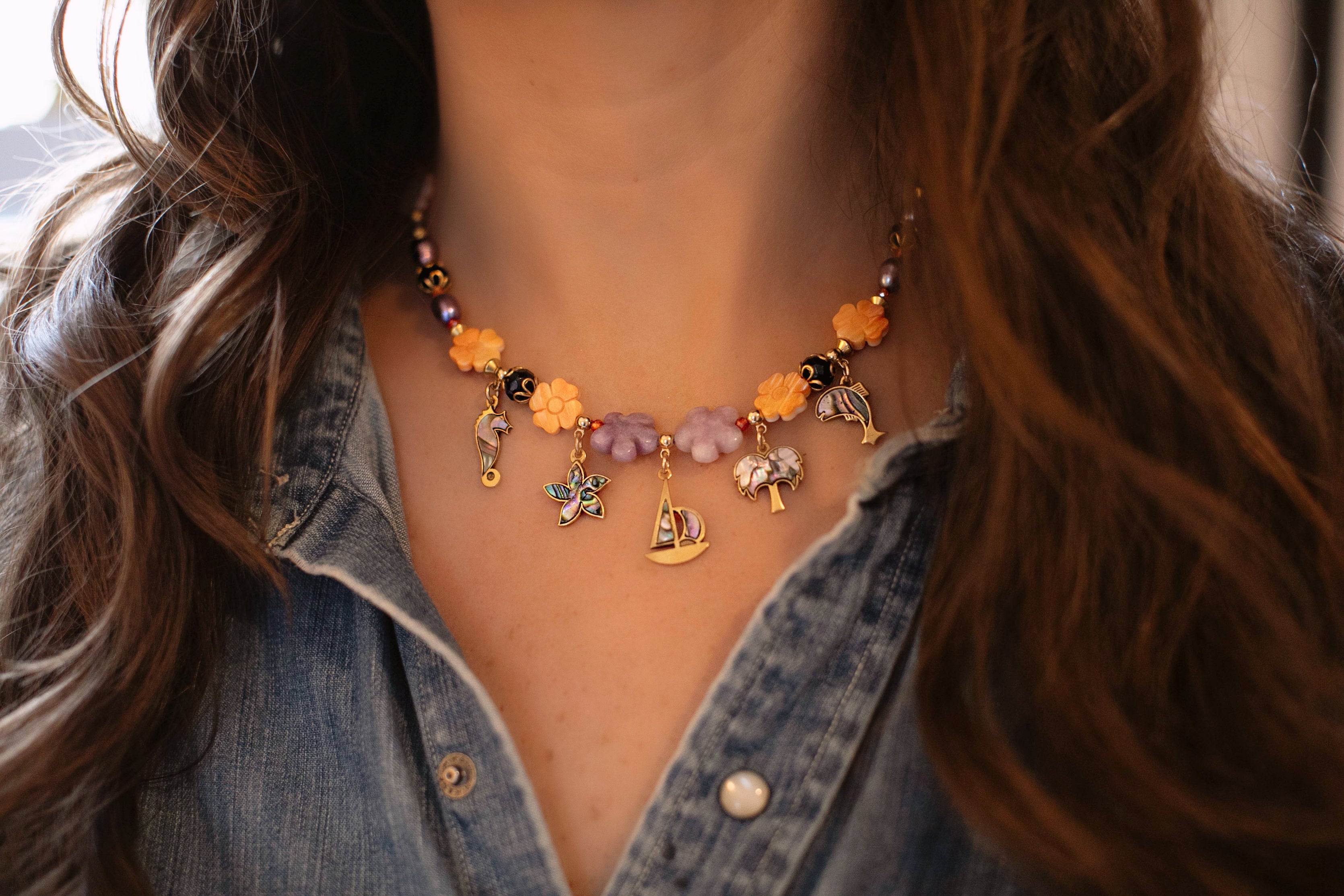 - Antique gold plated vintage Abalone inlaid charms hang from a strand of gemstone beads, shell beads and freshwater pearls
