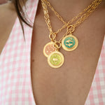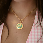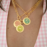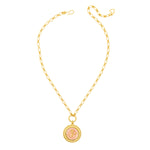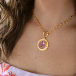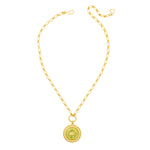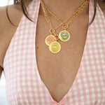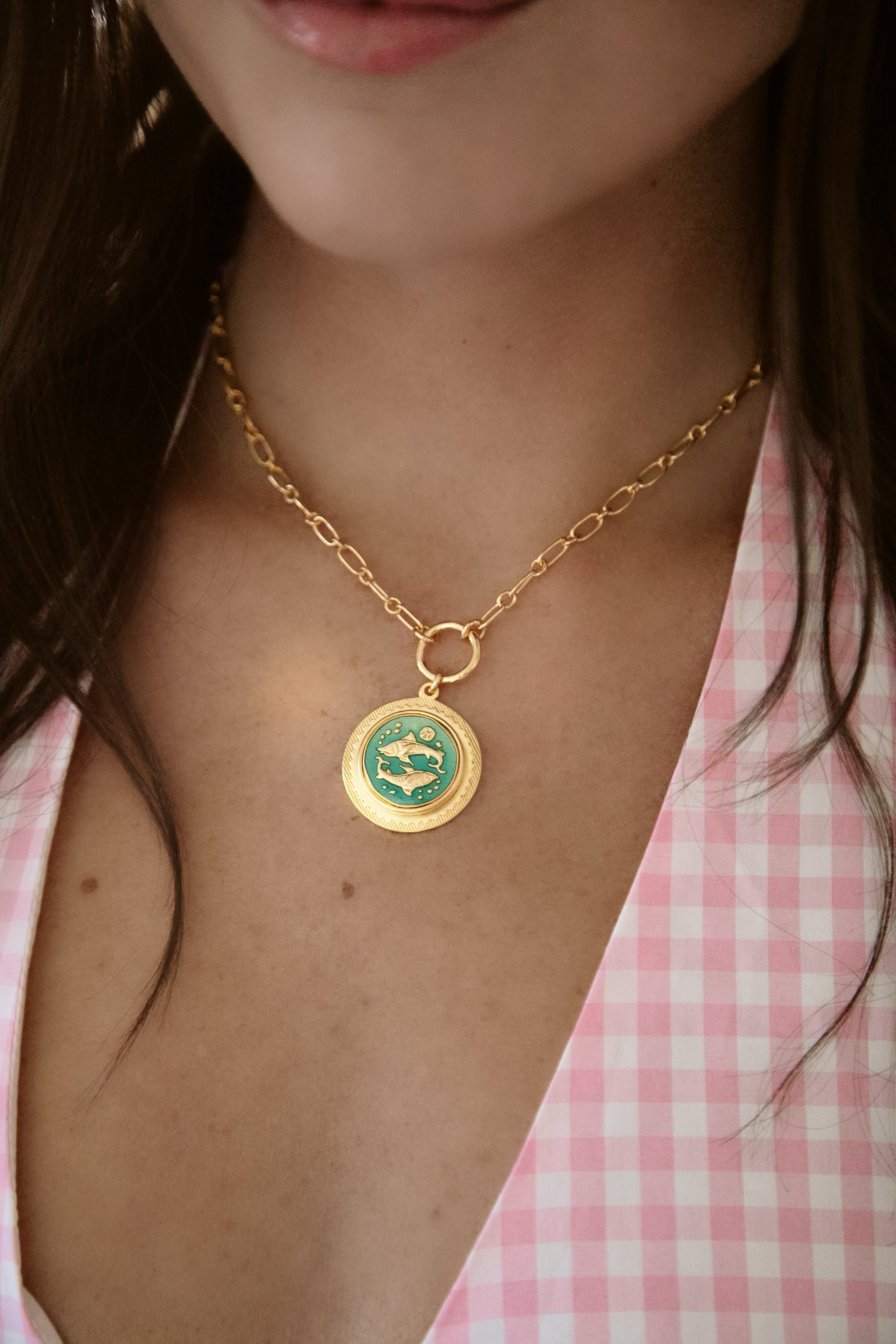 - A hand enameled zodiac pendant hangs from a 24k antique gold plated chain